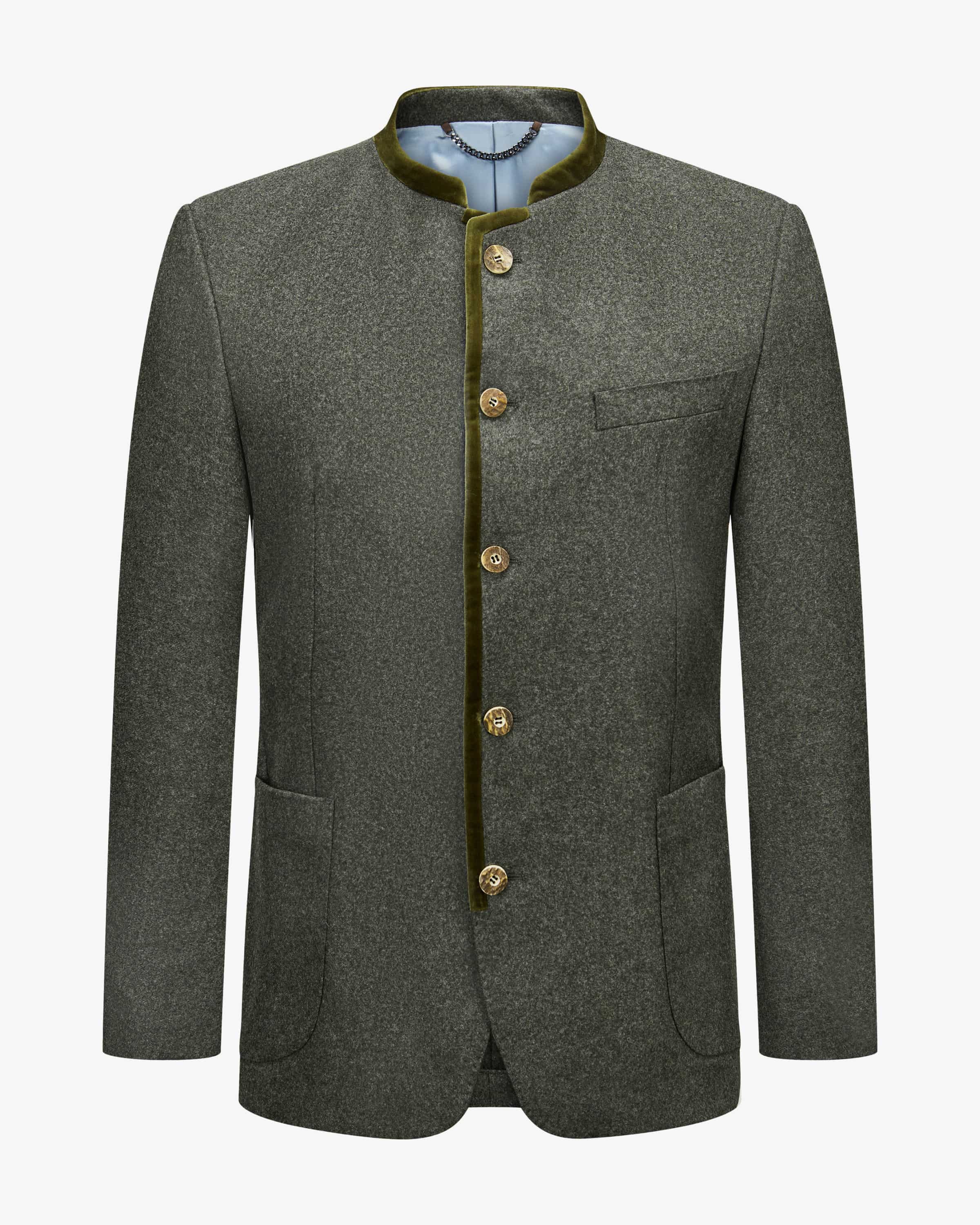 Sendling traditional jacket for men from Windsor in dark gray and olive. The model impresses thanks to the high-quality wool fabric with a pleasant feel, while soft soft velvet details and horn buttons add the finishing touches to the traditional look. the finishing touches.