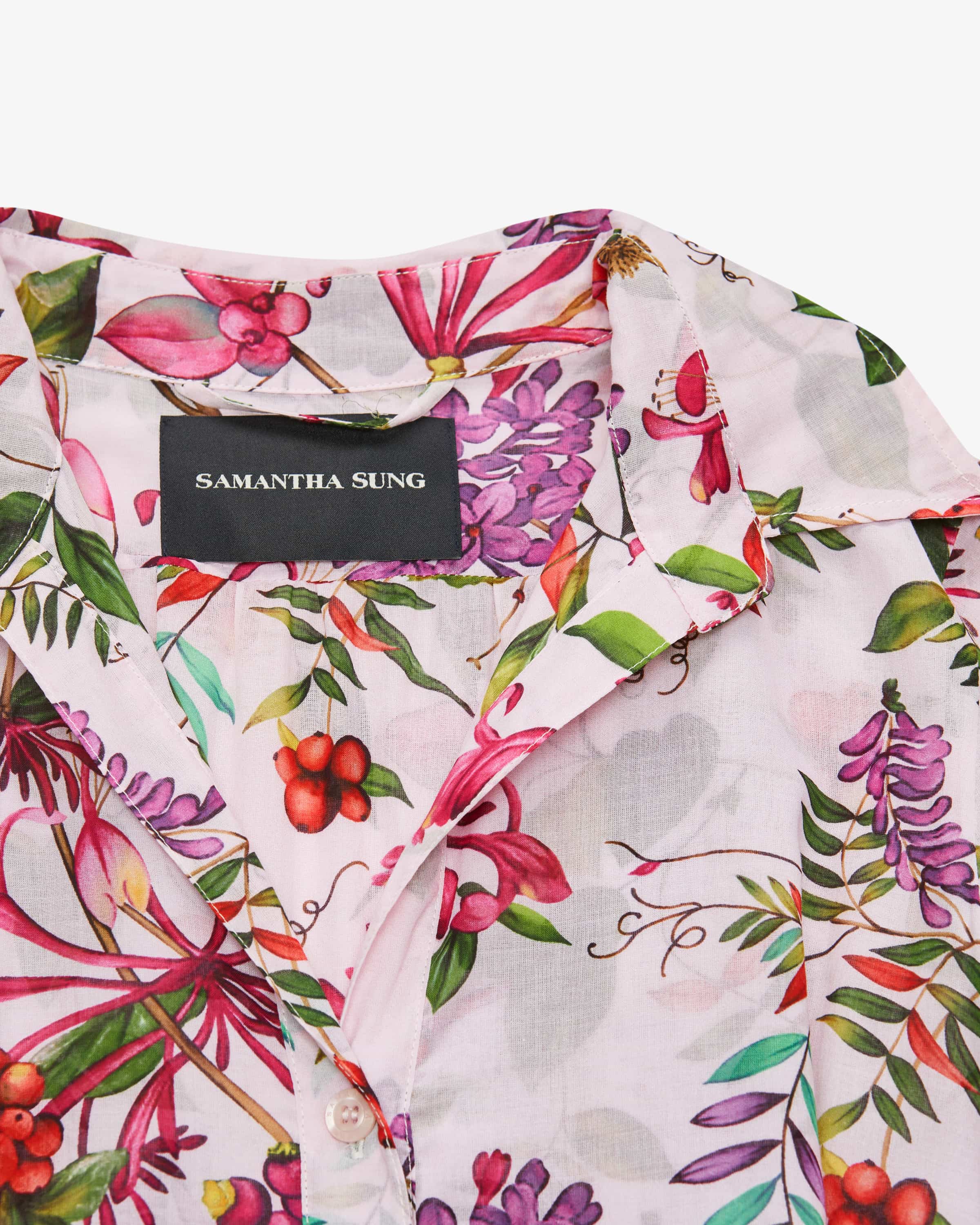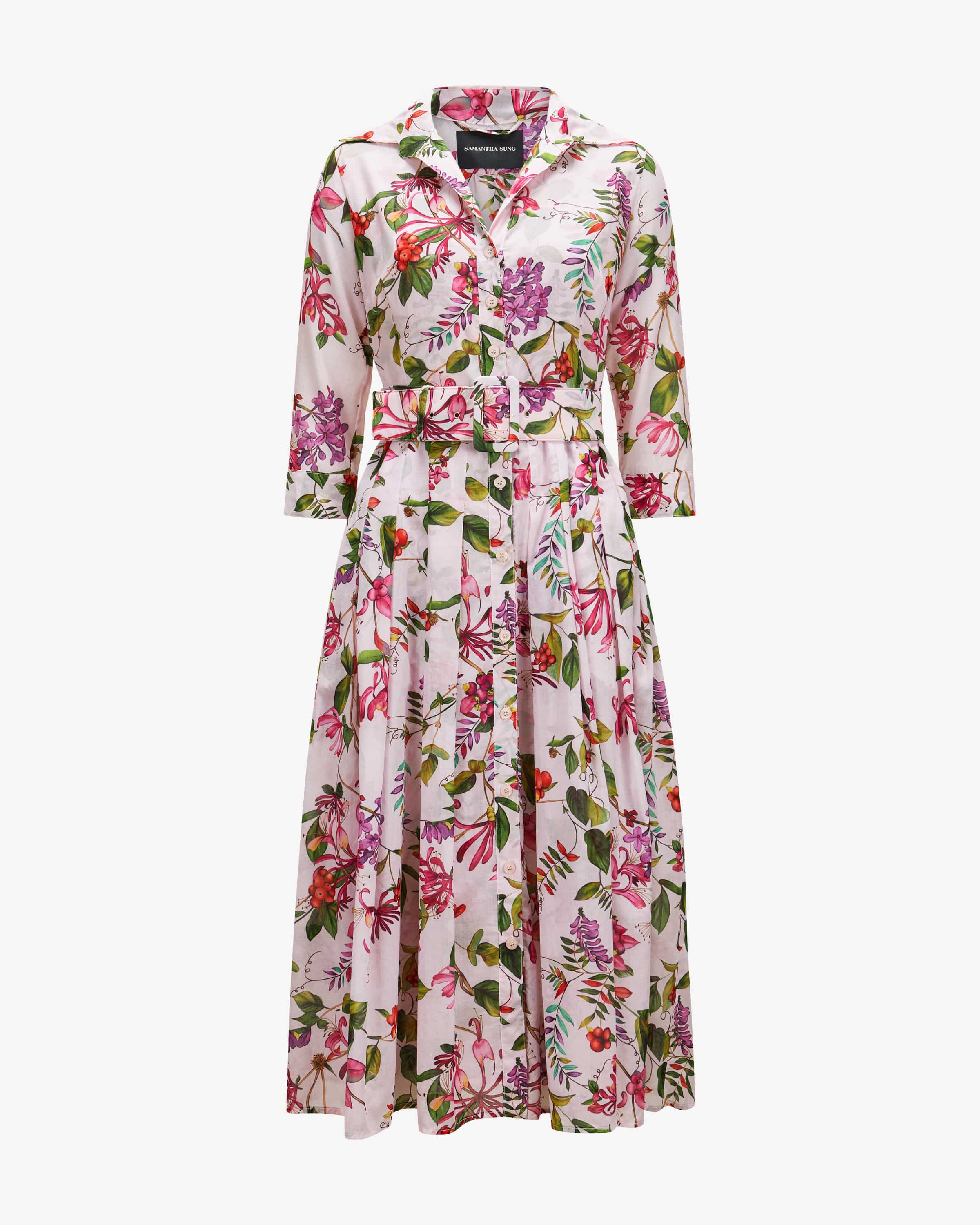 Audrey Gallerie Summer Bouquet shirt dress for women from Samantha Sung in pink, green and purple. The New York-based designer is known for her structured shirt dresses with opulent patterns and accentuated waists. This This fitted model is also a stylish favorite thanks to the all-over print with a floral pattern, while the double-layered design of the lightweight cotton fabric and the two cotton fabric and the two belt options create summery, feminine looks. looks.