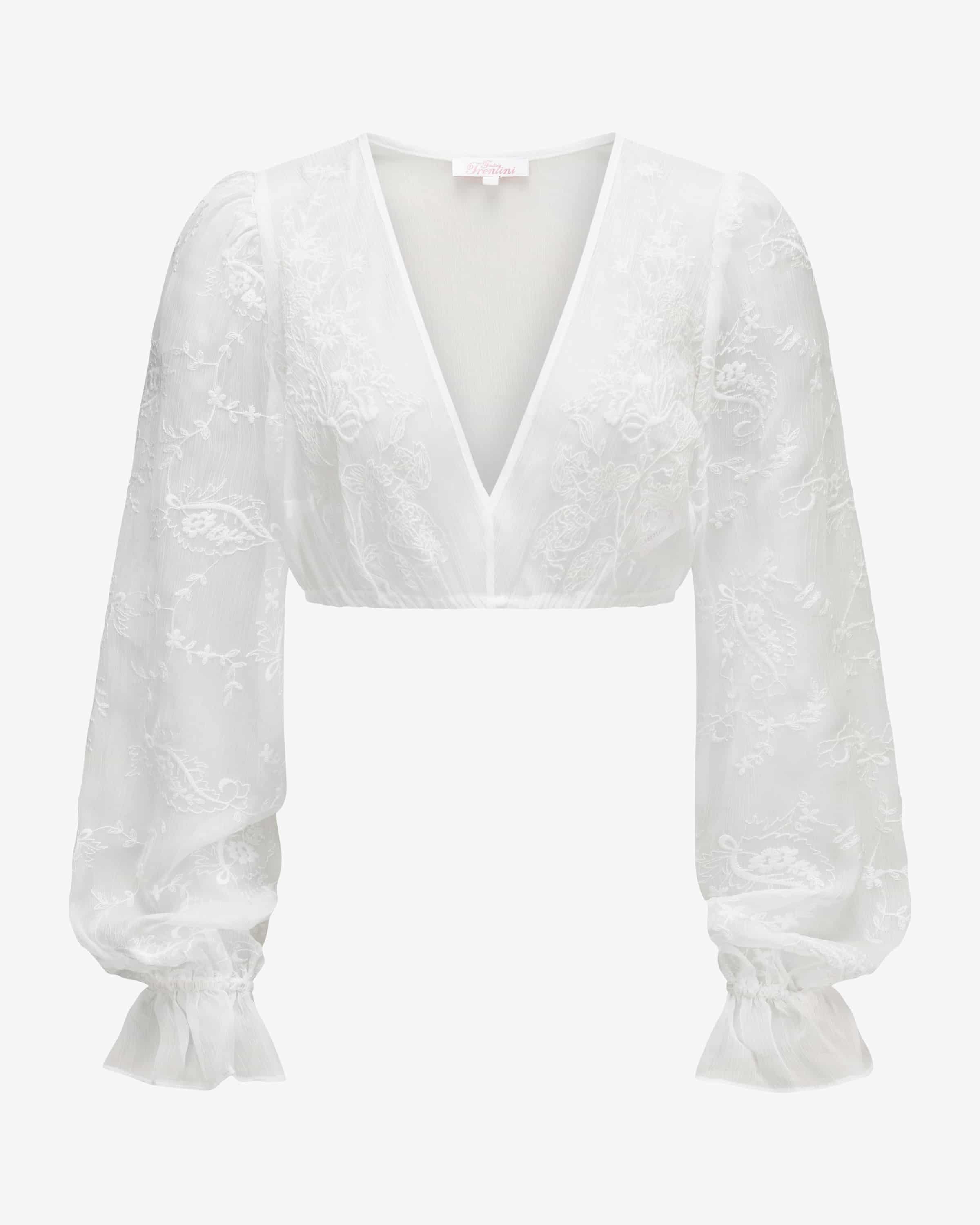 Polly dirndl blouse for women from Julia Trentini in ecru. The semi-transparent model impresses with its fine floral embroidery which, together with the ruffled details on the sleeves for a romantic traditional character.