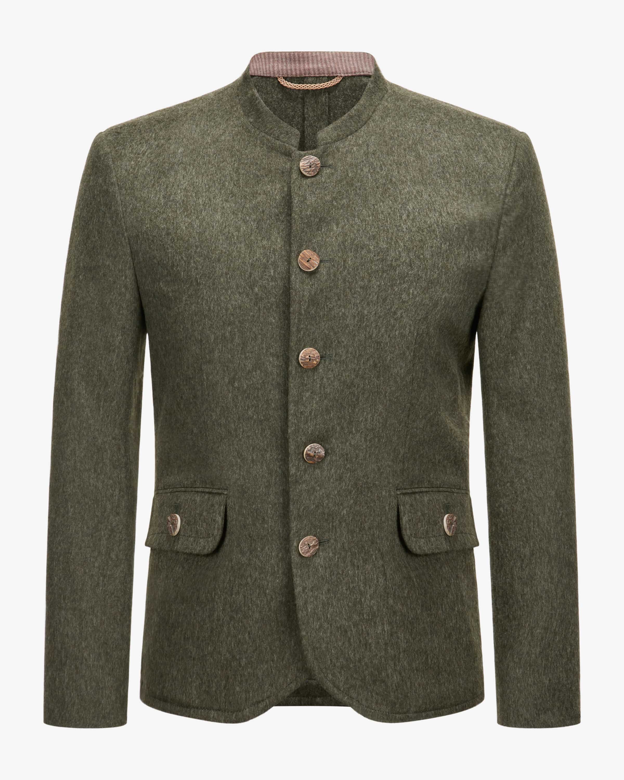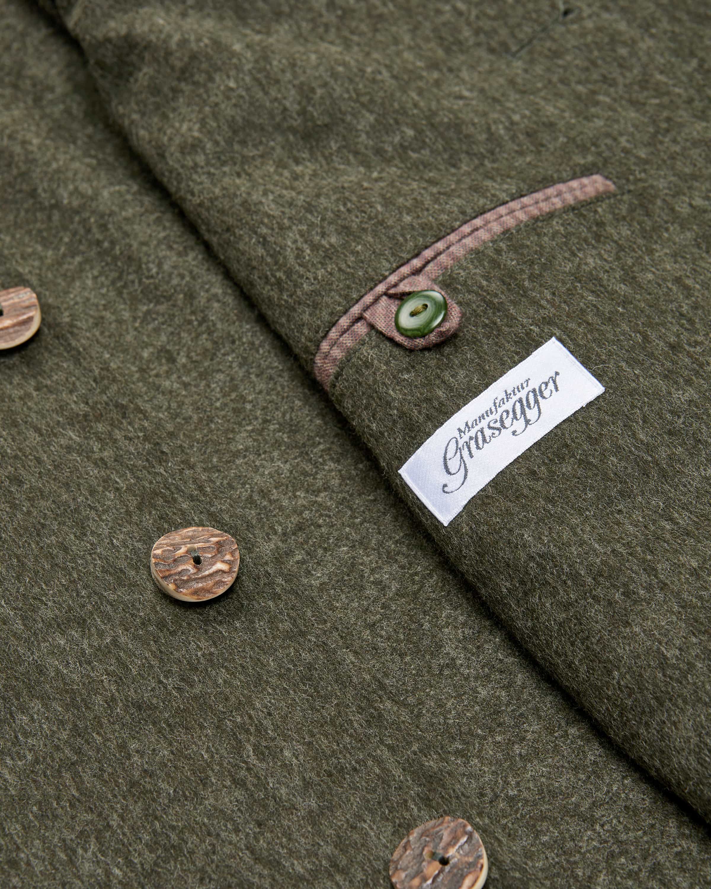 Traditional jacket for men from Grasegger Manufaktur in olive. The traditional model made of high-quality virgin wool presents itself with a simple design and stylishly rounds off any traditional outfit. At the same time, horn buttons emphasize the rustic touch.