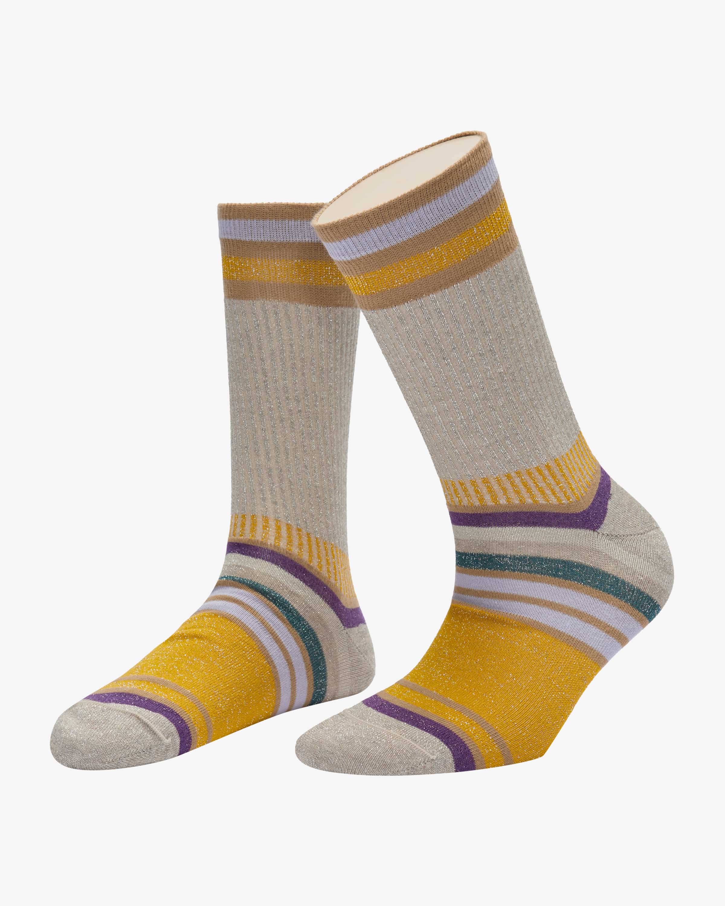 Chapo stockings for women from Alto in stone, yellow and purple. Made in Italy - Founded in 1923, the company is characterized by the combination of tradition and excellence. The sock is not just a fashion accessory, but also interprets the the style and personality of the wearer. This elasticated model also impresses thanks to its iridescent glitter fibers and striped pattern in a fashionable design.