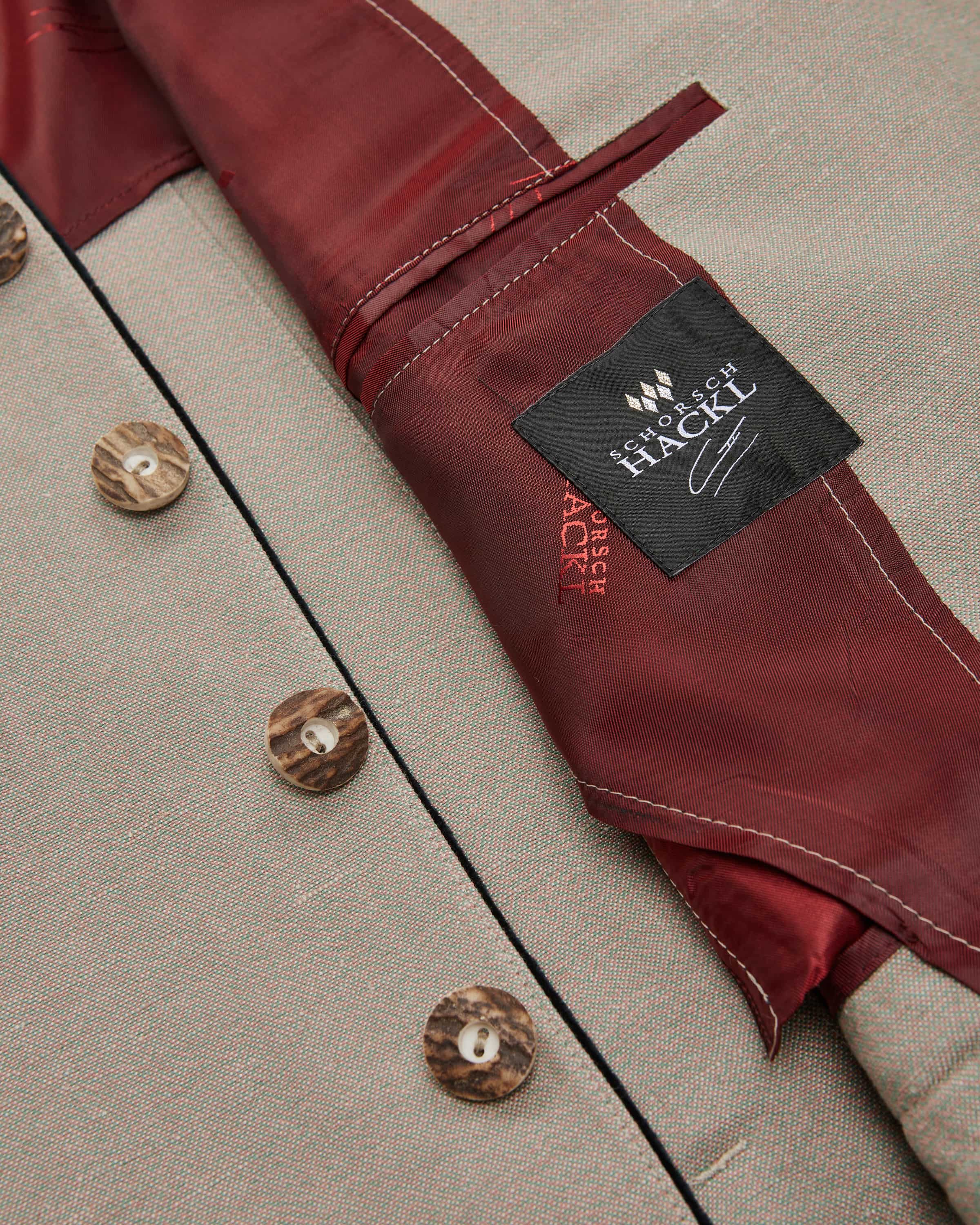 Trachten jacket for men from Schorsch Hackl in reed and navy. The model impresses thanks to the high-quality linen-cotton blend in a traditional look. Buttons made from fine staghorn lend a rustic touch, while a light shoulder padding and a box pleat complete the classic silhouette.