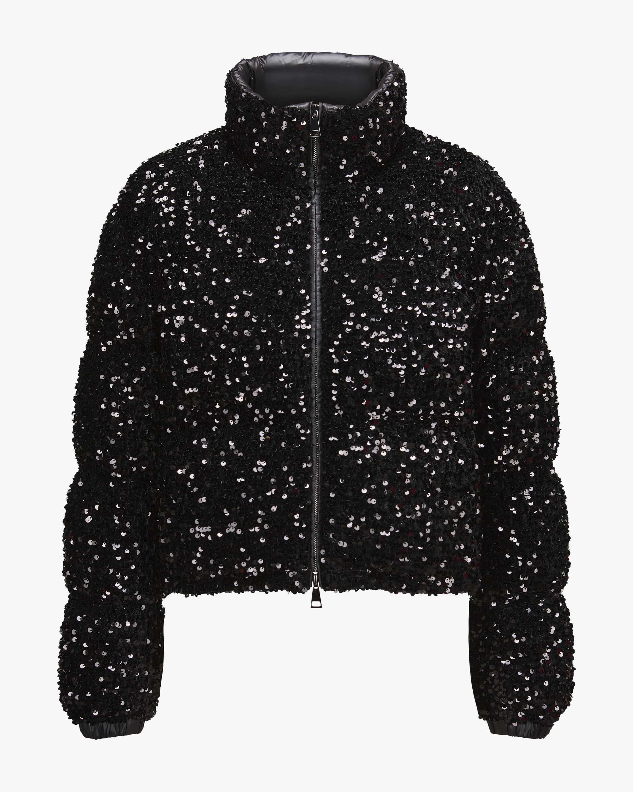 Louvi sequin down jacket for women from Moncler in black. The Italian label is down jackets, the Italian label is known worldwide. This model in a bomber jacket silhouette also promises optimum thermal insulation thanks to the high-quality down insulation thanks to the high-quality down filling, while the iridescent sequin design lends it a feminine character and makes it a winter eye-catcher. advances.