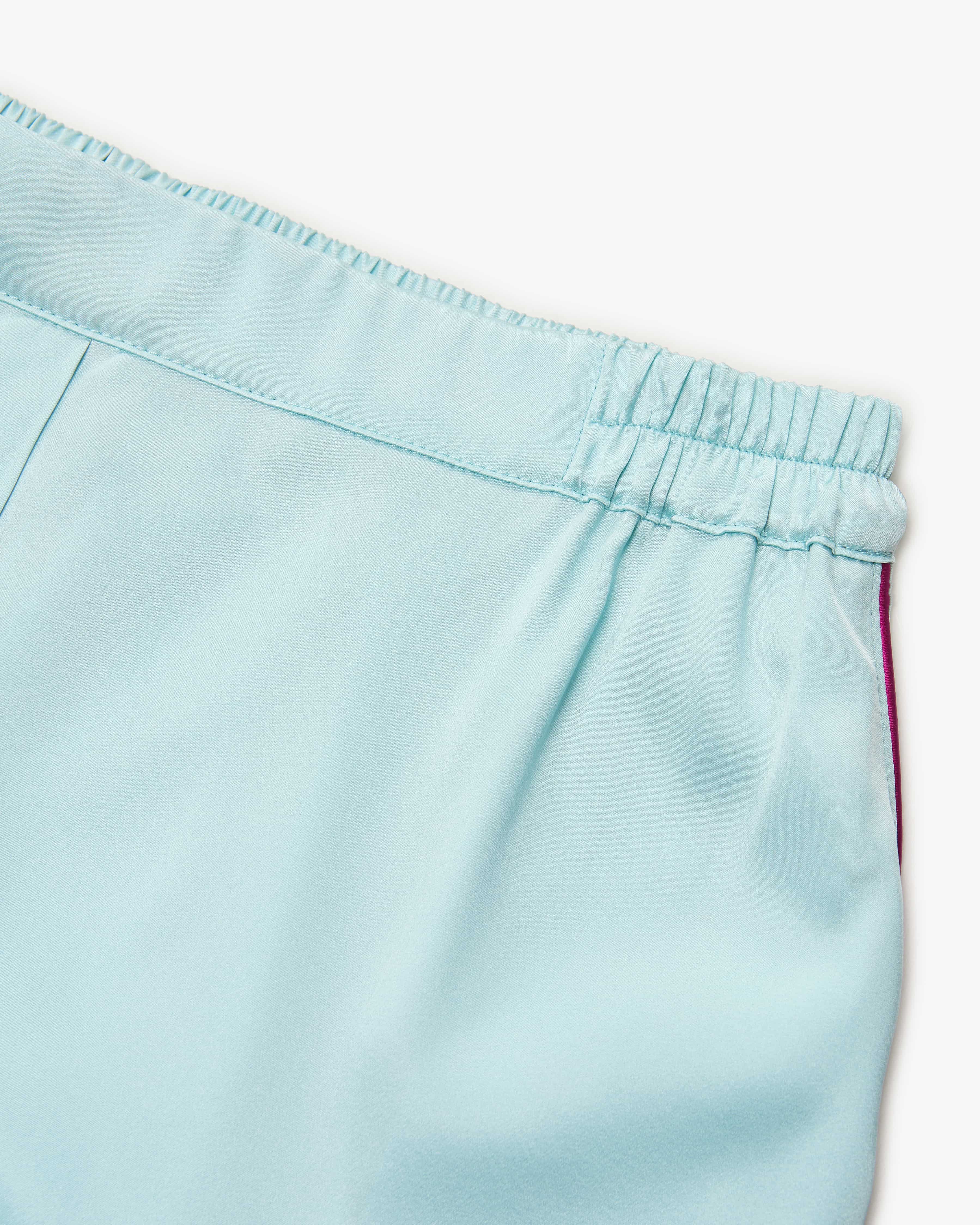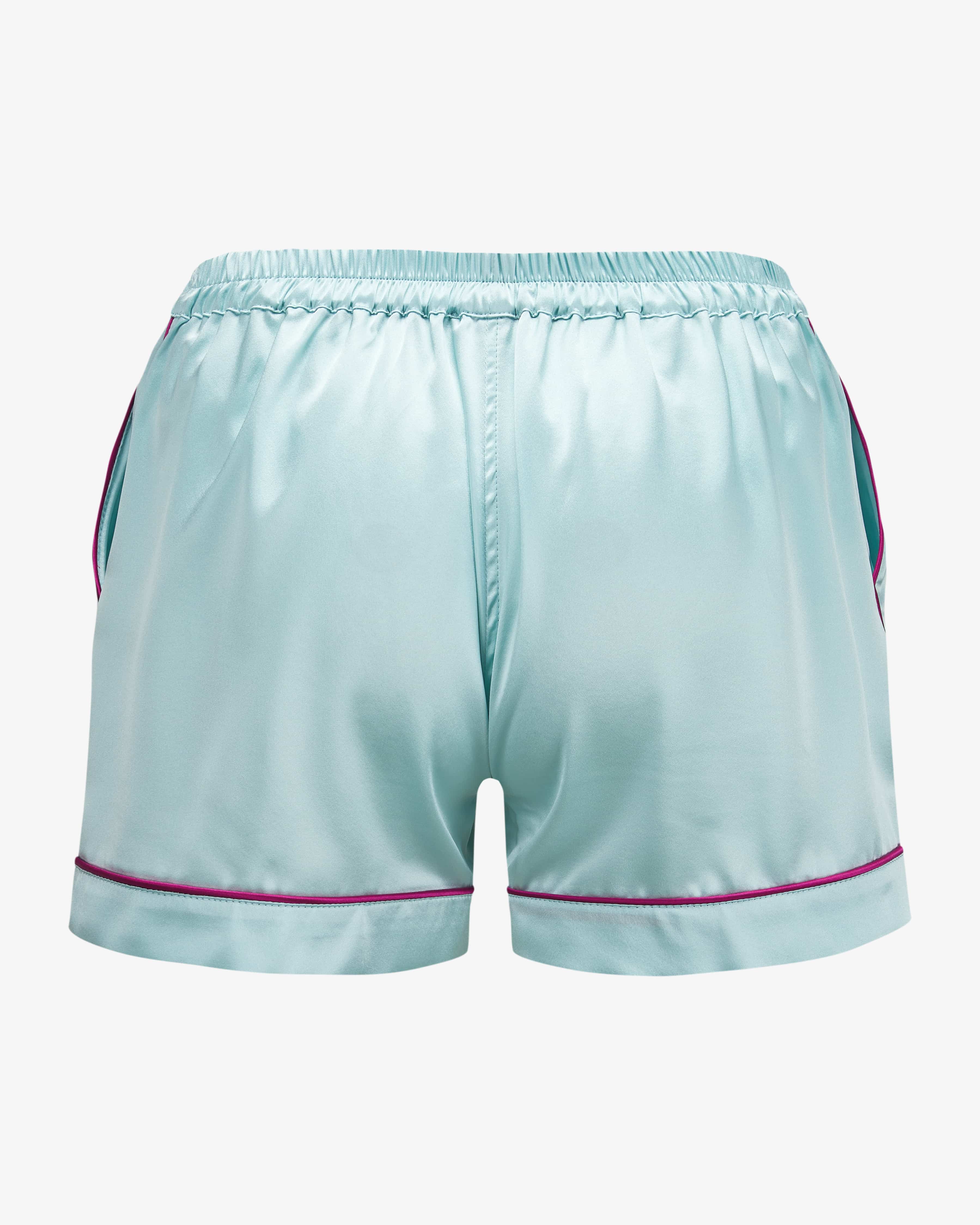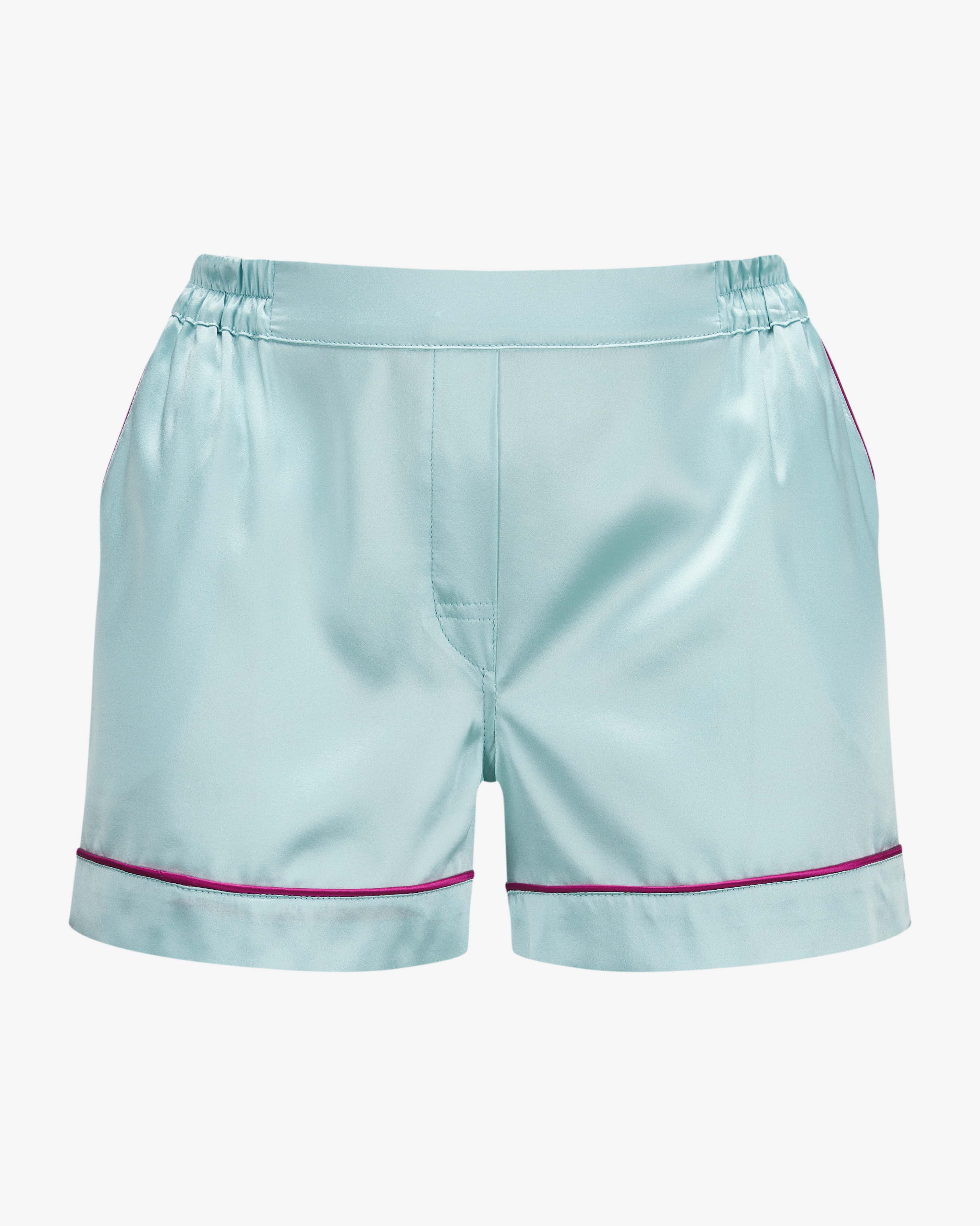 Henry silk pyjama shorts for women by biscuits. luxury essentials in light blue and pink. The Munich label combines luxurious silk fashion with a modern lifestyle and a relaxed and a relaxed attitude to life - stylishly designed in Munich for self-confident women. This This model also impresses with its flowing silk blend with elastane, which guarantees a comfortable feel. Whether as stylish loungewear or luxurious nightwear - the model with model with contrasting piping is versatile and can be wearable, even in combination with the matching top.