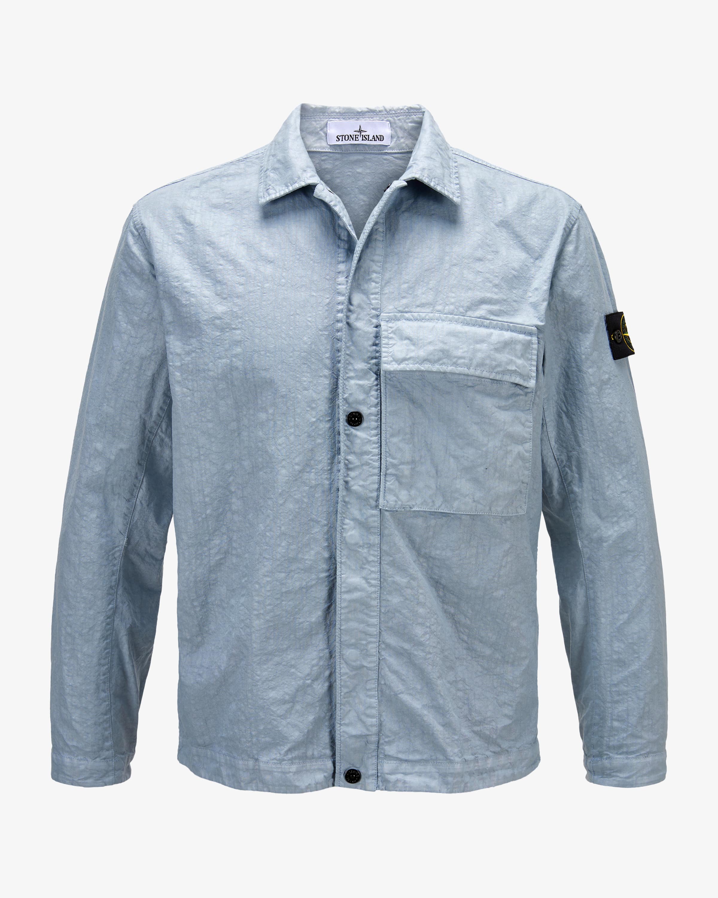 Overshirt for men from Stone Island in light blue. The Italian brand combines functional textiles with streetwear aesthetics - cult status thanks to research and innovation. This model has a fashionable crinkled look look, while the striking breast pocket and press studs give it a casual character. character. The typical label badge characteristically rounds off the look. round off the look.
