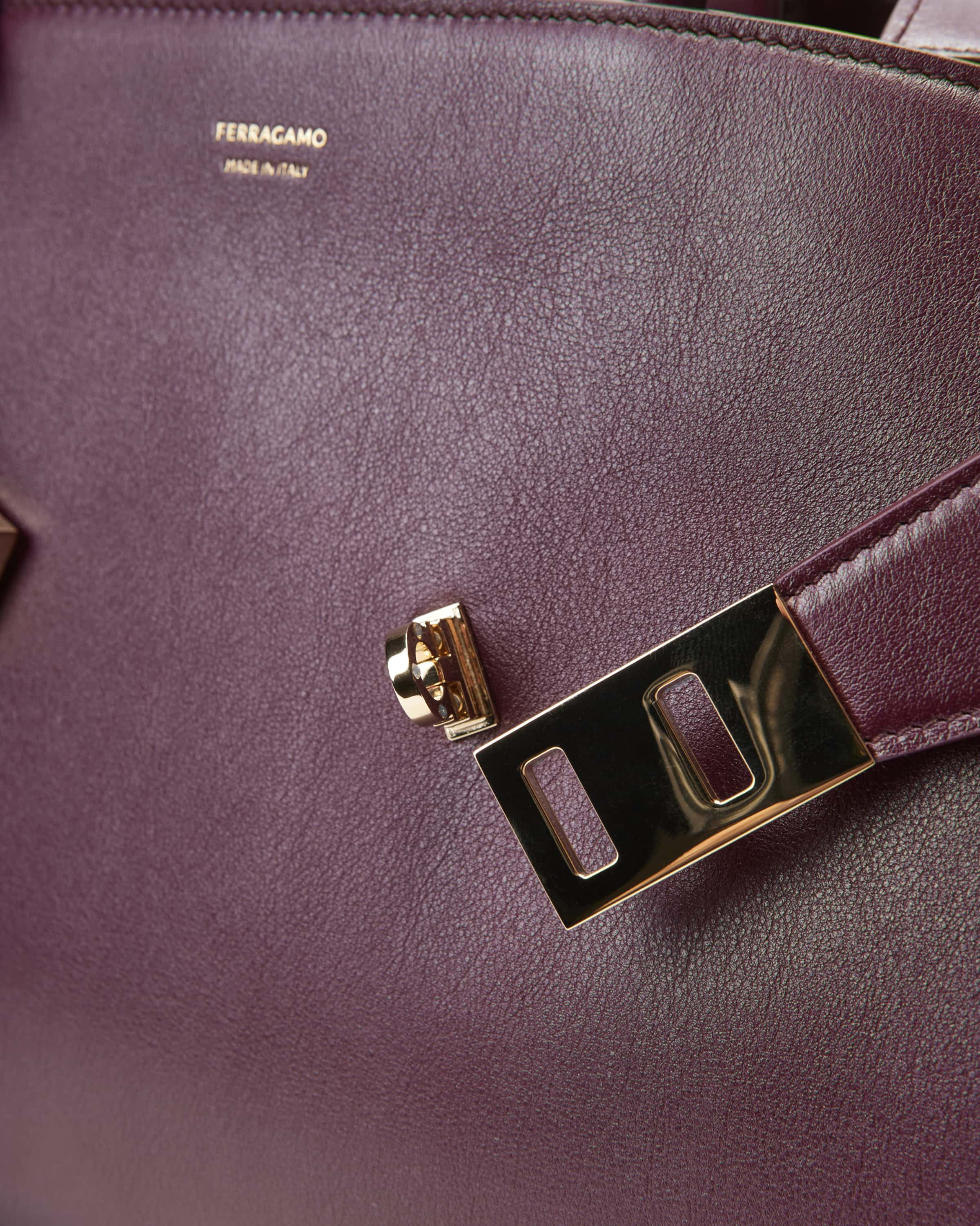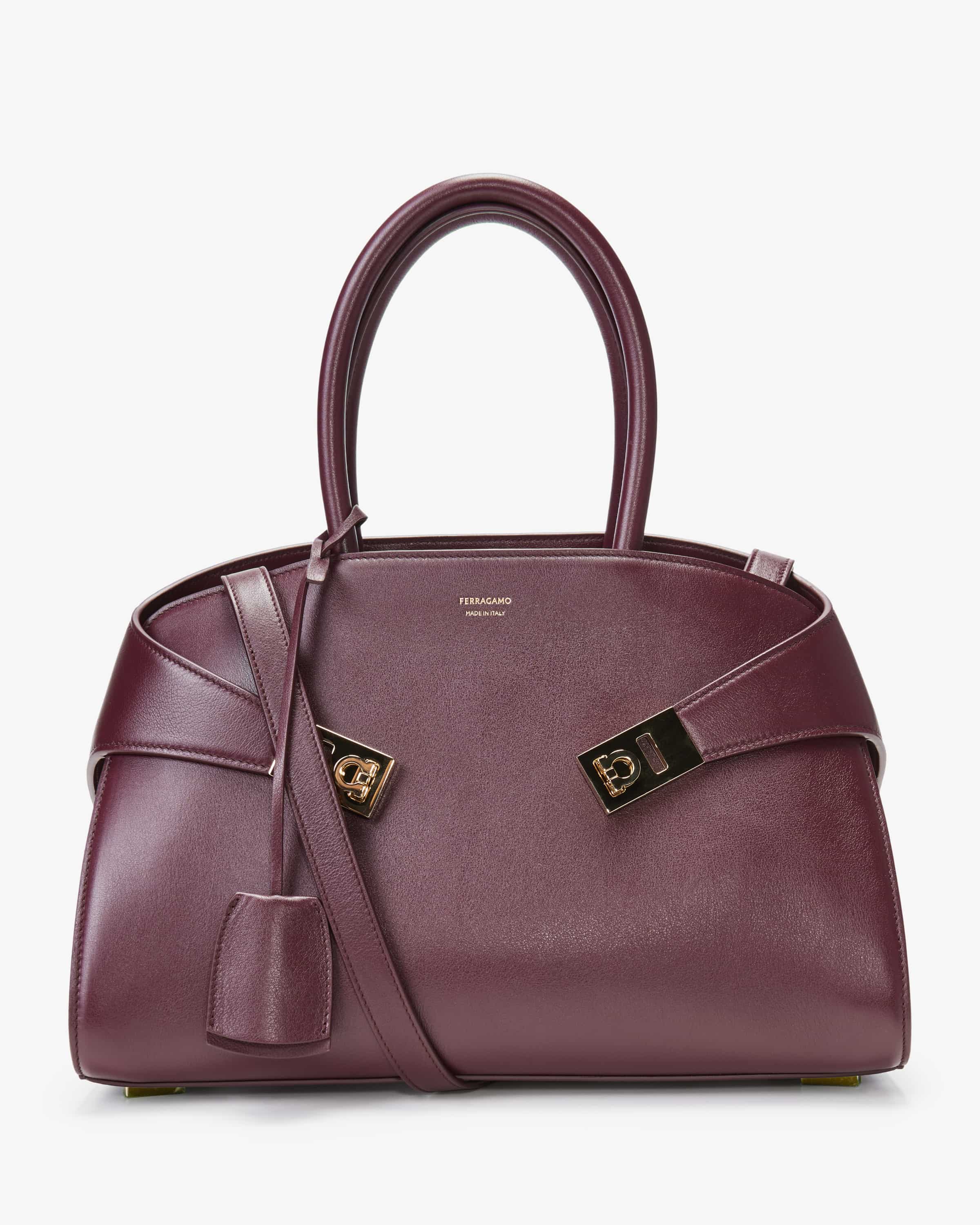 Hug handle bag for women from Ferragamo in eggplant. The fashion house stands for glamor and luxury. The crossed straps with a sophisticated twist lock give the bag that certain something, while the high-quality calfskin with contrasting inside elegantly underlines the overall look. The detachable shoulder strap also ensures versatile carrying options.