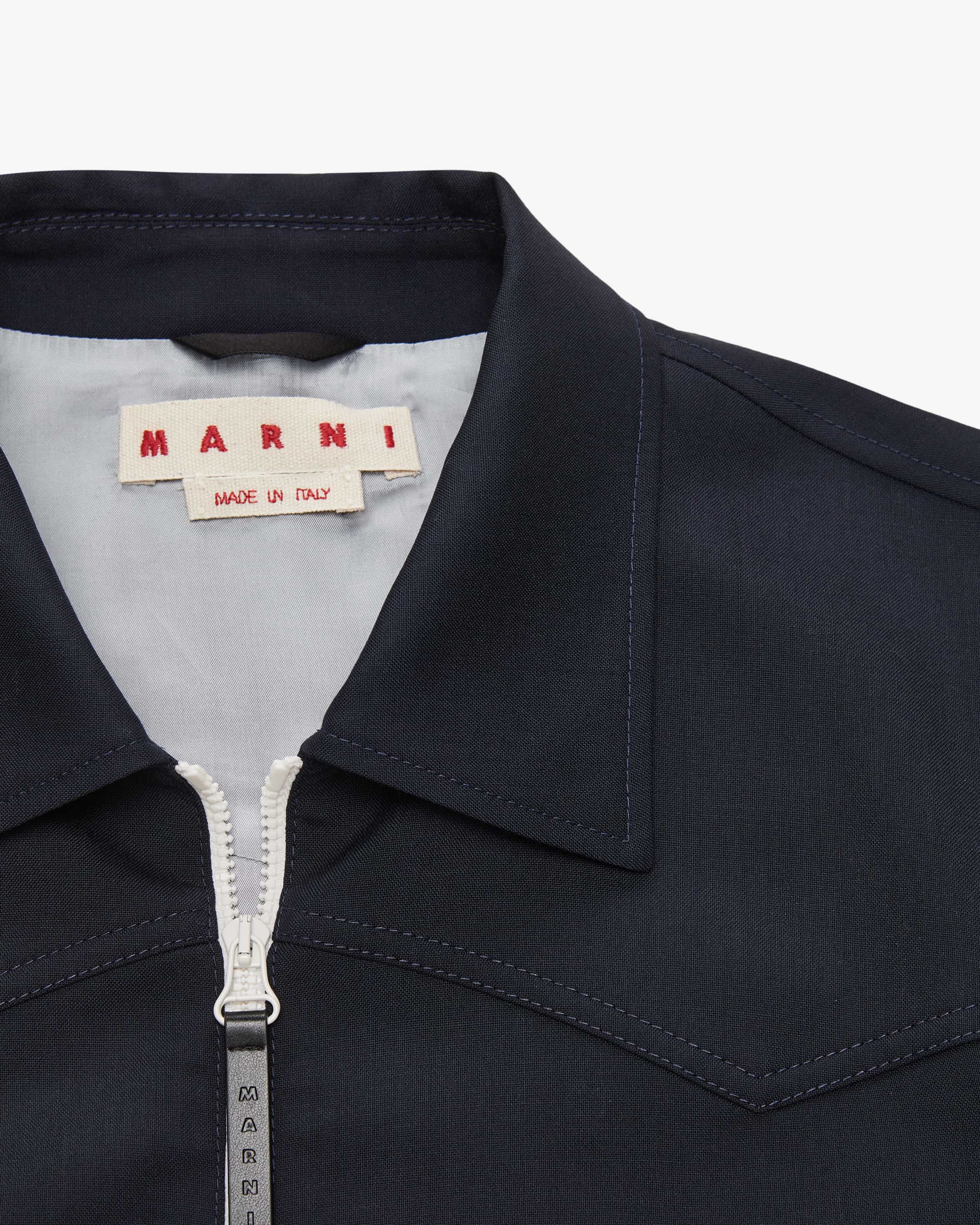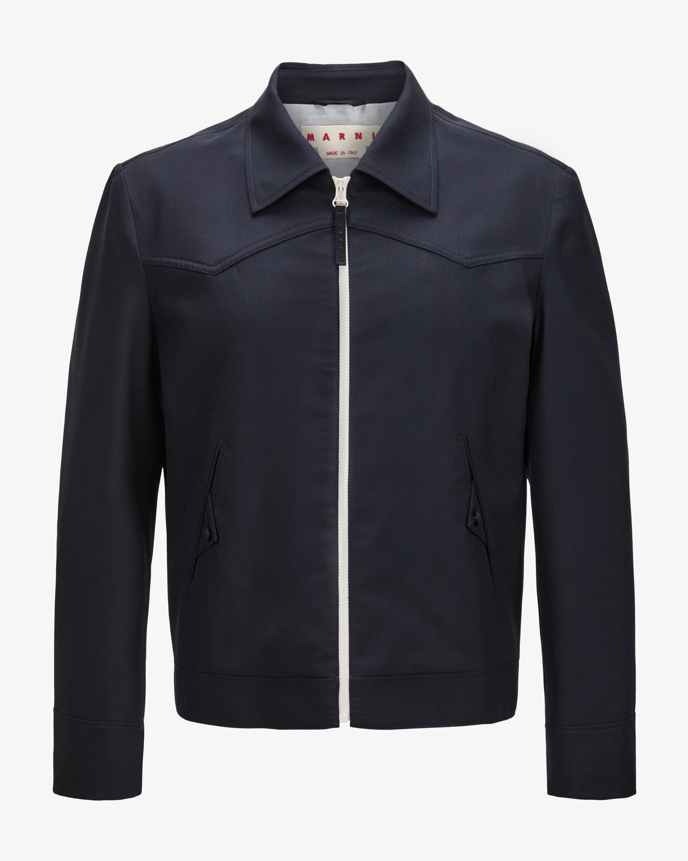 Jacket for men from Marni in navy. The Milanese fashion house with maximalist with color, print & experimentation as a stylistic device. Made from lightweight wool, this sporty, masculine transitional jacket impresses with its durable quality quality, while the loose cut guarantees a comfortable fit.