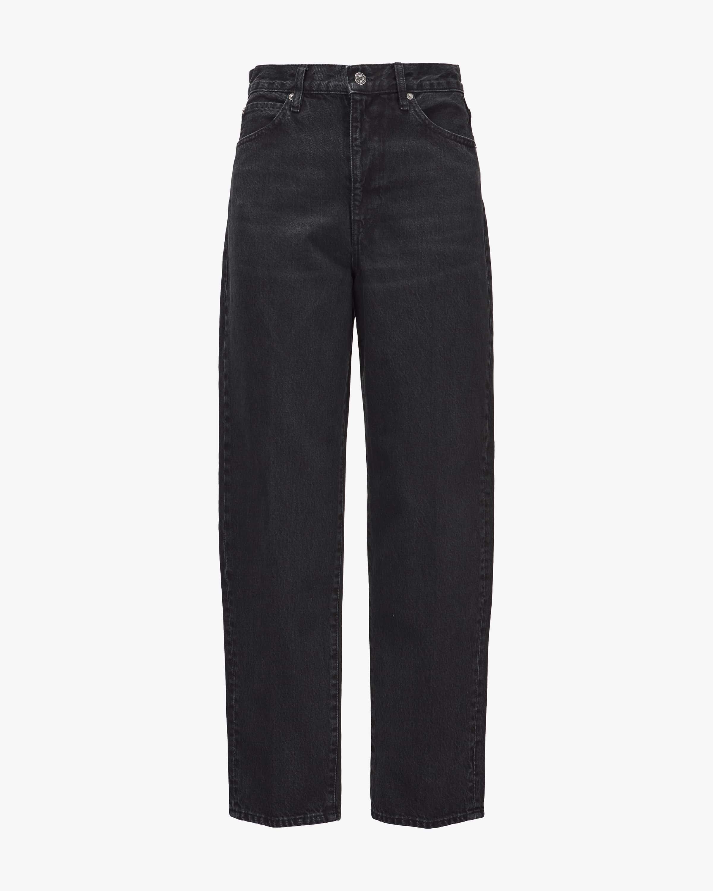 The Neat High Rise Tapered jeans for women from Frame in black. While the model has a fashionable vintage character thanks to the robust denim quality and the washed vintage character, the wide silhouette with tapered legs creates a casual everyday leg creates a casual everyday favorite.