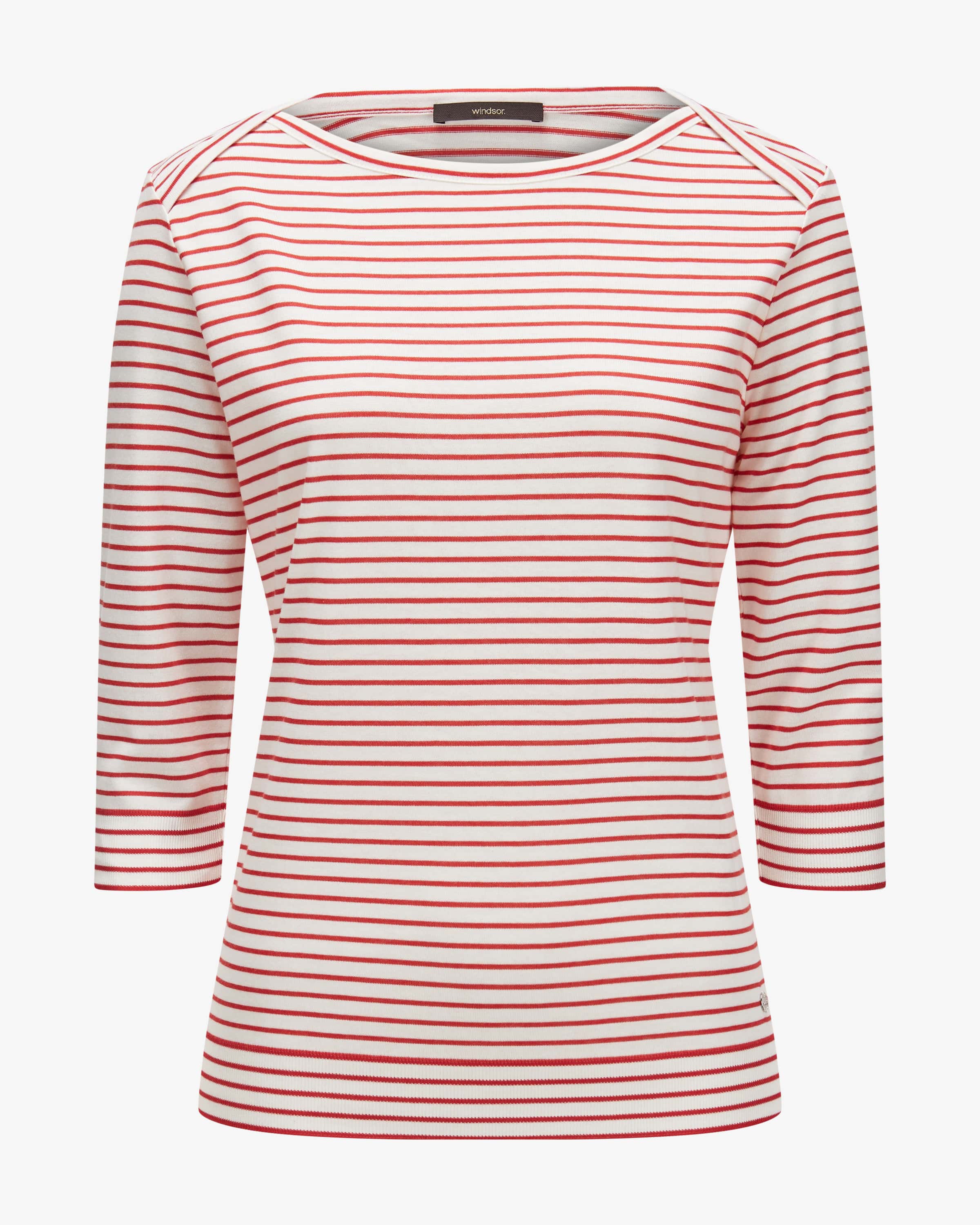 Longsleeve for women from Windsor in red and white. The striped model is characterized is particularly characterized by the combination of lyocell and cotton, which, thanks to the fine knit quality with a pleasantly soft feel. At the same time, the overlapping shoulder section adds a special accent.