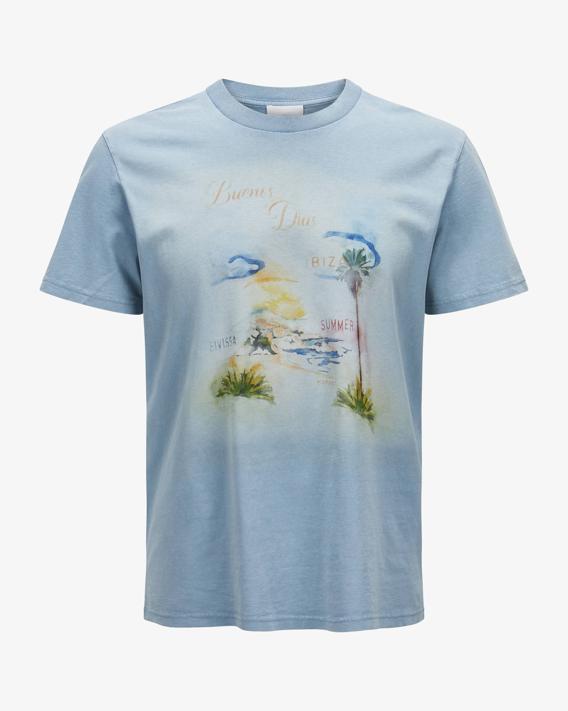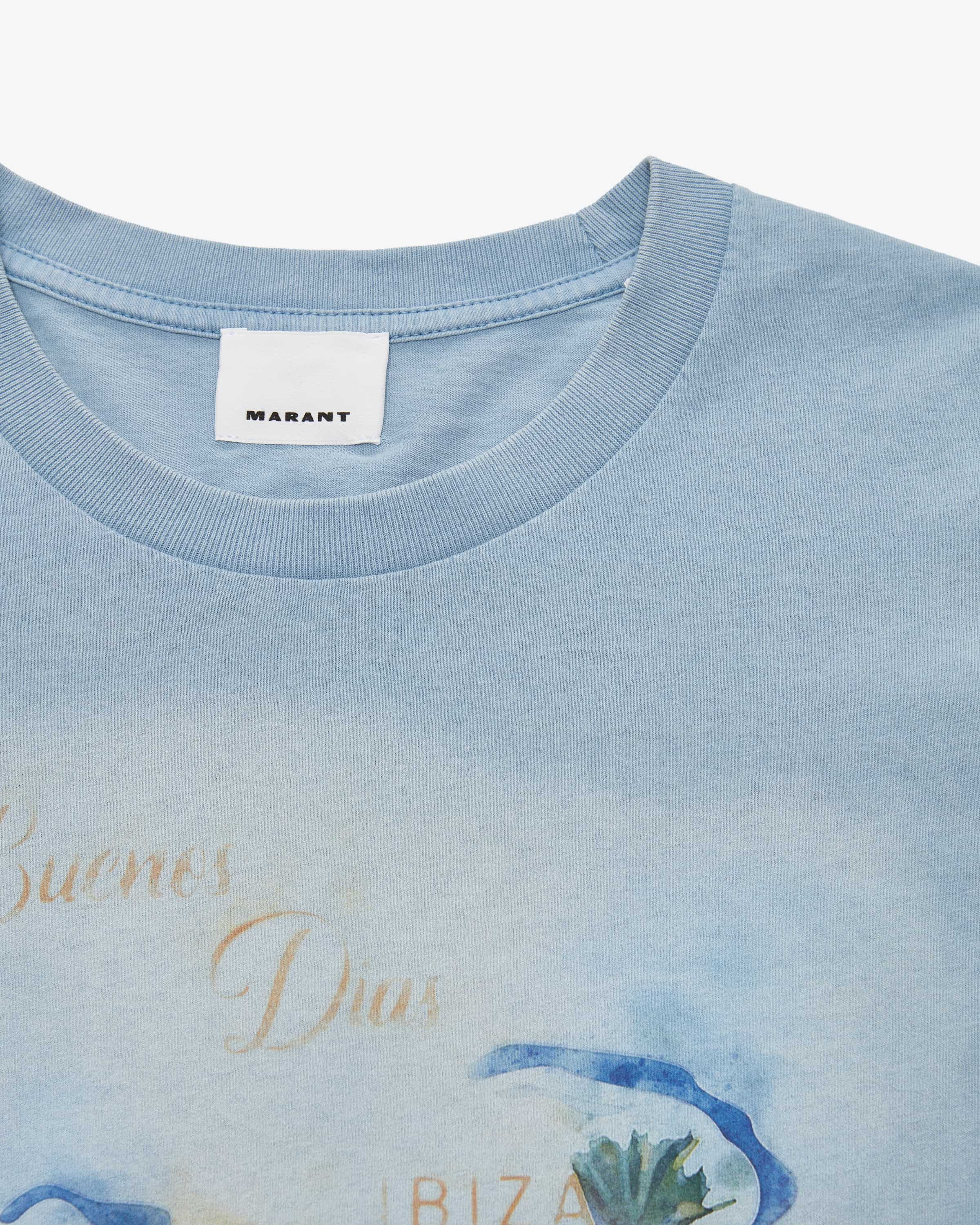 T-shirt for men by Isabel Marant in light blue and multicolored. The label stands for casual Parisian elegance with a bohemian influence. This model in classic jersey fabric is a fashionable basic thanks to its casual cut, which is given a summery character by the colorful watercolor print with an Ibiza motif. character.