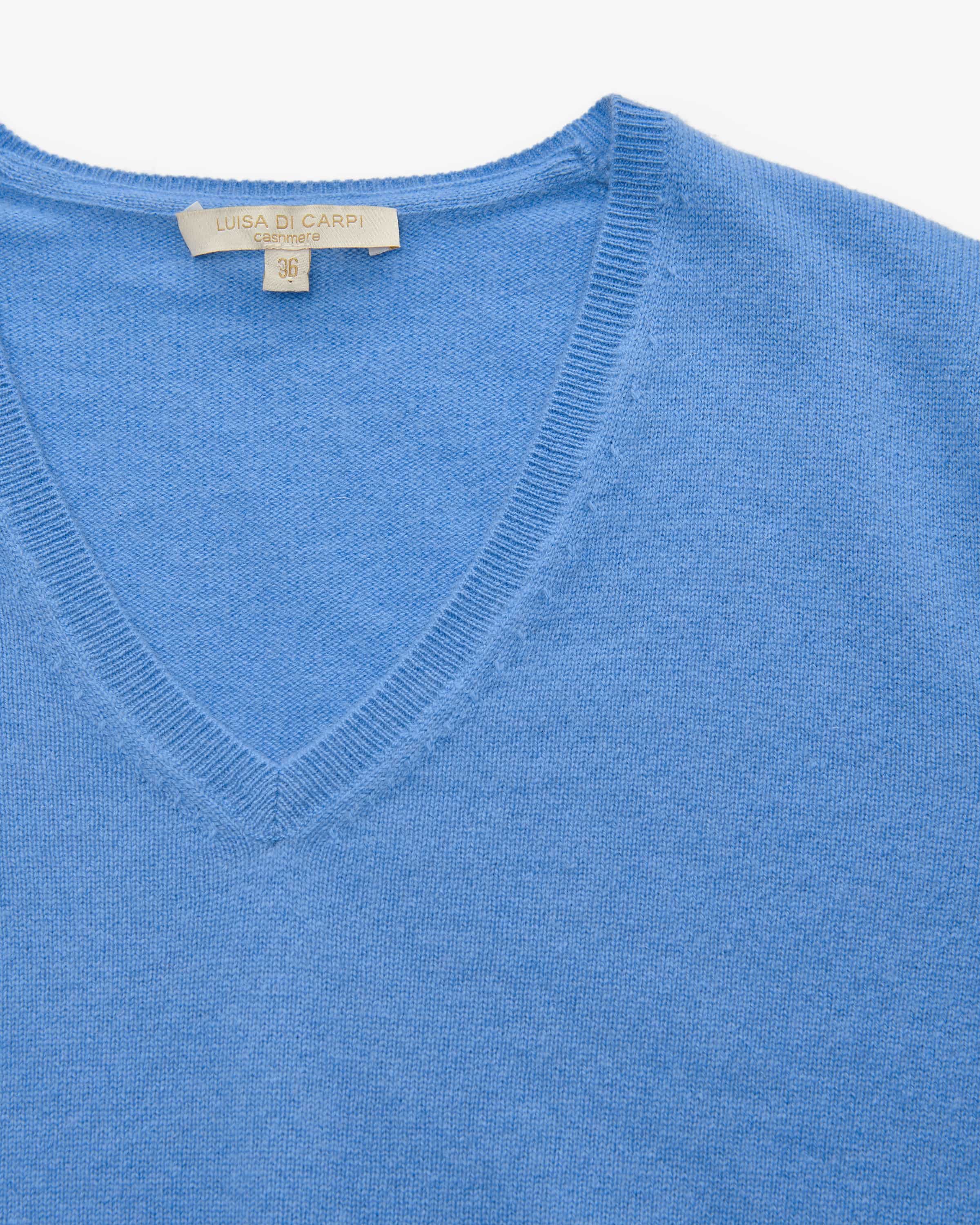 Cashmere sweater for women from Luisa Di Carpi in azure. Thanks to the fine quality knit and the use of high-quality cashmere wool, this model is soft to the touch model has a soft feel that makes it particularly comfortable to wear. At the same time, classic details harmoniously round off the overall look.