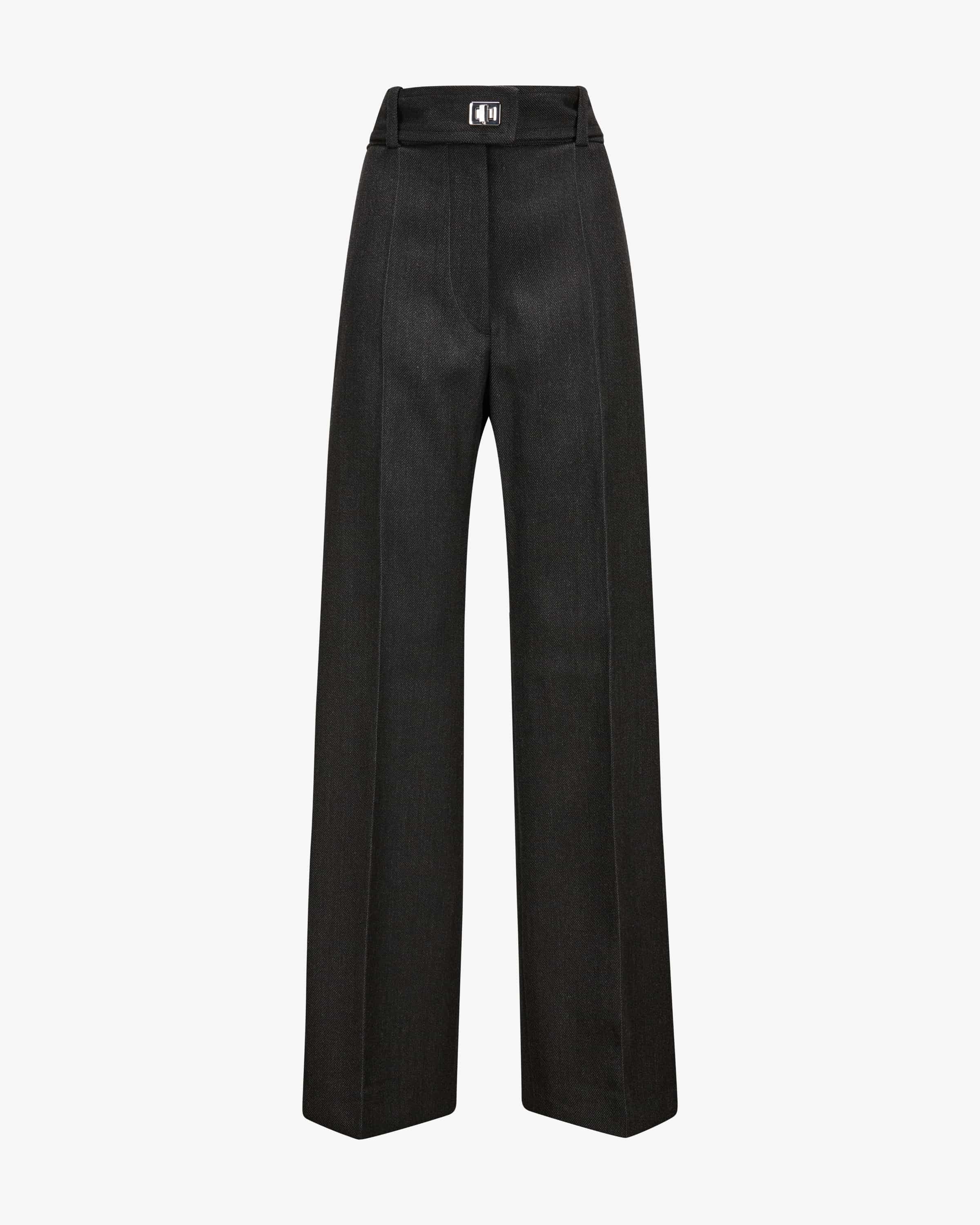 Flared tailored trousers for women from Patou in anthracite. The model impresses with robust virgin wool quality and wide cut, this model is a casual favorite for your your wardrobe, while elegant details such as the integrated belt with an belt with an original fastening create a stylish casual-chic style.