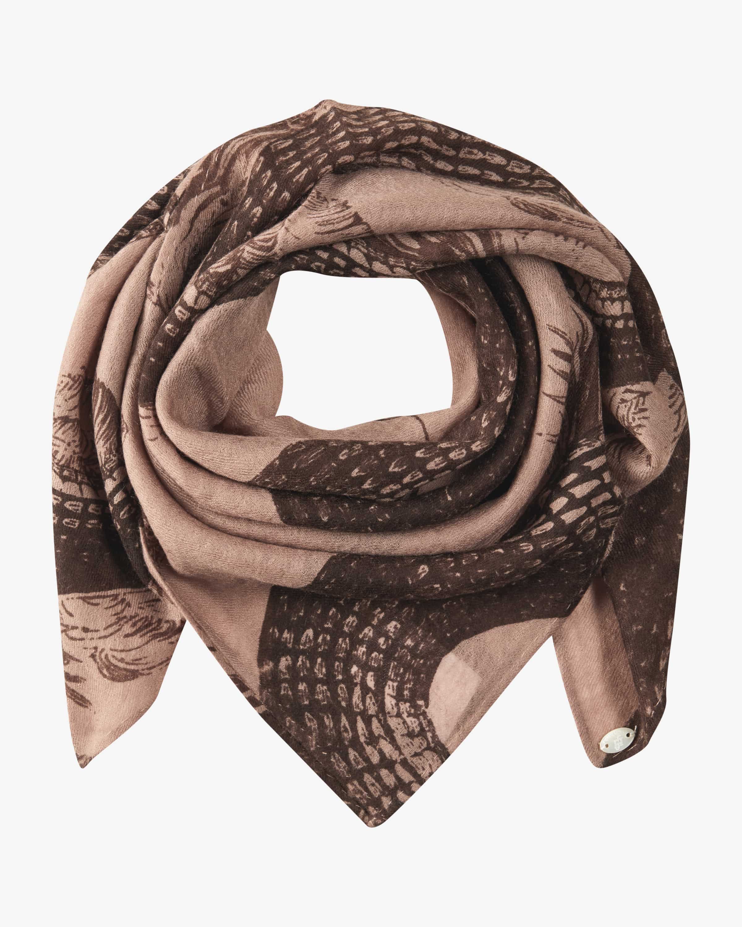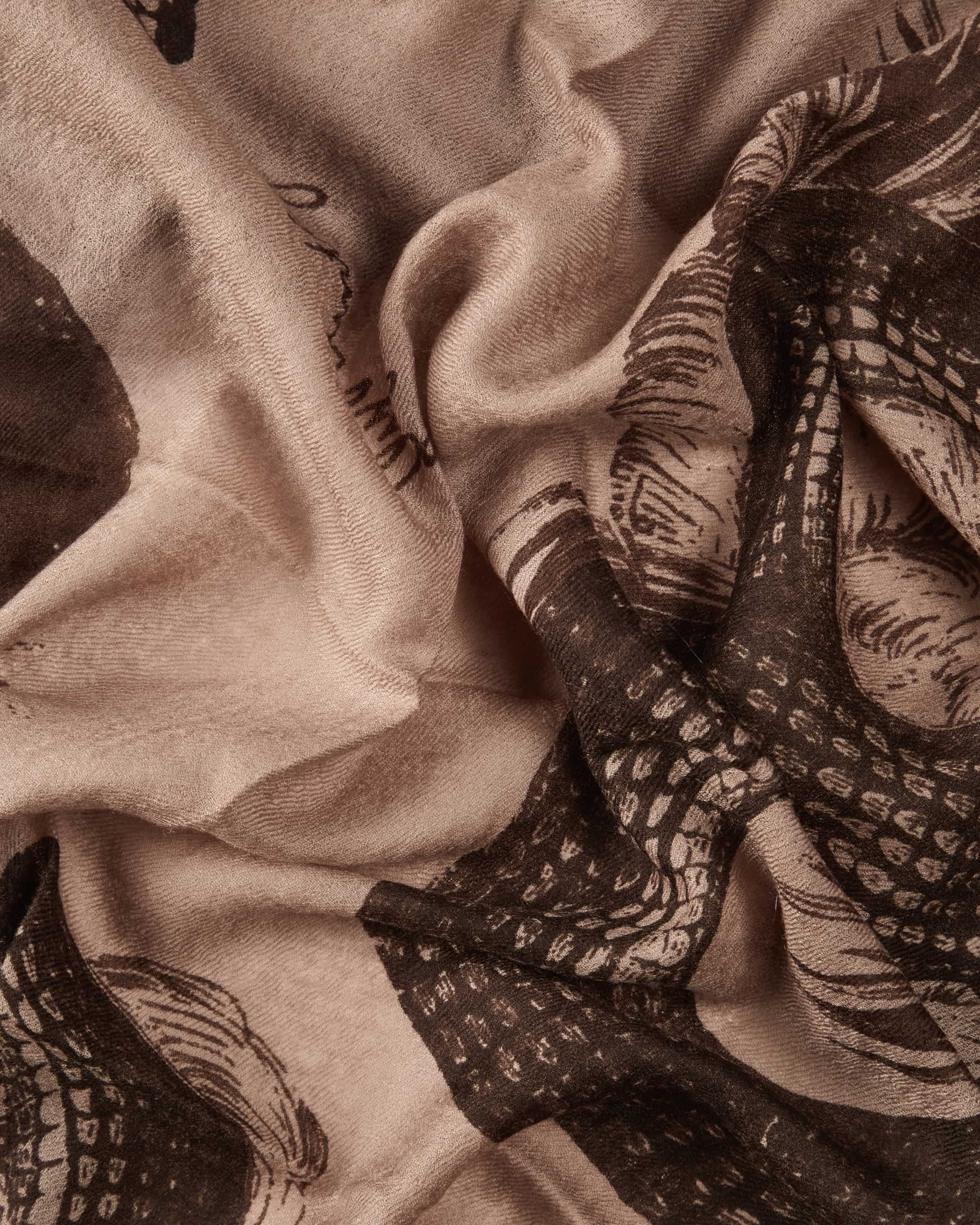Cashmere scarf for women from Friendly Hunting in light brown and brown. The German brand combines sustainable materials and luxurious craftsmanship. Made from handmade from high-quality cashmere wool, the lightweight model impresses with its particularly soft feel. The characteristic all-over pattern with a snake motif motif adds that certain something.
