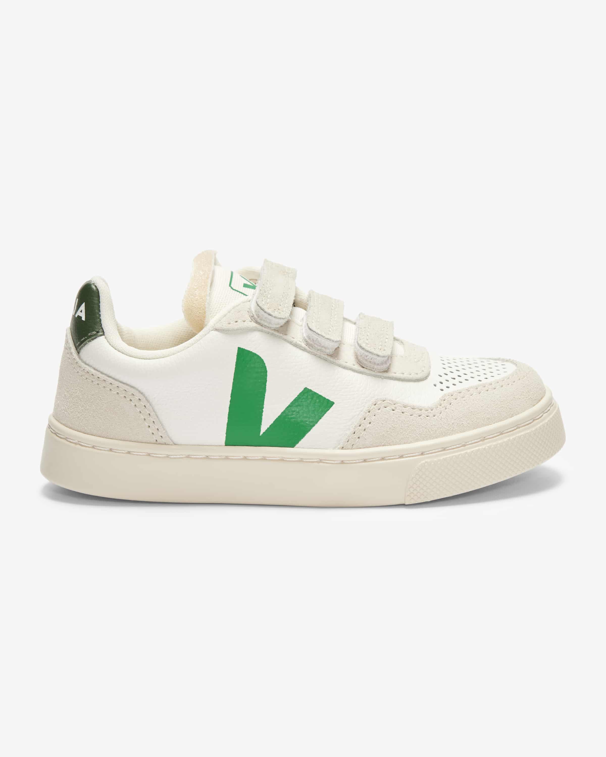 V-10 sneakers for children from Veja in white, light gray and green. Sustainable and ethical ethical production are a priority for the French label. The model impresses with its sporty look thanks to the premium leather quality, while contrasting logo details and suede elements create a cute overall look. create a cute overall look.