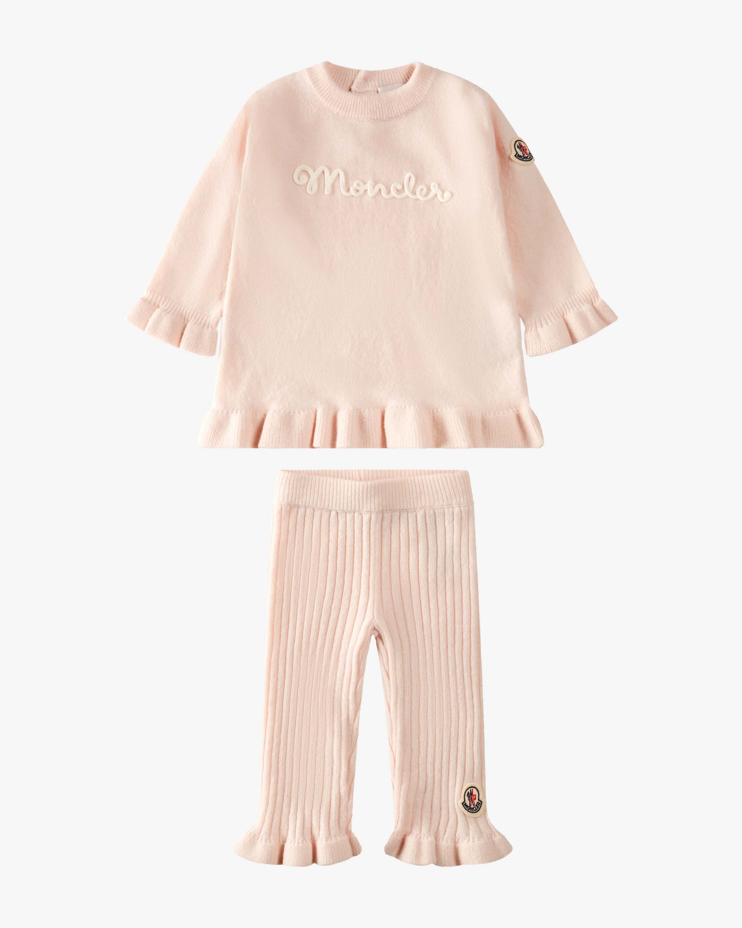 Two-piece for babies from Moncler Enfant in pink. The model impresses thanks to high-quality virgin wool and cashmere, while the buttoned back makes it easy to put on and and undressing and the cute ruffled cuffs round off the overall look harmoniously. round off the overall look harmoniously.