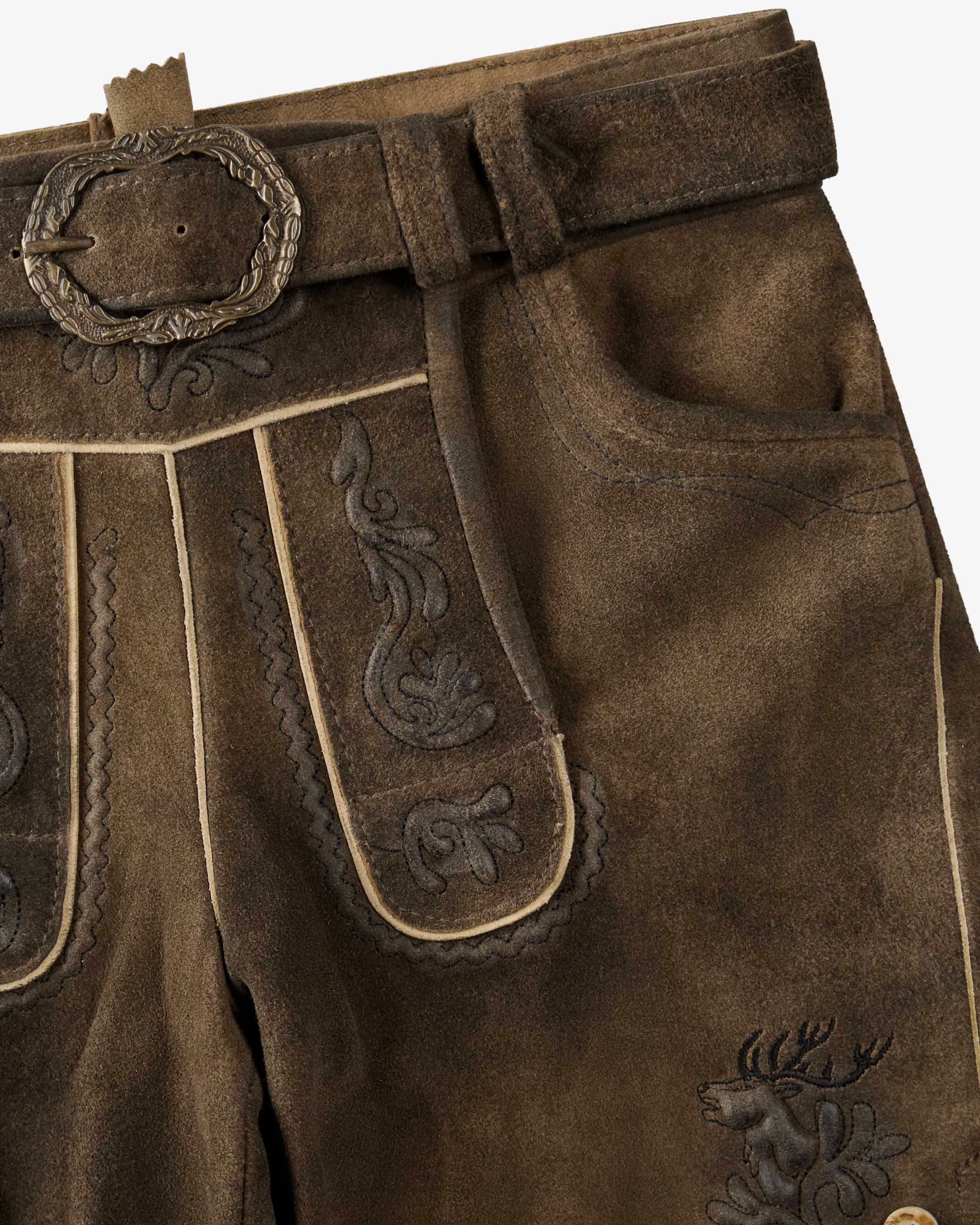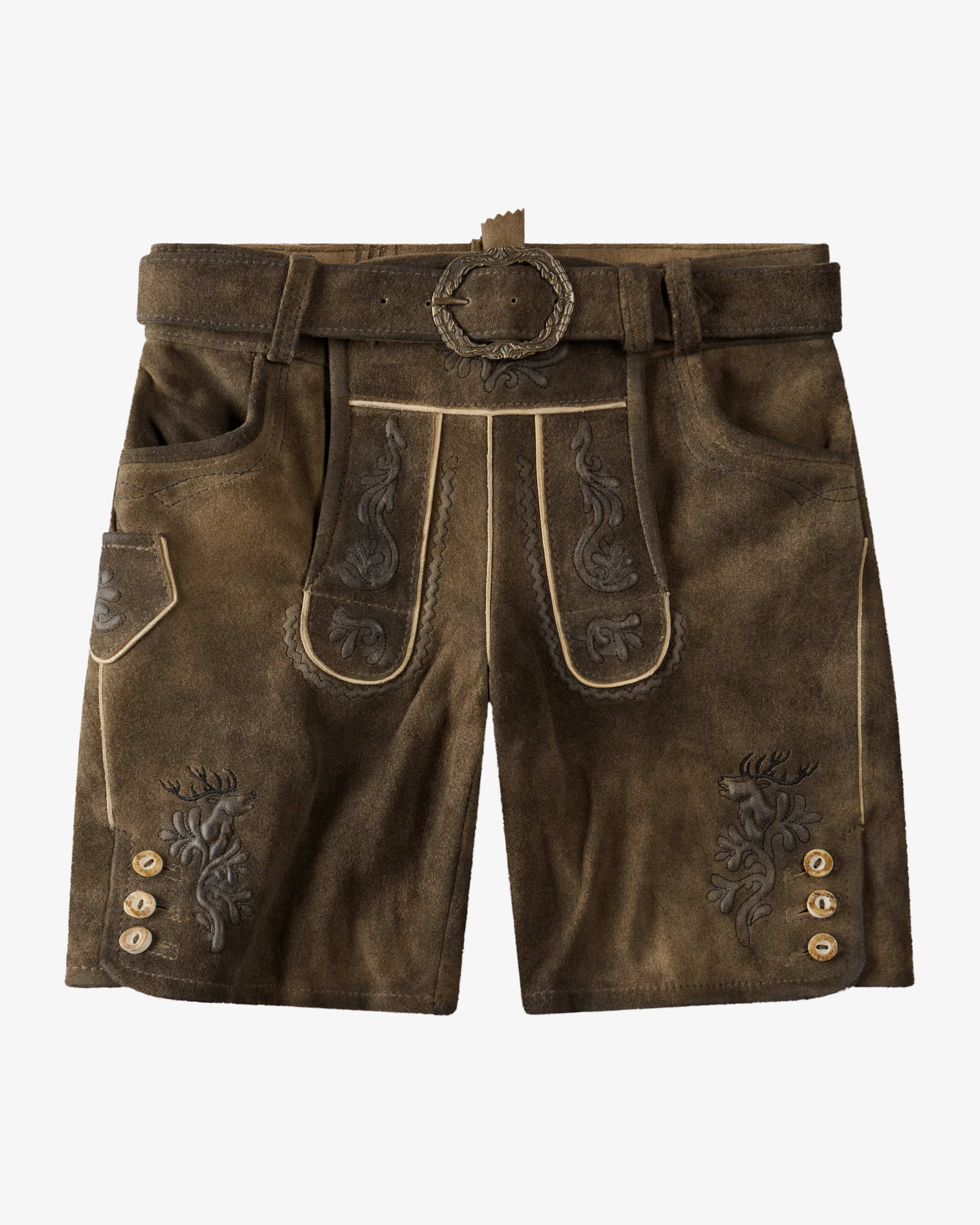 Achill Lederhose short for boys from Spieth & Wensky in brown. The mini The mini traditional costume is characterized by its high-quality leather workmanship, while stylish relief embroidery and rustic horn buttons skilfully accentuate the traditional look. the traditional look.