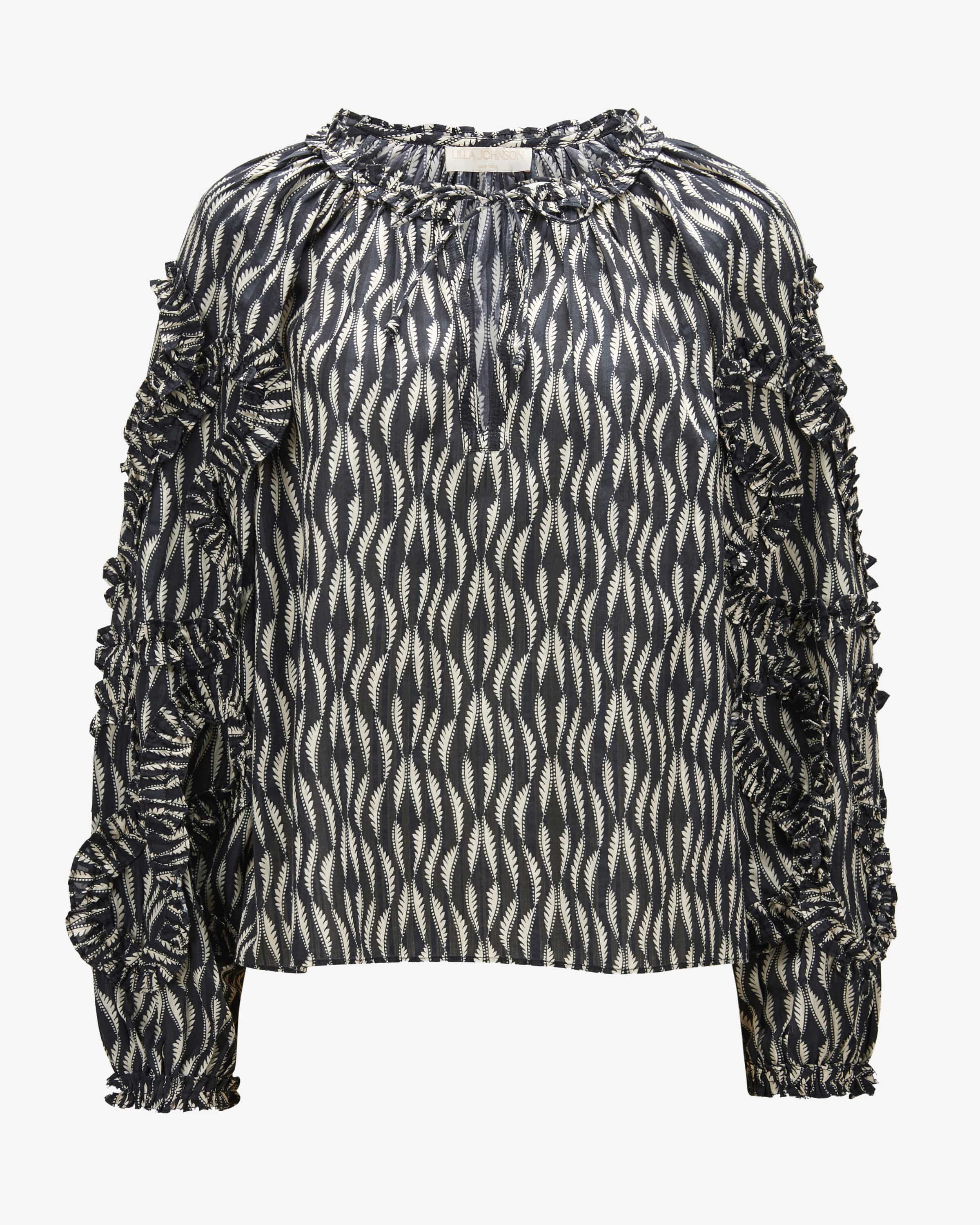 Azrou blouse for women from Ulla Johnson in graphite and cream. The New York designer stands for boho luxury with feminine flounces, embroidery and flowing flowing fabrics. This model also comes in a feminine tunic style and impresses with its lightweight cotton-viscose blend, while the all-over print creates a summery print creates a summery companion with a fashionable bohemian look.