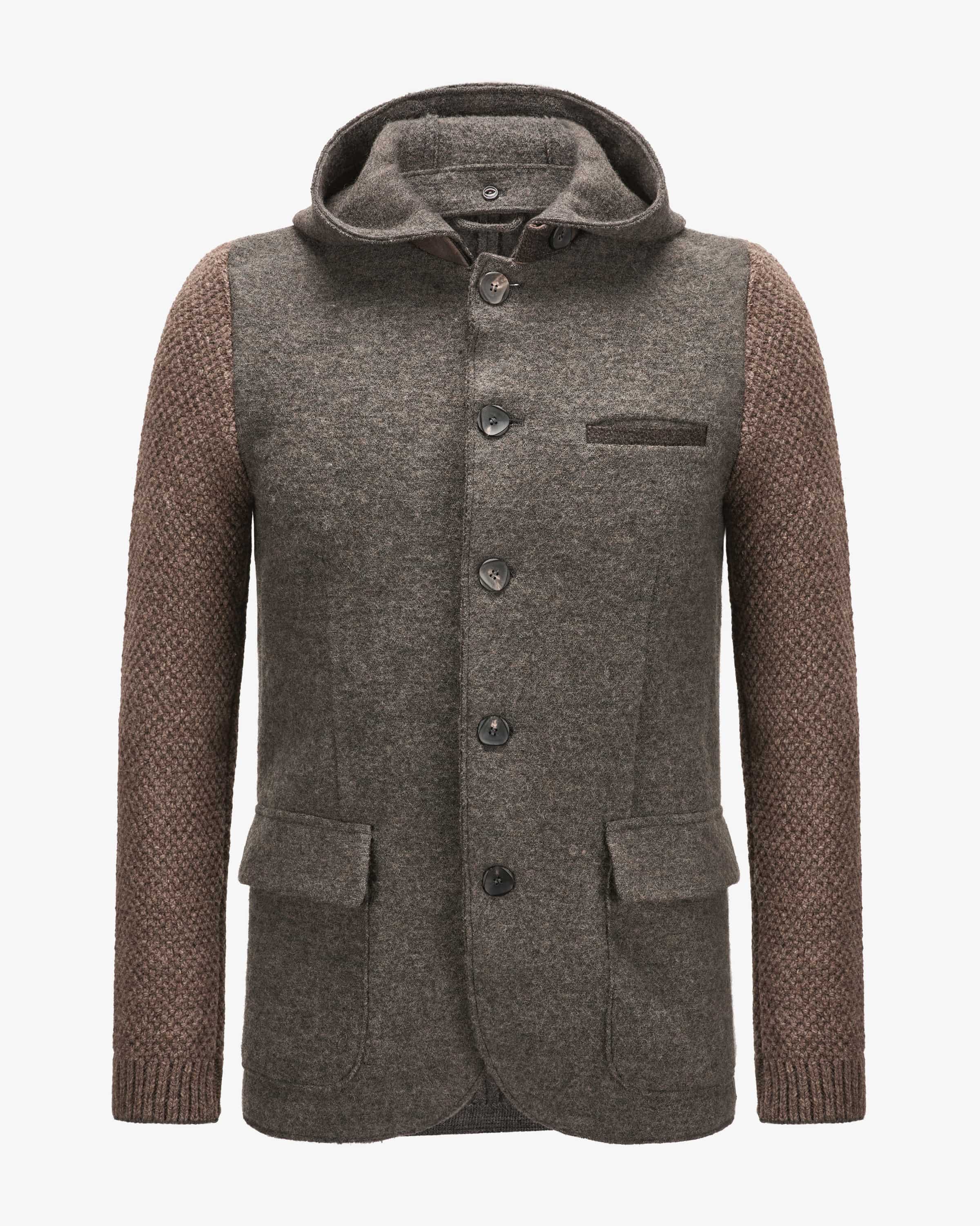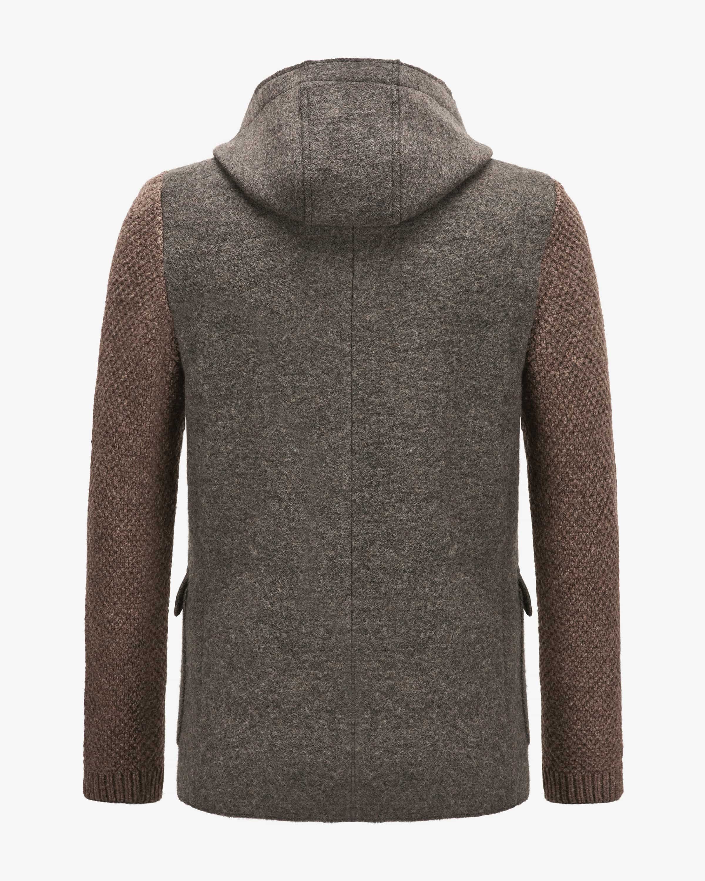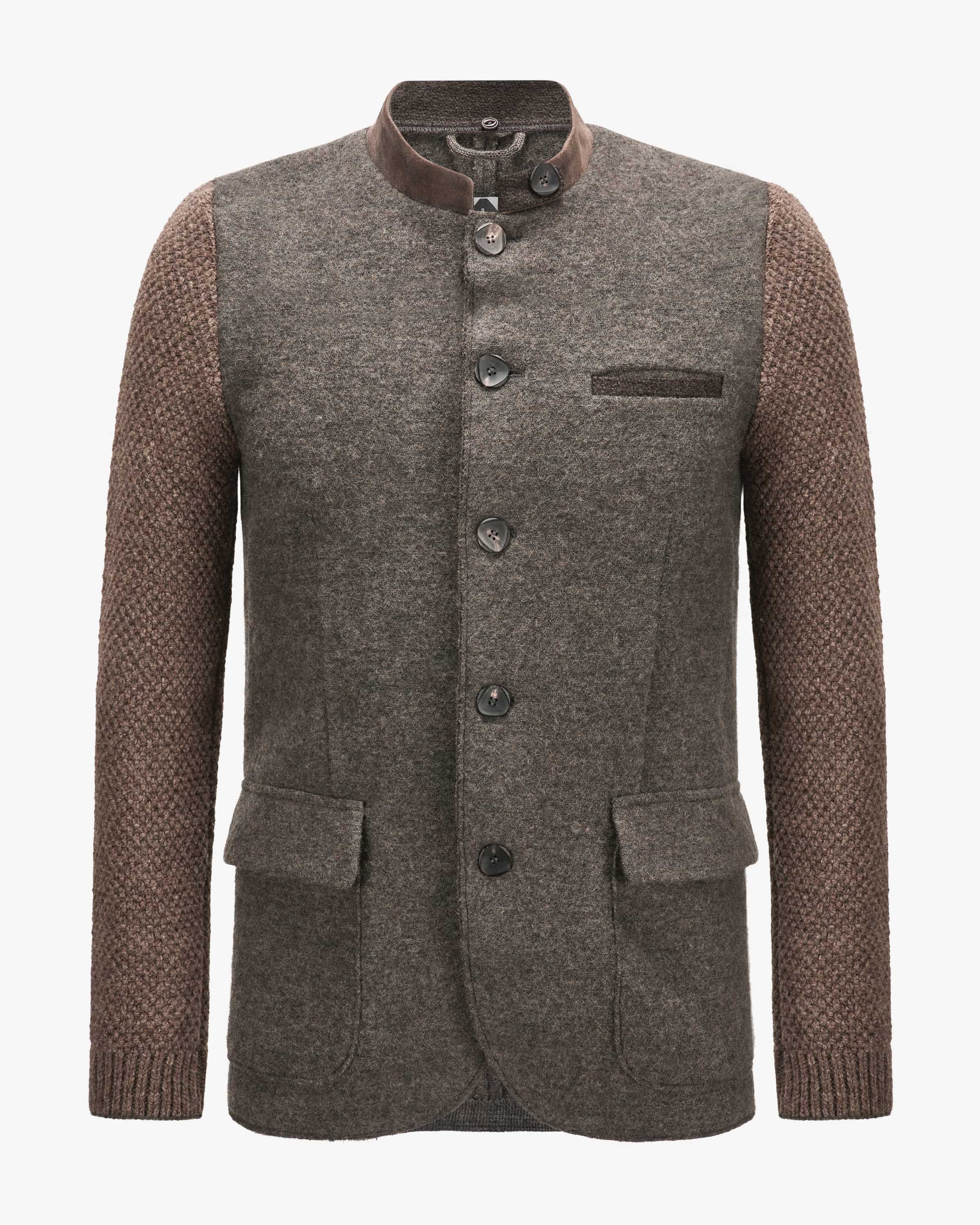 Berthold wool jacket for men from Stapf in gray-brown and light brown. While the with knitted sleeves made from high-quality virgin wool creates a traditional traditional costume look, the detachable hood adds a casual touch. accents. Suede details add the finishing touch.