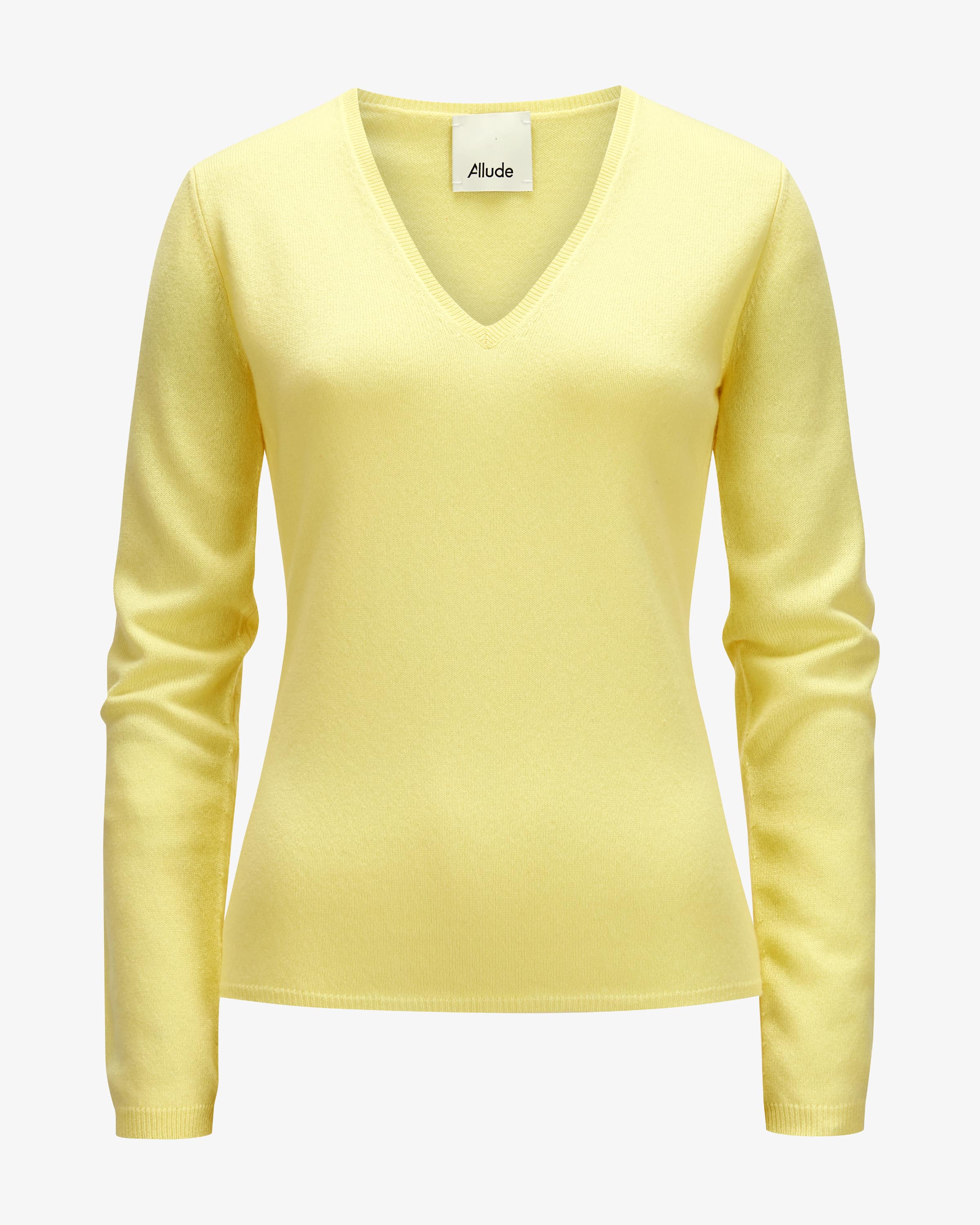 Sweater for women from Allude in lemon. The Munich-based company Allude stands for stands for fashion that radiates self-confidence and timeless individuality. Made from high-quality cashmere wool, this piece impresses with its soft feel feel, while the classic design creates a timeless knitwear essential that can be knitwear essential.