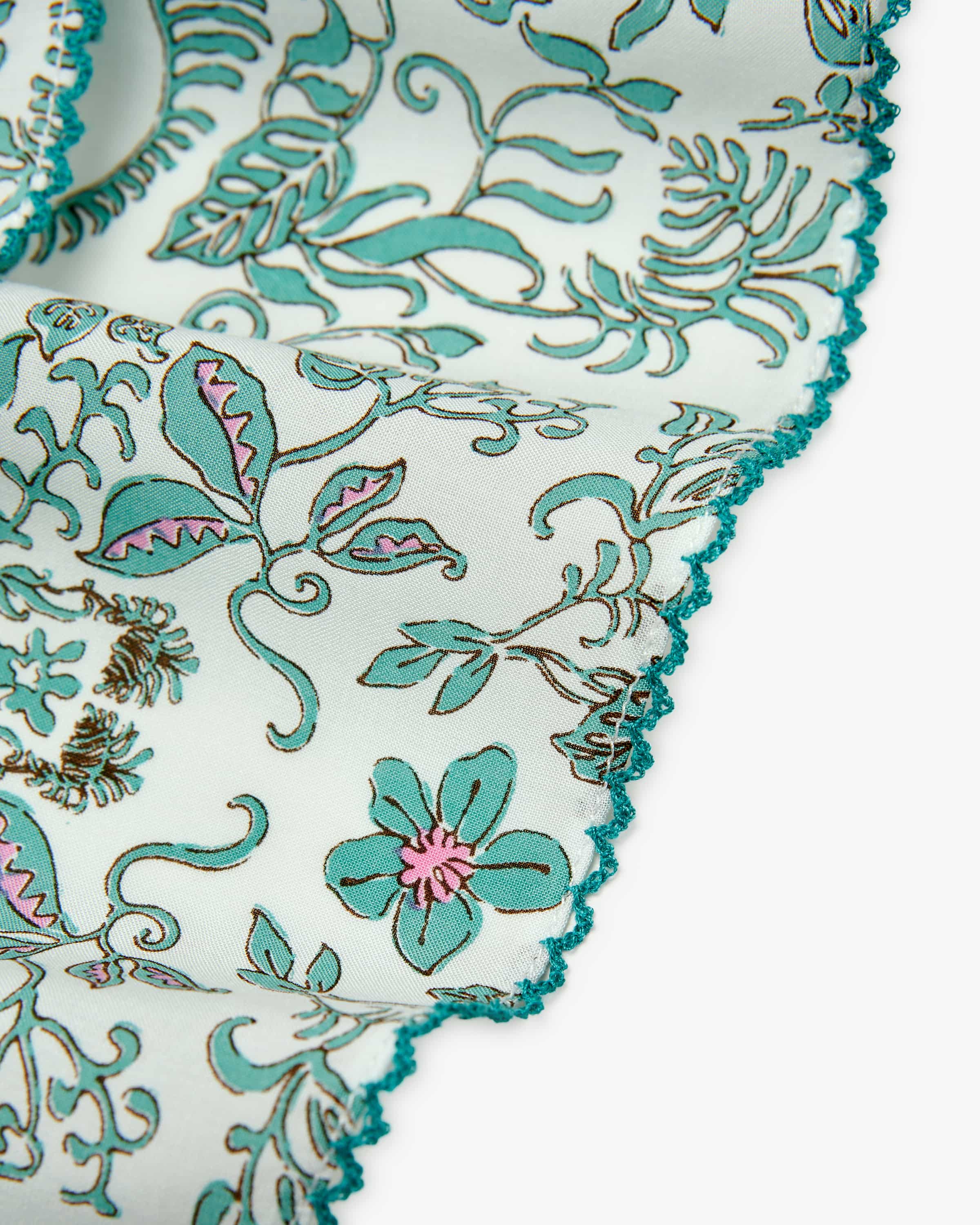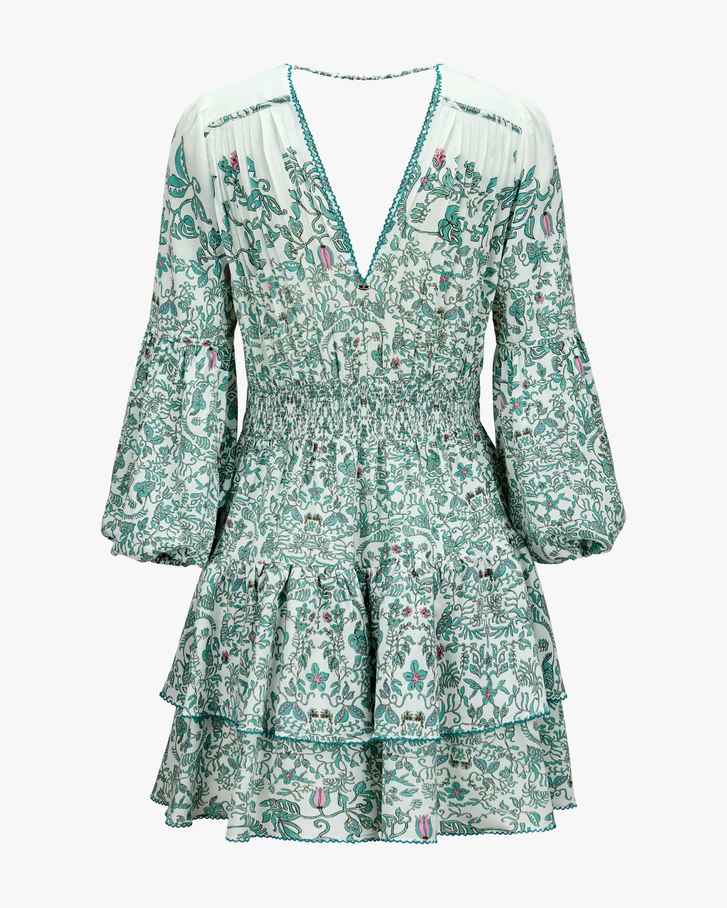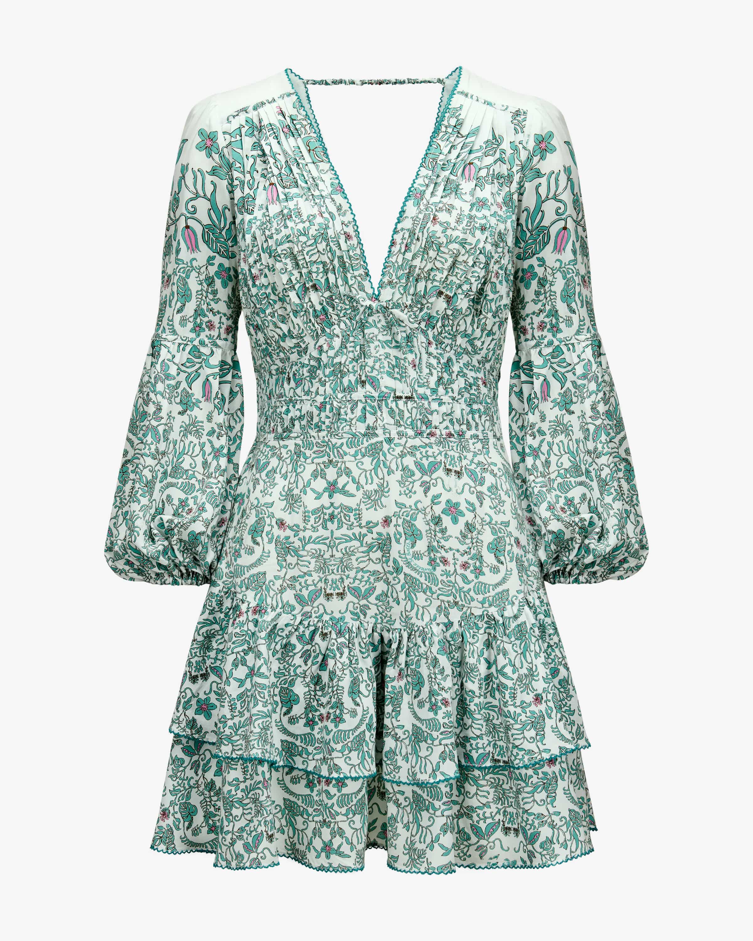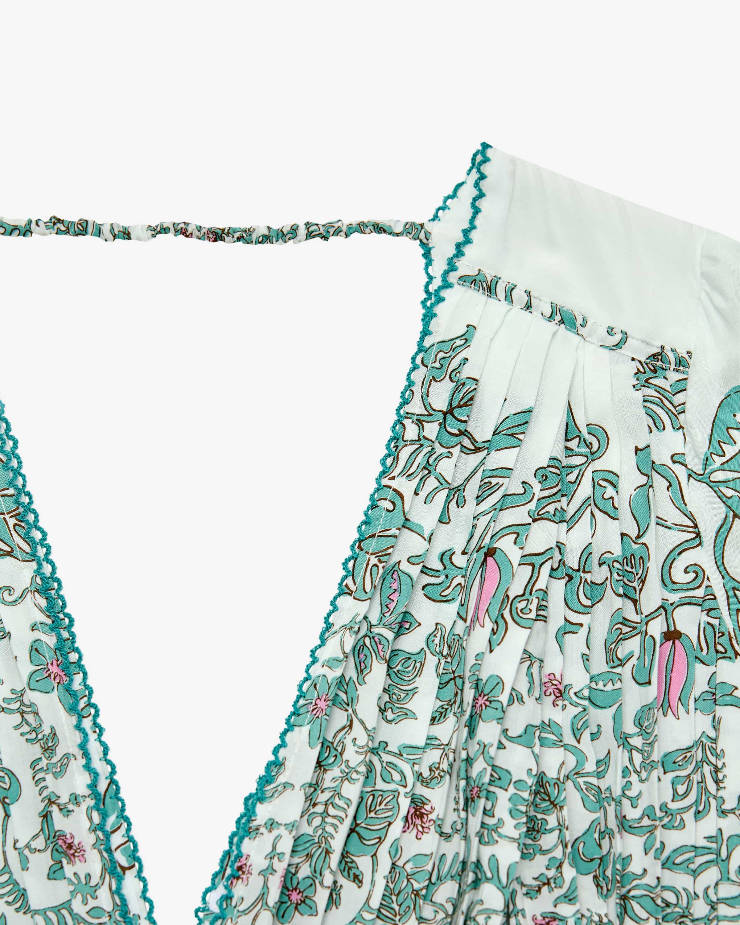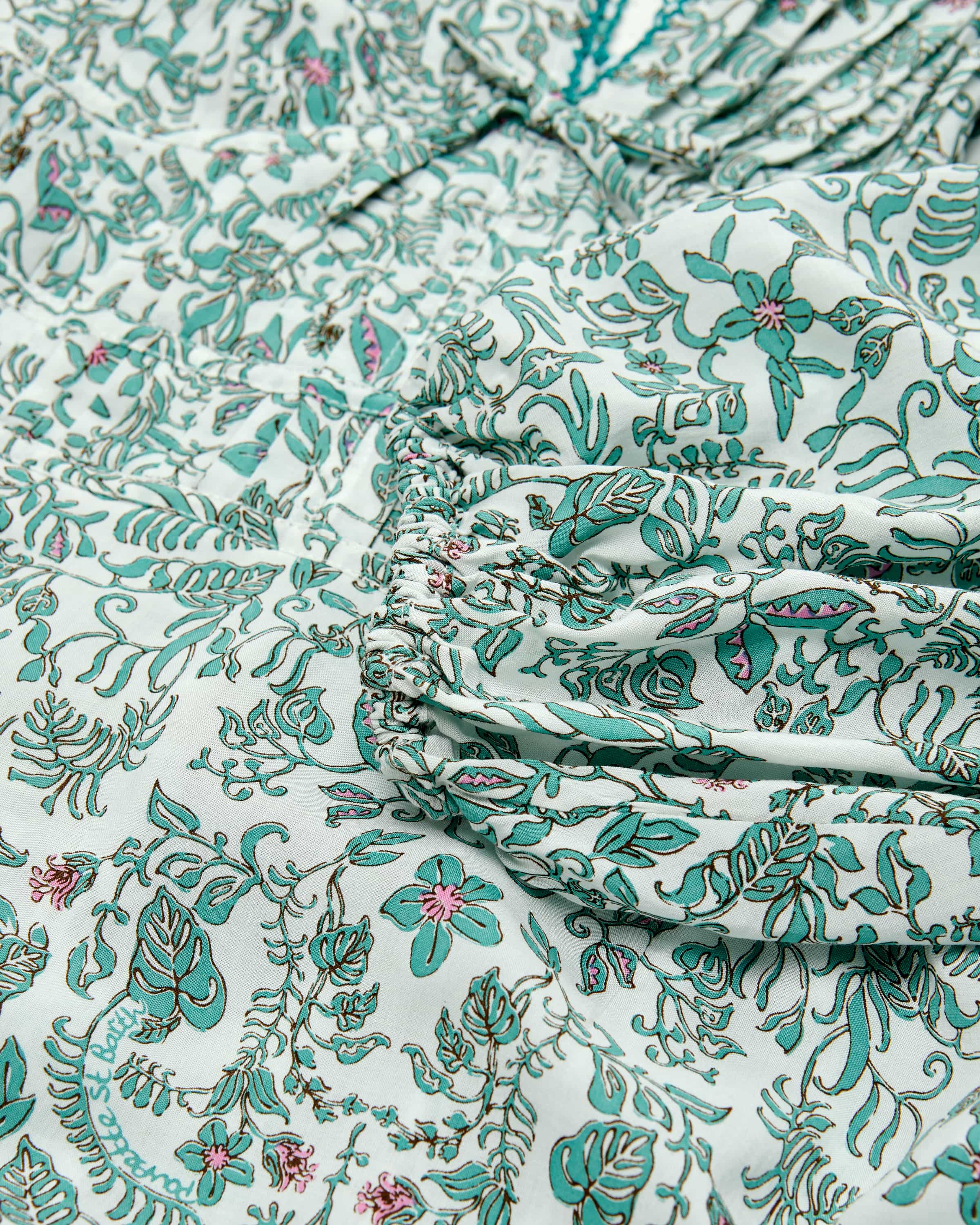 Ciara dress for women from Poupette St. Barth in mint, white and pink. The French brand brings boho resortwear with tropical lightness - ideal for summer for summer and vacation. This model also impresses with its lightweight viscose quality made from high-quality LENZING™ EcoVero, which is comfortable to wear and guaranteed. The floral print and fine piping create a romantic look with a summery bohemian flair.