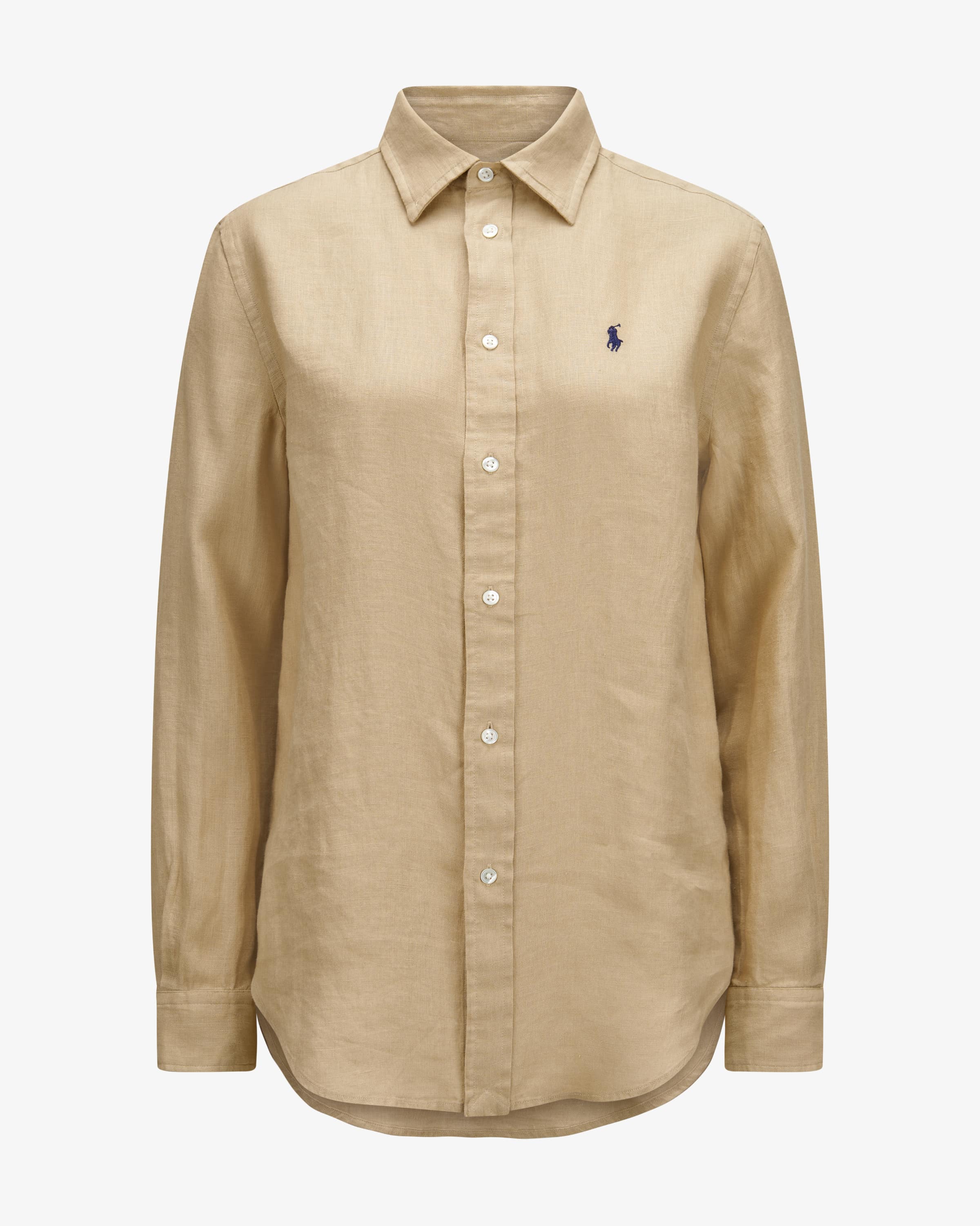 Classic fit shirt blouse for women from Polo Ralph Lauren in sand. The model made from pleasant linen fabric is a timeless favorite that is harmoniously rounded off with the harmoniously rounded off by the typical Polo rider embroidery.