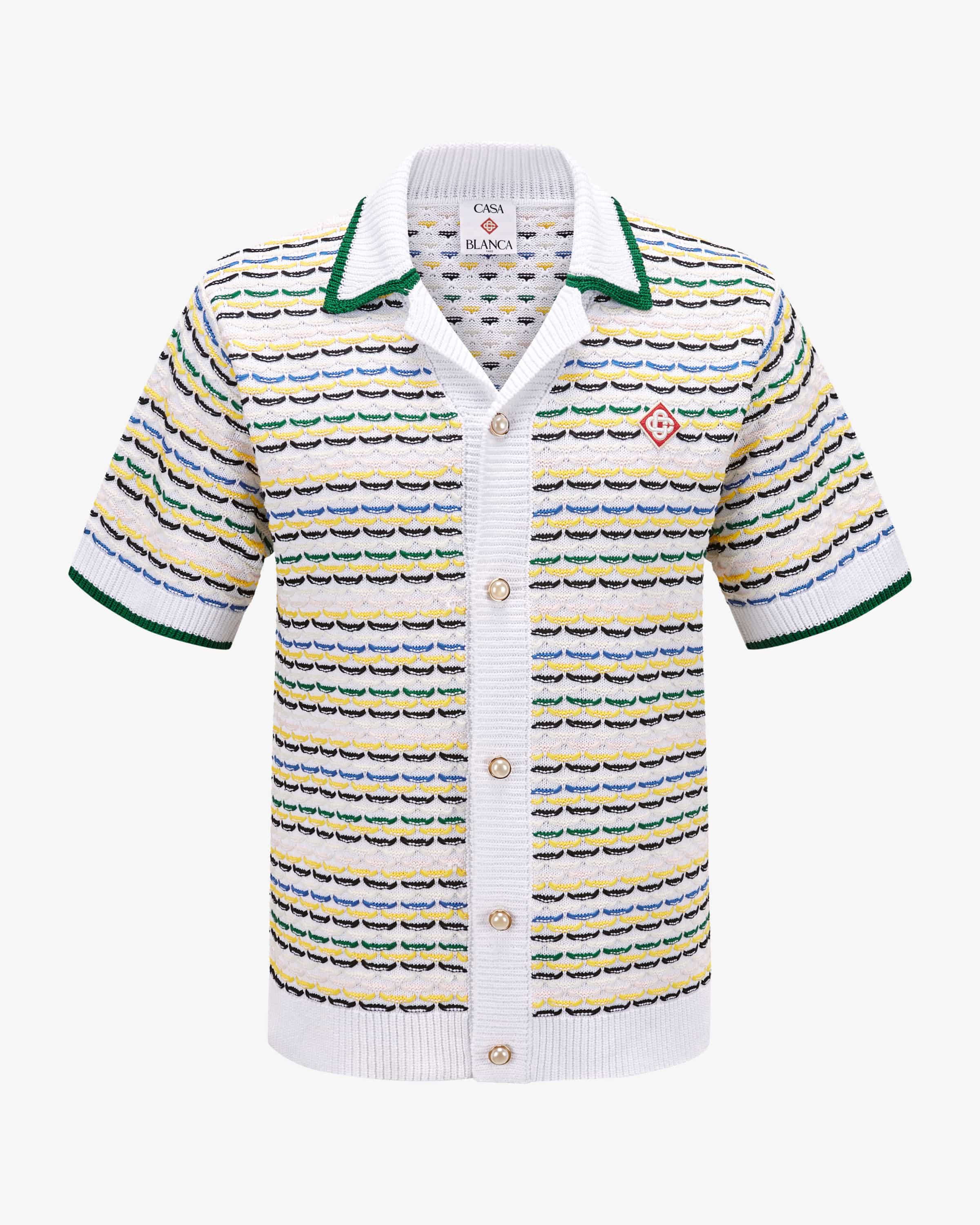 Knitted shirt for men from Casablanca in white and multicolored. The Parisian brand combines retro sportswear with luxury fashion - inspired by tennis culture and the desire to travel. This model also impresses with its extravagant knitted finish, while the colorful design in combination with the casual silhouette creates a creates a fashionable and sporty eye-catcher. The style can also be worn with the matching shorts as a summery set.