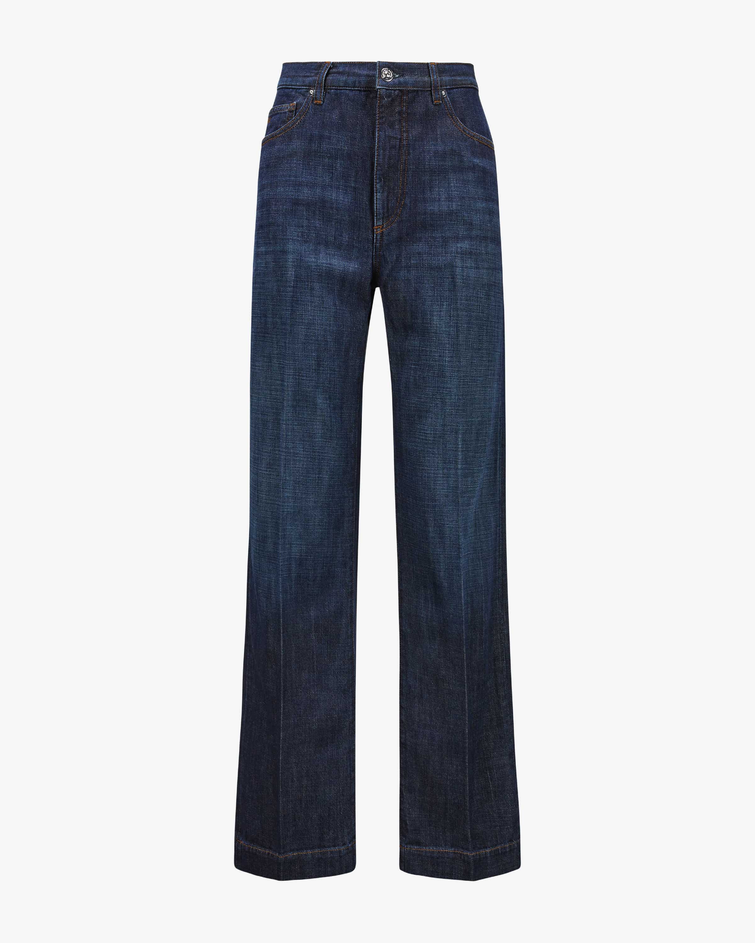Deepa jeans for women from nine:inthe:morning in dark blue. The flared model features classic denim details and a subtle used look, while the lightweight cotton fabric ensures they are comfortable to wear.