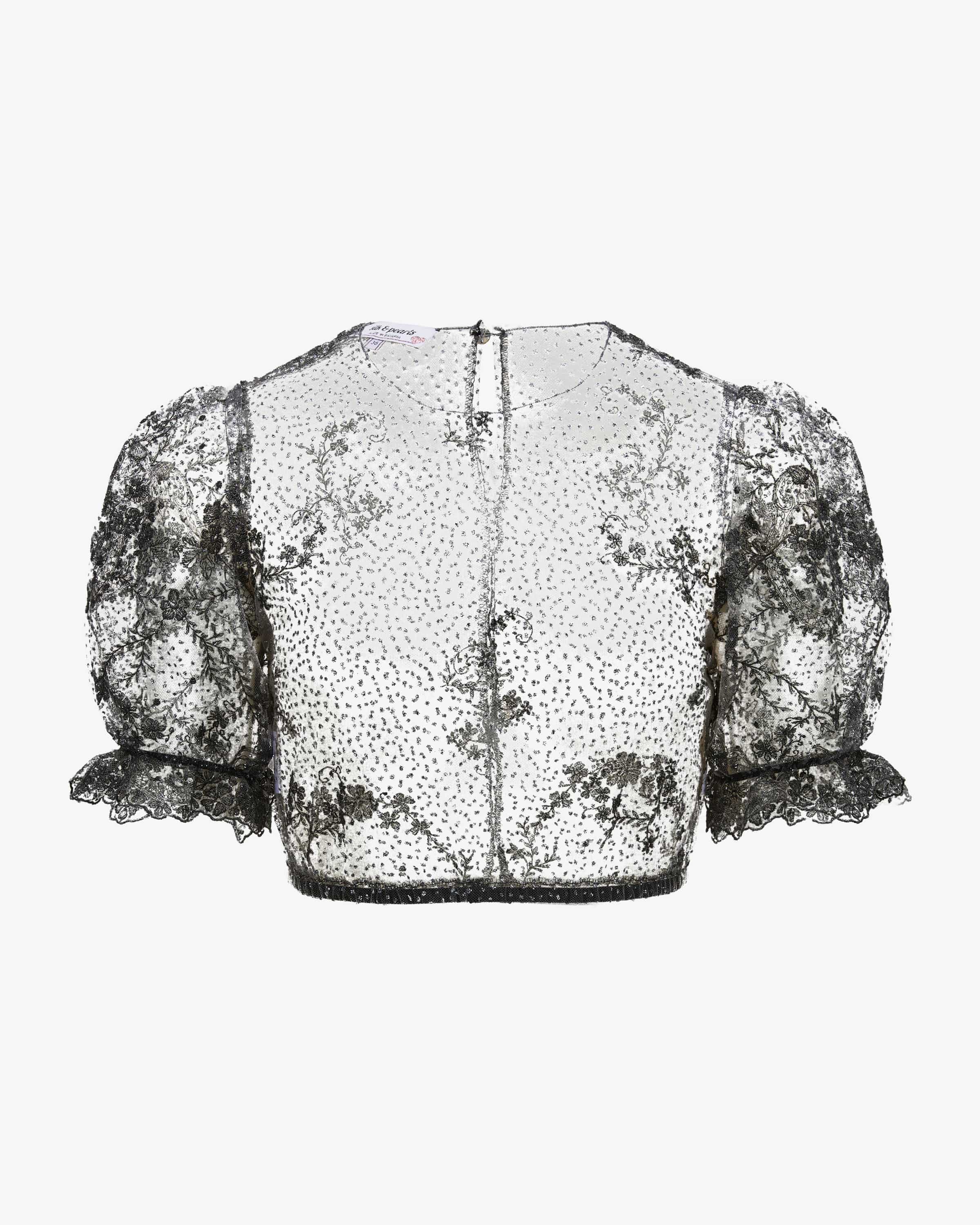Dirndl blouse transparent for women from Silk & Pearls in dark gray. This model impresses with transparent, dotted tulle, which is embellished with floral embroidery and feminine puffed sleeves for a romantic finish.