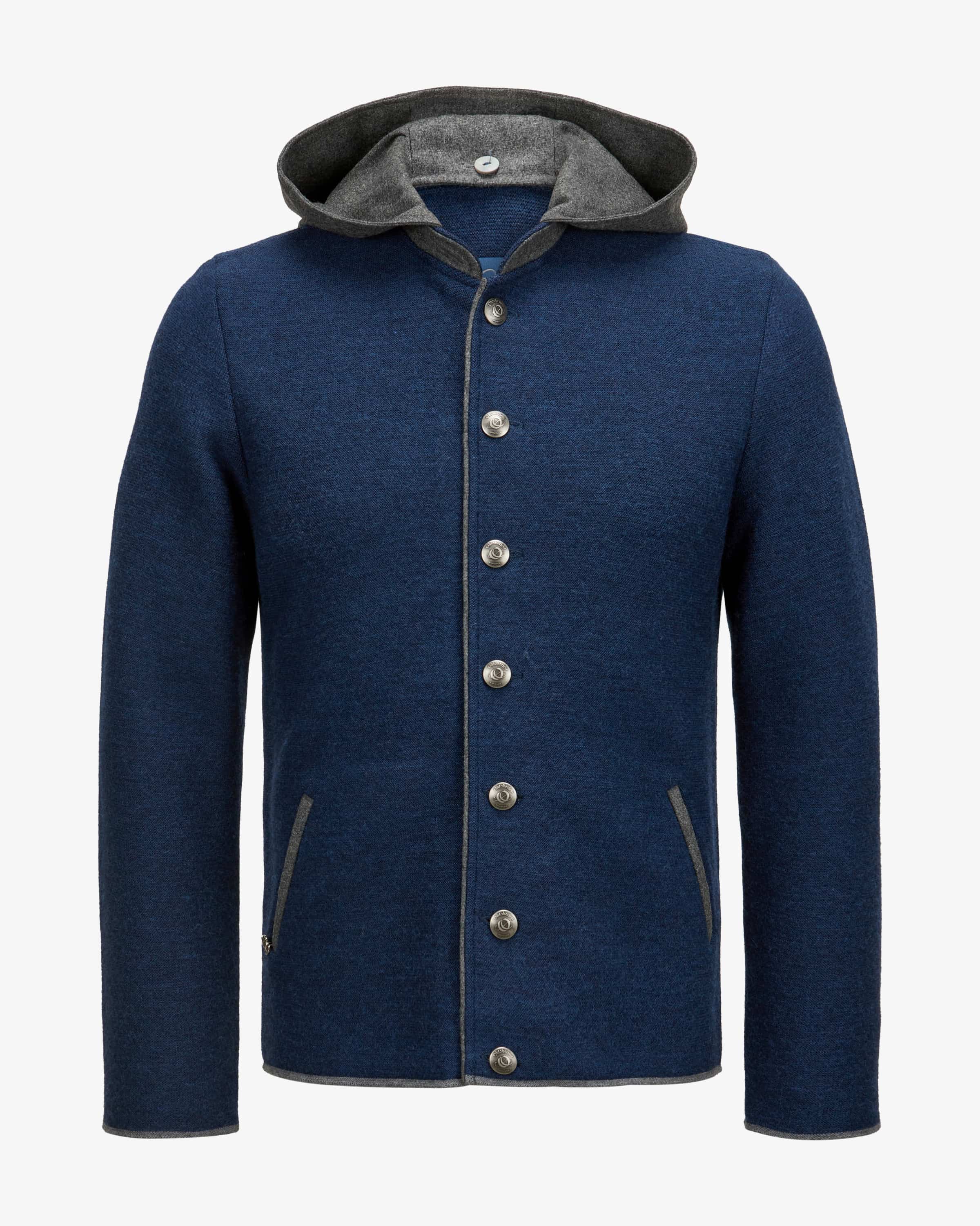 Emilian traditional cardigan for men by Litzlfelder Strickmoden in blue and anthracite. anthracite. Traditional costume with character and a love of craftsmanship - As part of the official "Oktoberfest Munich" license collection, this model impresses with discreet Oktoberfest signets on the buttons. In addition, the merino wool with a particularly soft feel for a pleasantly warm feel, while the detachable hood adds a sporty touch. hood adds a sporty touch.