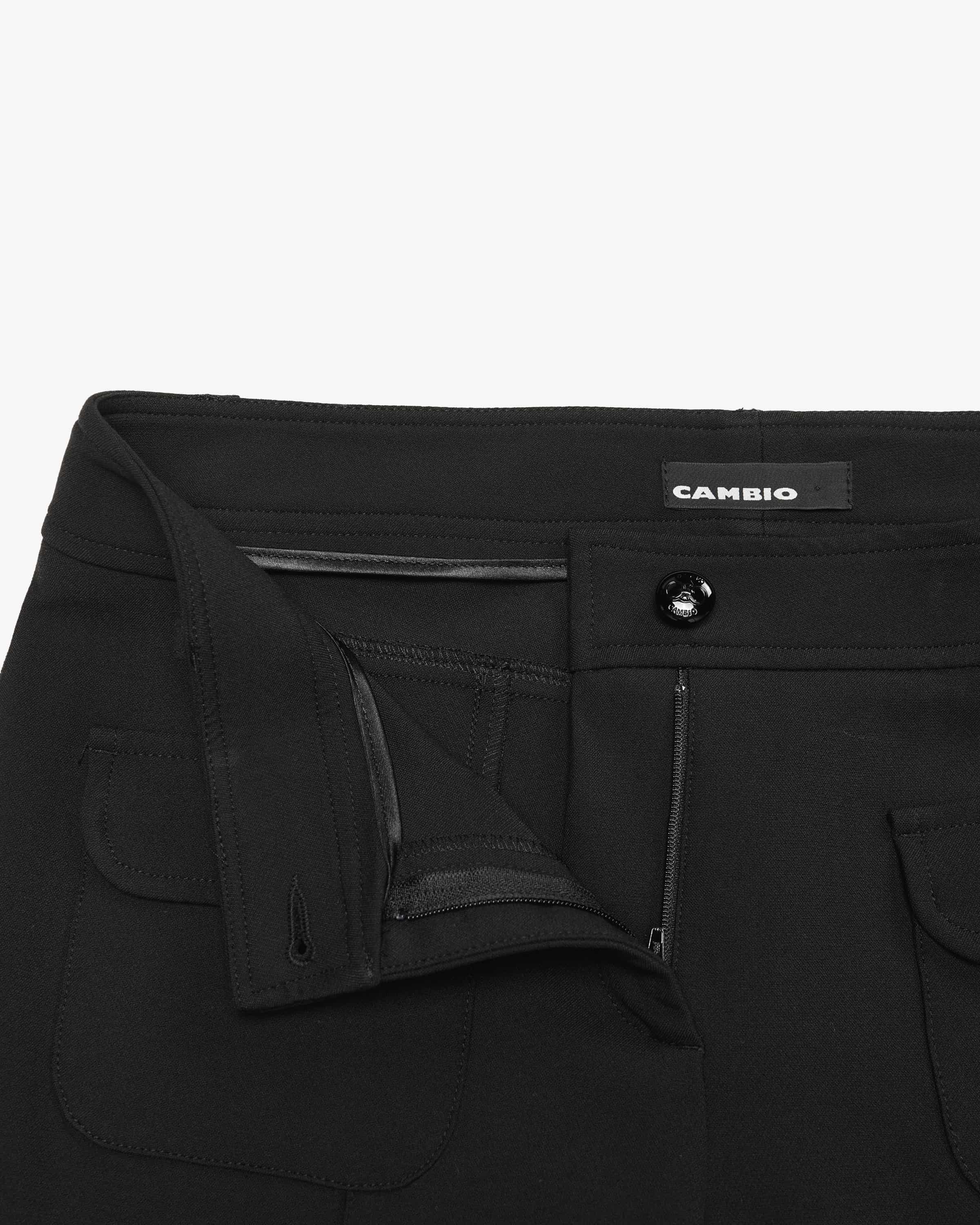 Farrah Pocket Long trousers for women from Cambio in black. The model presents itself with wide fit, while the elastic material and material ensures pleasant wearing comfort. The sewn-in creases conjure up a feminine feminine silhouette and are accentuated by the patch pockets with striking logo buttons An elegant companion for versatile looks.