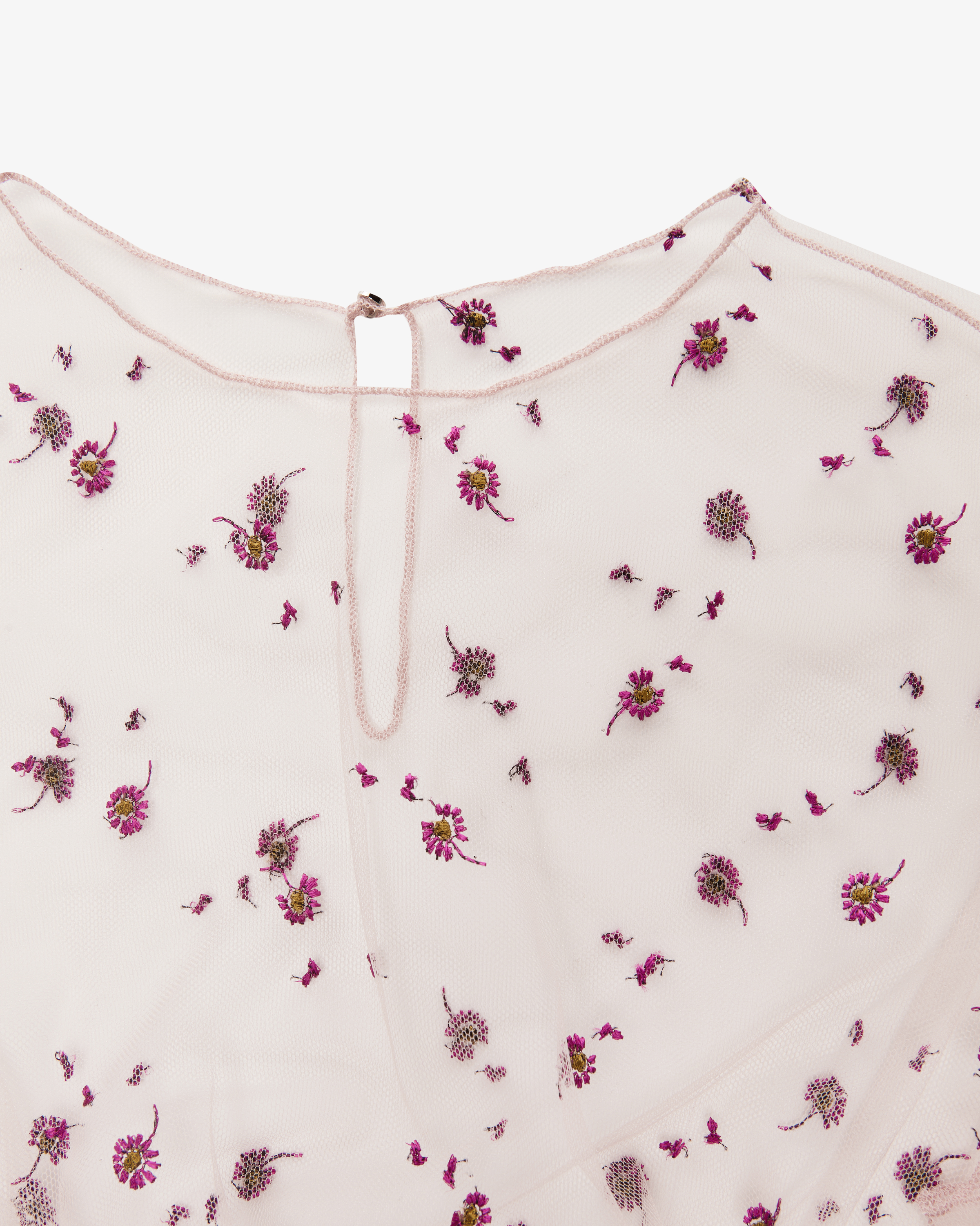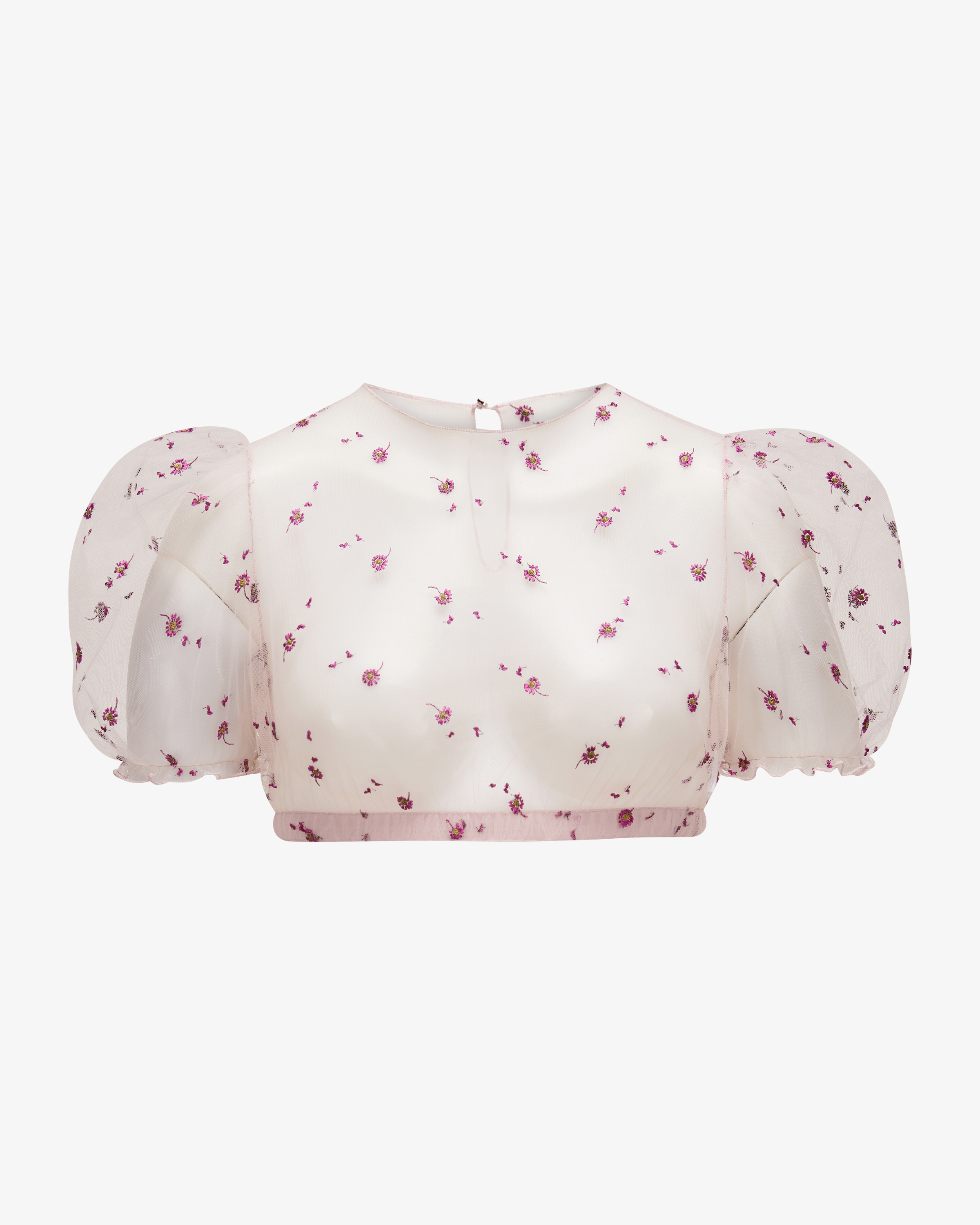 Florentina dirndl blouse transparent for women by Giacomelli Traditional costumes in raspberry and pink. Thanks to the transparent mesh finish with special floral embroidery and the short balloon sleeves, the high-necked high-necked model with a feminine, romantic character.