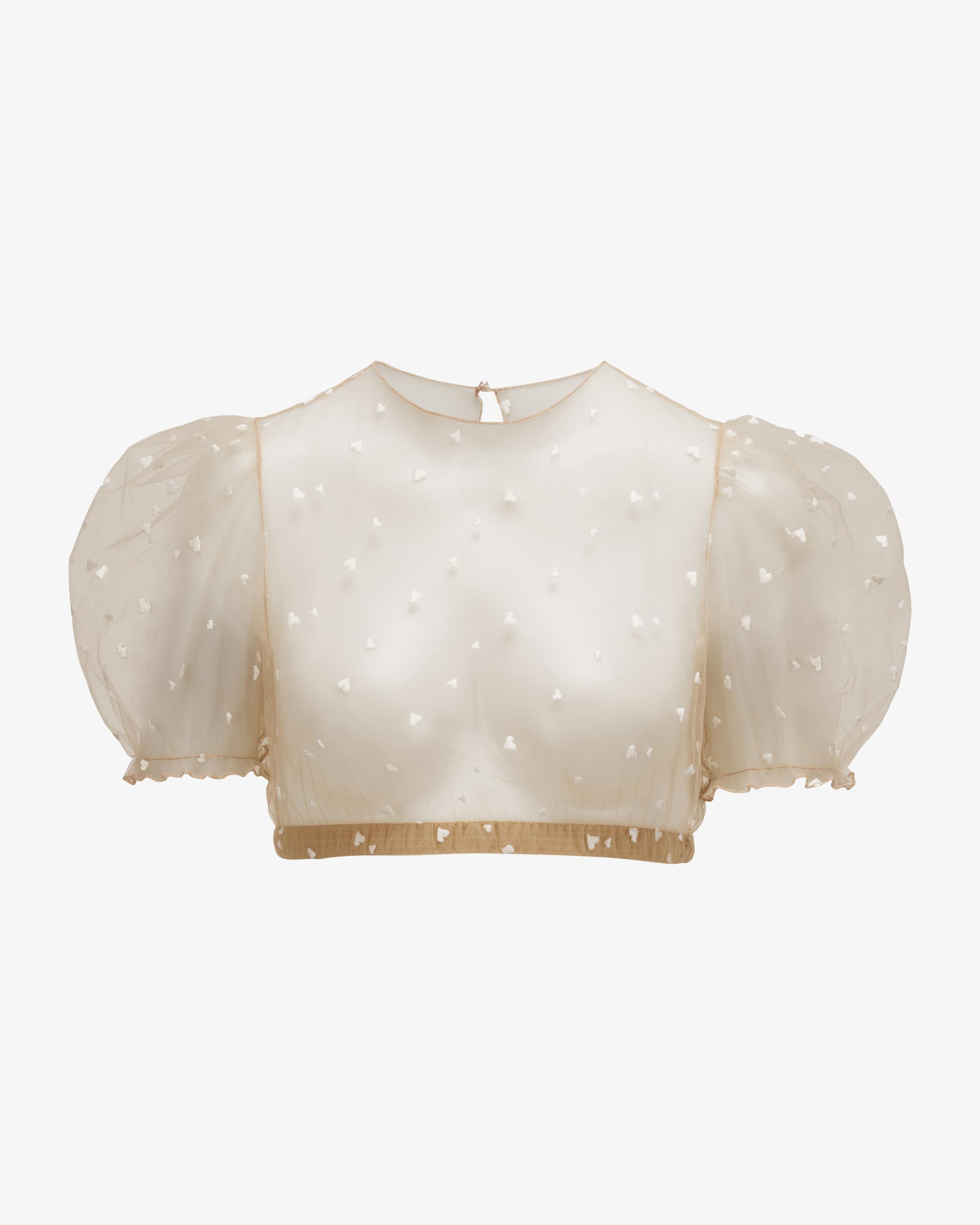 Florentina dirndl blouse transparent for women by Giacomelli Traditional costumes in nude and white. The high-necked model with delicate puffed sleeves is characterized by the transparent tulle quality, which thanks to embroidered hearts hearts stylishly stylish addition - a modern companion for your traditional look.