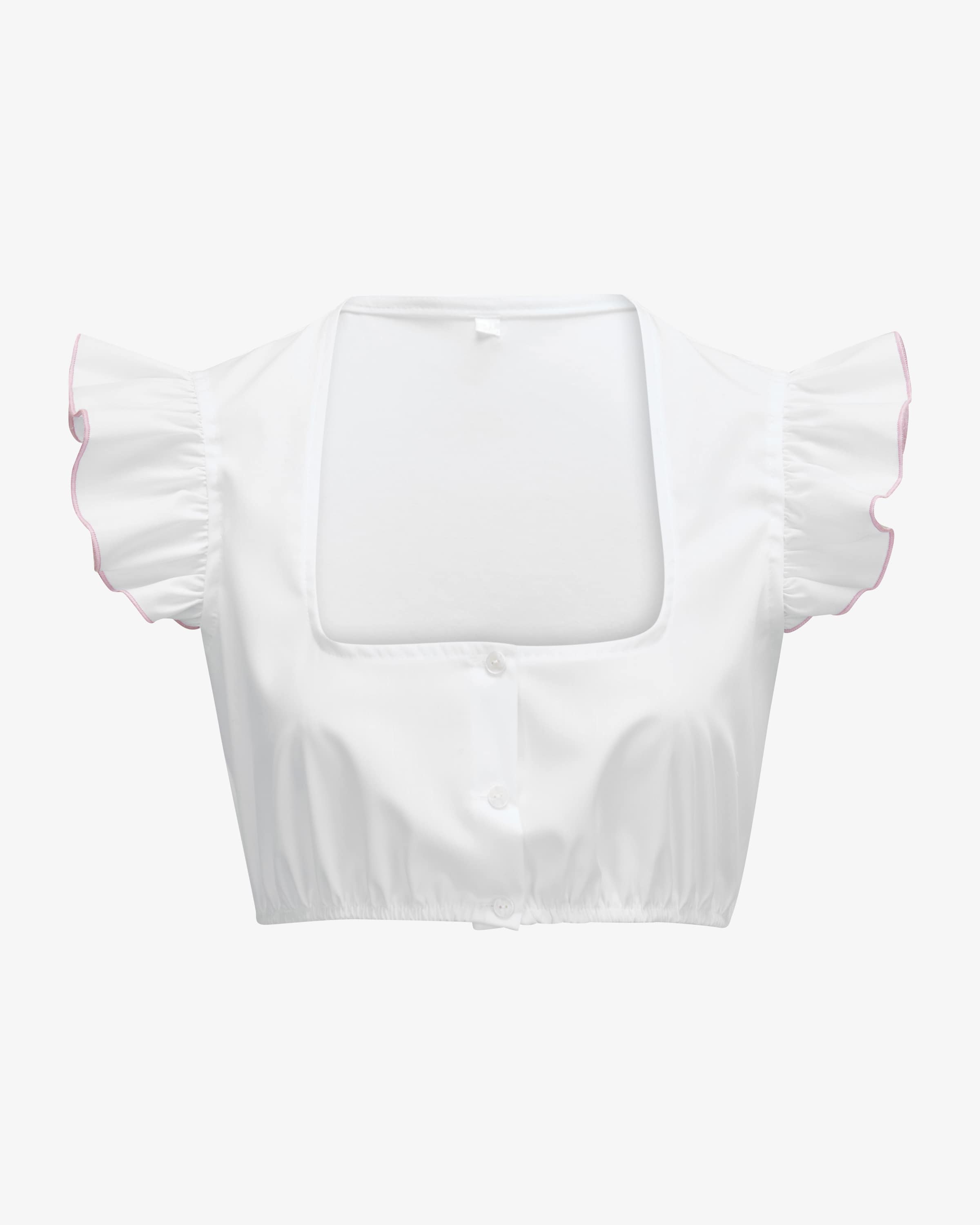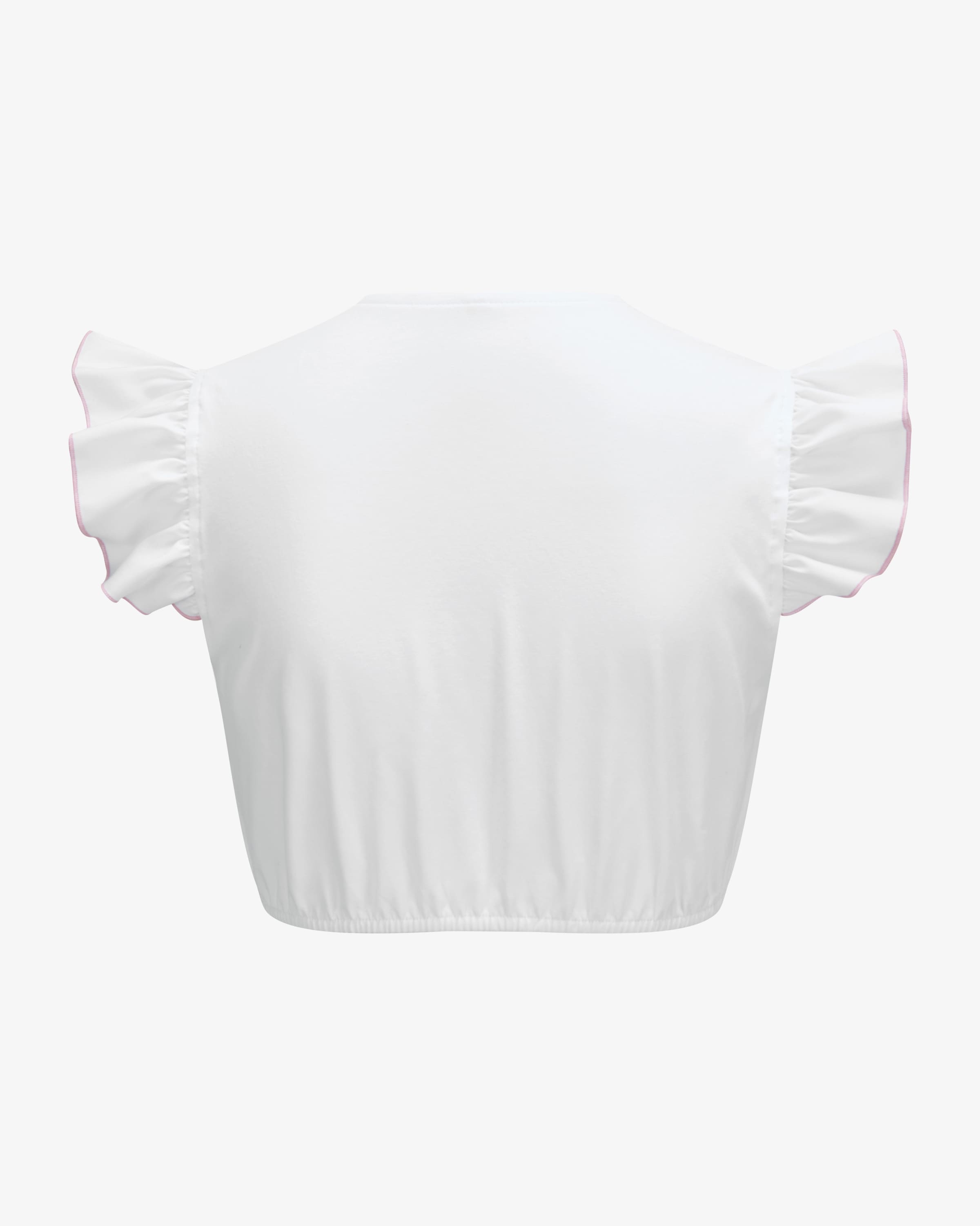 Gigi dirndl blouse for women by Nicoletta Giacomelli in white and pink. The The label's creations combine tradition and modernity and shine with elegance and sophistication. This model also has a traditional look thanks to its comfortable cotton blend. in a traditional look. Feminine cap sleeves with contrasting colored seams harmoniously complete the traditional design.