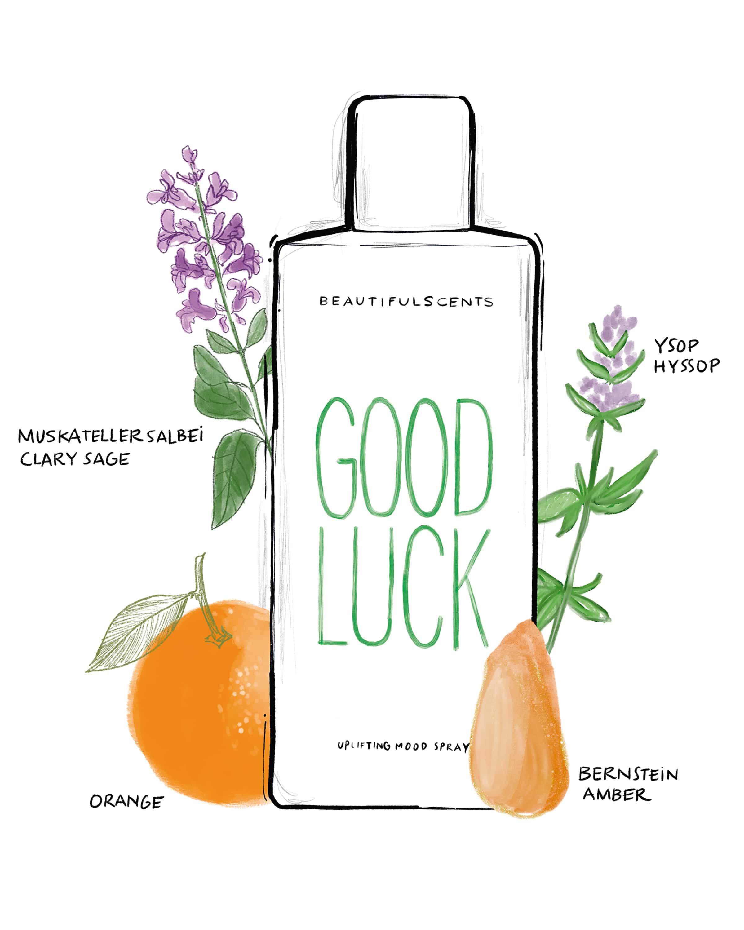 Good Luck Moodspray 70ml from Beautifulscents White and green. The founder Stefanie Wirnshofer founded the label with the aim of creating positive positive moods with a spray. To achieve this, she uses essential oils and precious stones. The fragrances and ingredients range from orange to clary sage, while clary sage, while amber radiates joie de vivre and optimism.