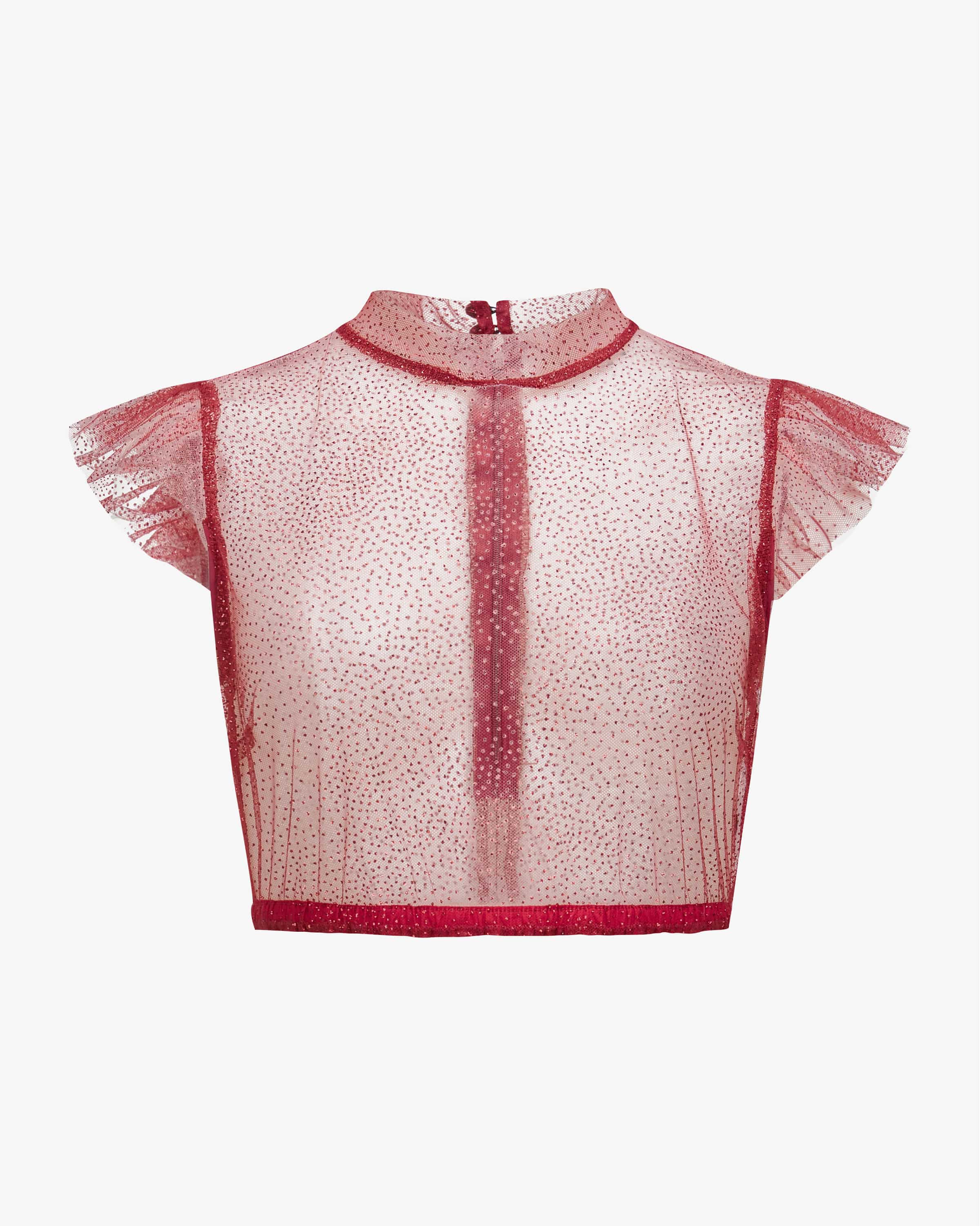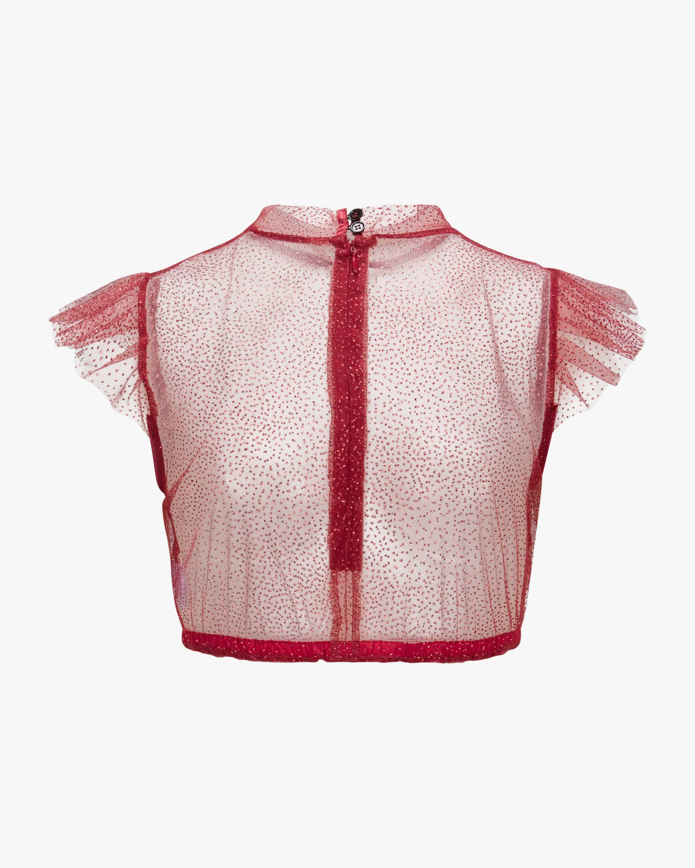 Heiki dirndl blouse transparent for women from Kinga Mathe in red. The high-necked model with cap sleeves is characterized by its the semi transparent tulle quality, which is stylishly complemented by a glittering is stylishly complemented - A modern companion for your traditional look.