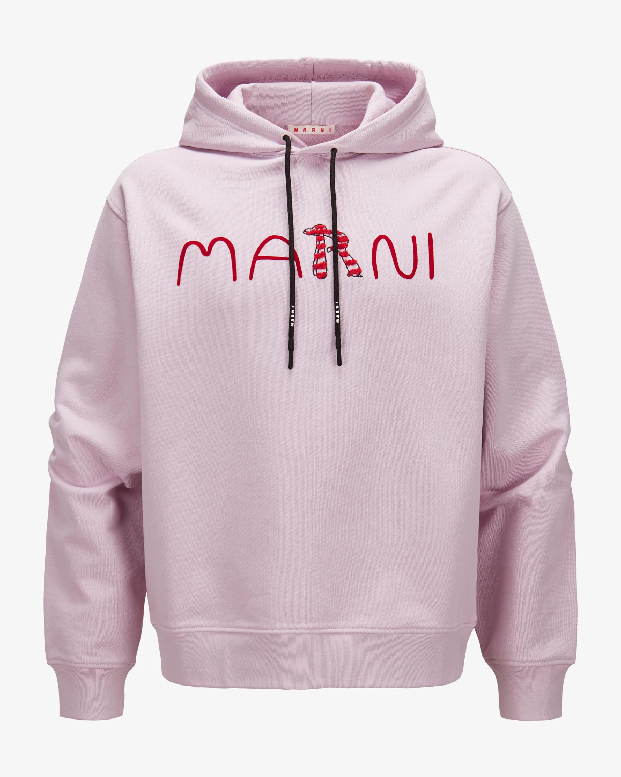 Hoodie for men from Marni in pink and red. A Milanese fashion house with maximalist approach - with color, print & experimentation as a stylistic device. This This model also impresses thanks to the contrasting velvet logo detail with embroidered embroidered letter with the typical street style charm of the label, which is enhanced by the is skillfully underlined by the casual oversized silhouette.