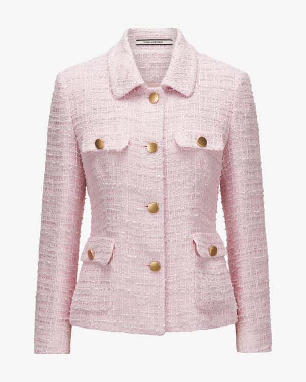 Idelle bouclé blazer for women by Tagliatore in red. The Italian brand stands for excellent men's and women's blazers - the finest tailoring from Apulia with a modern touch. Thanks to the classic bouclé look, this shortened model scores as a stylish companion, which is skillfully accentuated by the gold-coloured is skillfully accentuated by the gold-coloured knot buttons.