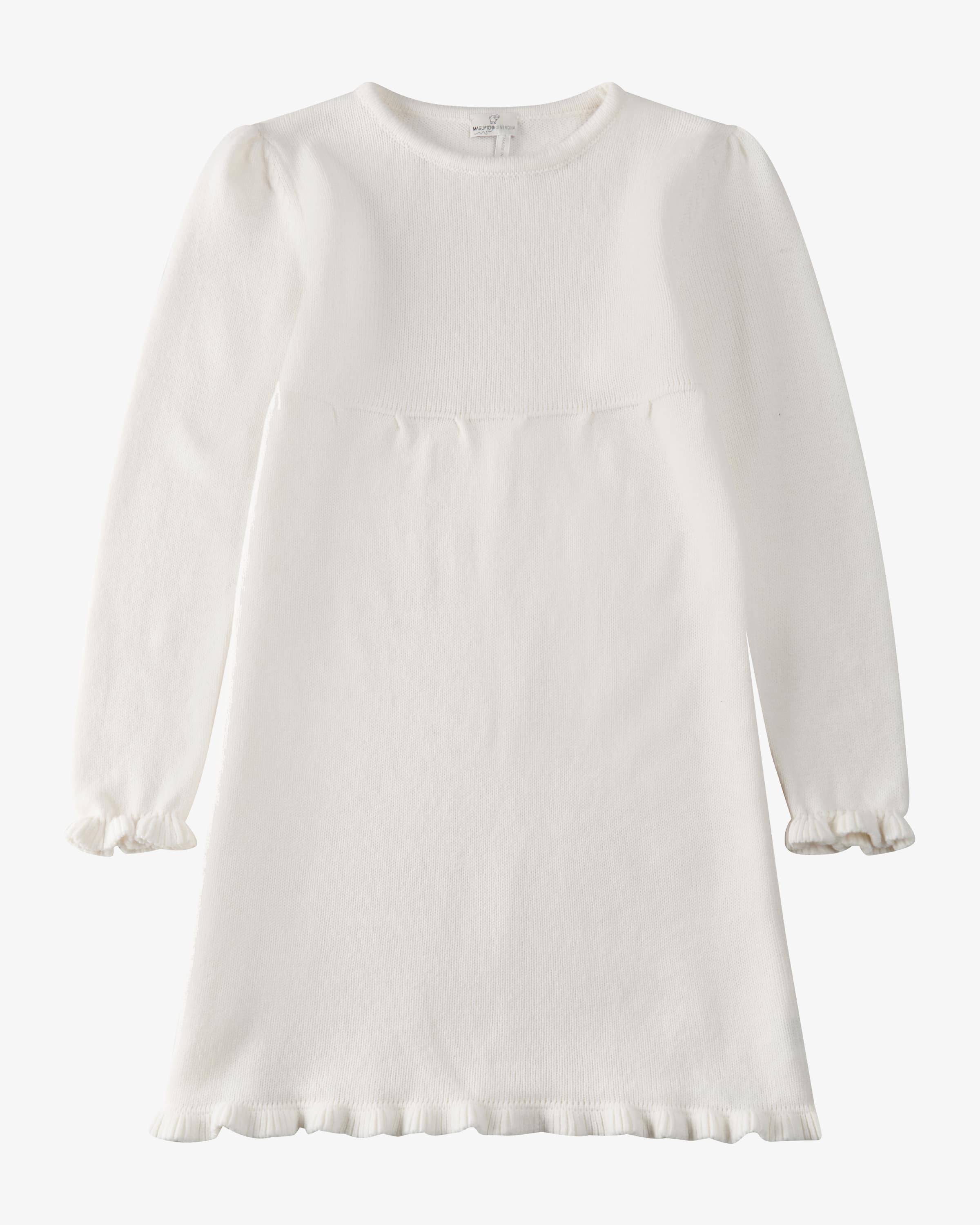 Knitted dress for girls by Maglificio di Verona in cream. The model impresses thanks to its cute ruffled hems and flared silhouette, while the soft merino wool guarantees merino wool guarantees a comfortable fit.