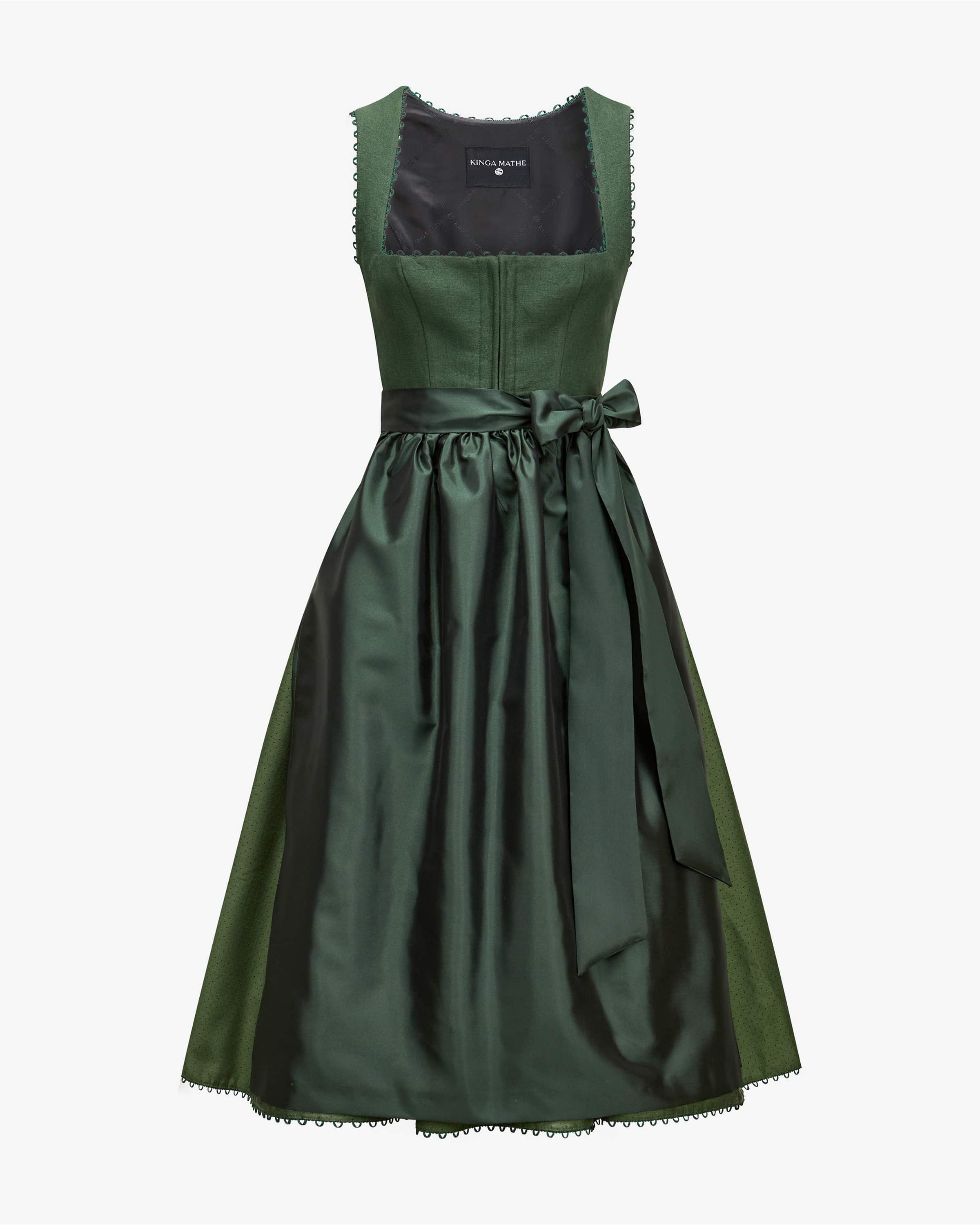 Munich midi dirndl with silk apron for women from Kinga Mathe in dark green. With the German label designs elaborate traditional costume creations with that certain something that certain something and impresses with its exquisite choice of fabrics and creative designs. The model features a high-quality linen bodice, while the underskirt with a underskirt with a flouncy hem gives it a feminine fit. The iridescent silk apron harmoniously completes the dotted skirt.