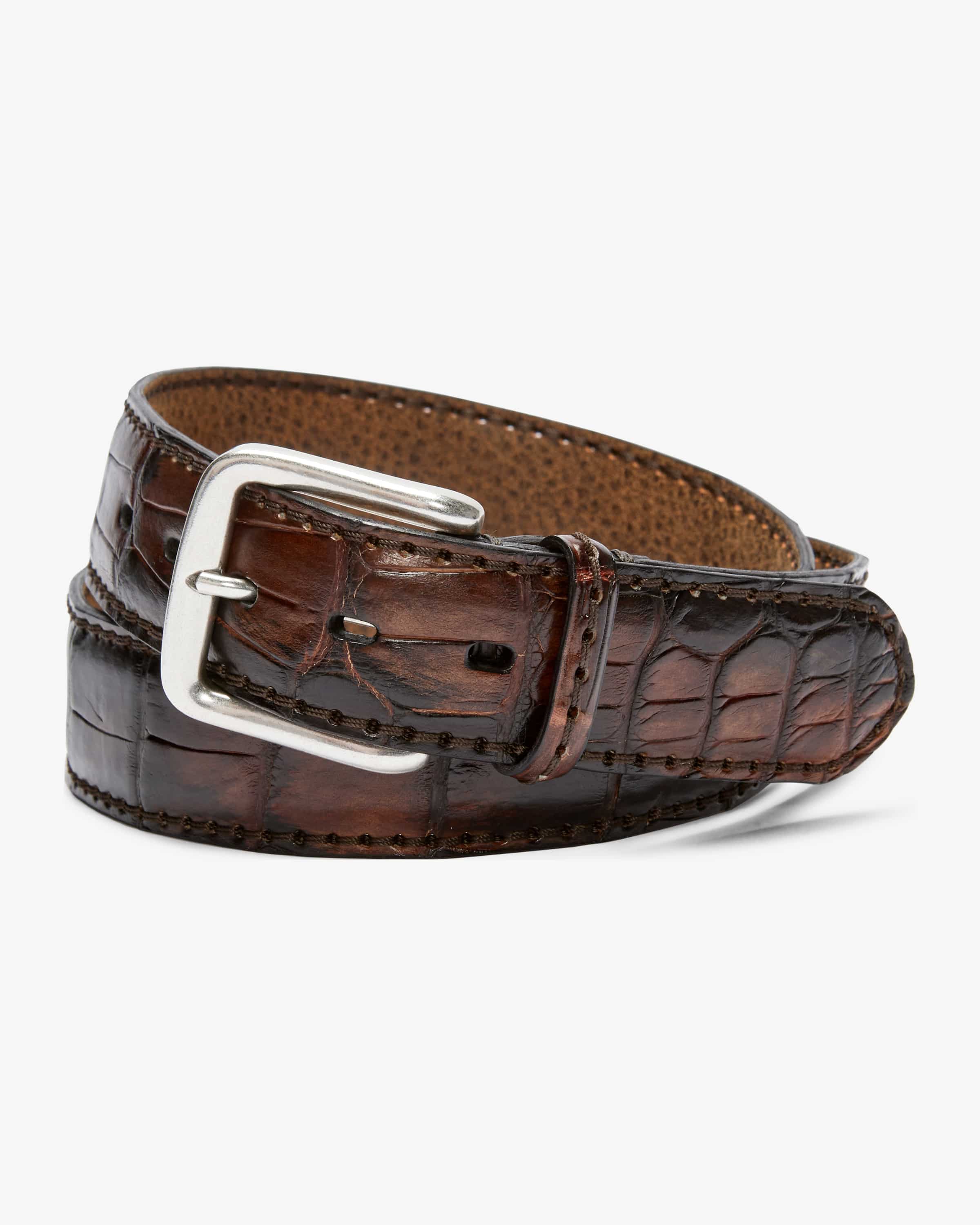 Napoli alligator leather belt for men from Fausto Colato in cognac and black. The exclusive belt made from high-quality reptile leather has an elegant texture. Hand-dyed and fitted with a striking pin buckle, the masculine design is skilfully design is skillfully completed.