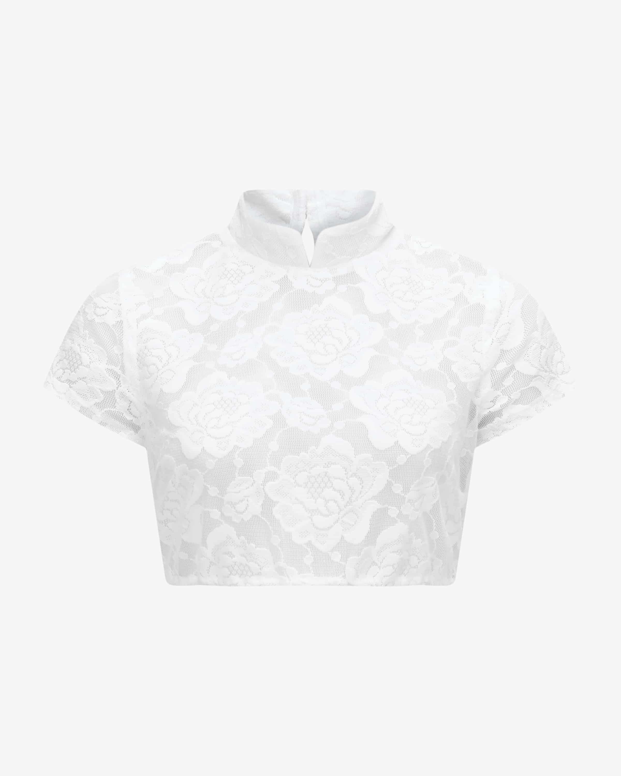 Sabrina dirndl blouse semi-transparent for women by Susanne Spatt in white. Handmade traditional costume fashion from Salzburg - the short-sleeved model has a feminine lightness thanks to the floral lace gives this short-sleeved model a feminine lightness in a semi-transparent look. The buttoned stand-up collar with a slit at the front adds the finishing touch. finishing touch.