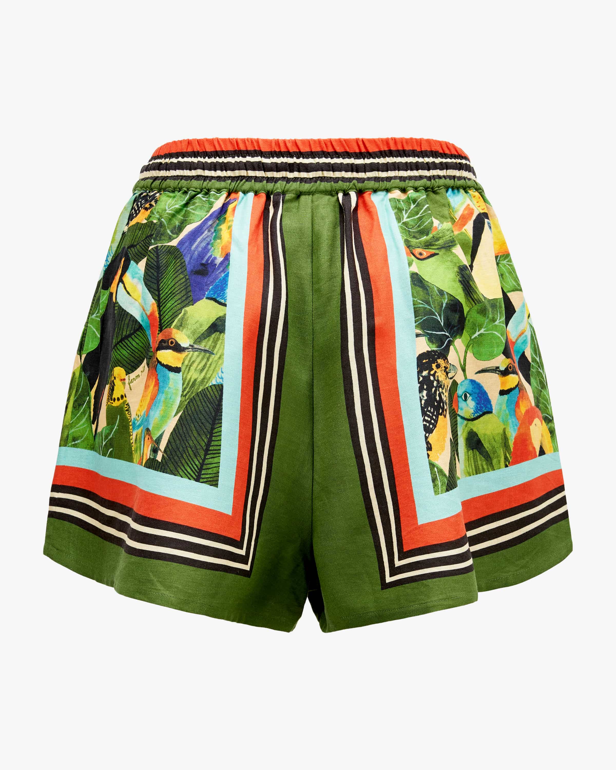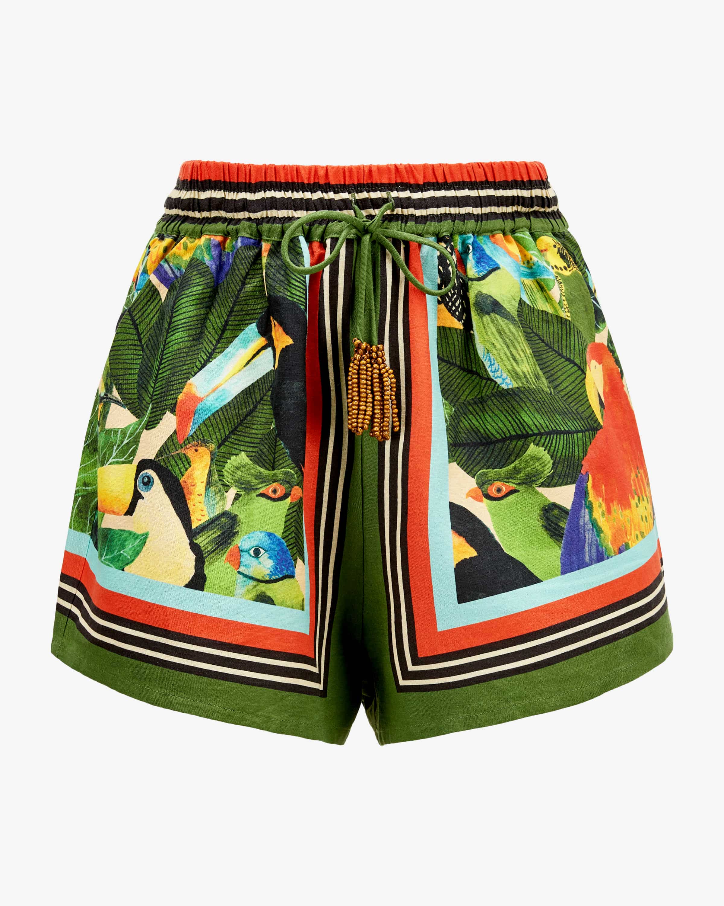 Shorts Bird Leaf for women from Farm Rio in green and colorful. The Brazilian brand is full of color, prints and joie de vivre. Inspired by the tropical attitude to life, it brings positive energy to the fashion world. The model inspires in a high-quality linen and viscose blend, while the colorful design creates a summery summery companion with a sense of style.