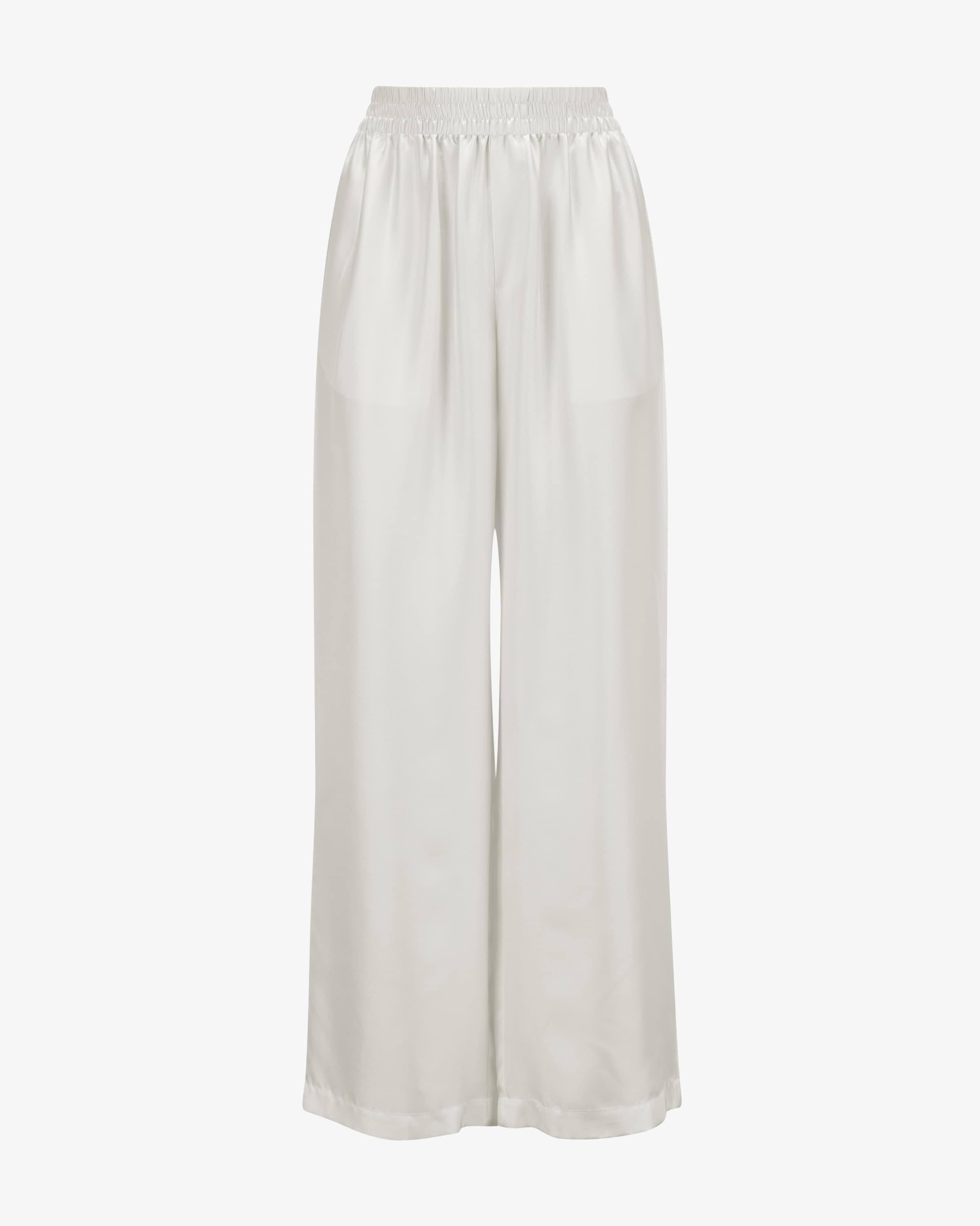 Women's trousers from Lisa Yang in meringue. With this wide-cut model, the Scandinavian the Scandinavian label presents a luxurious casual companion which, thanks to its which the pure silk quality gives a feminine lightness and iridescent look. look. The elasticated waistband also ensures additional comfort.