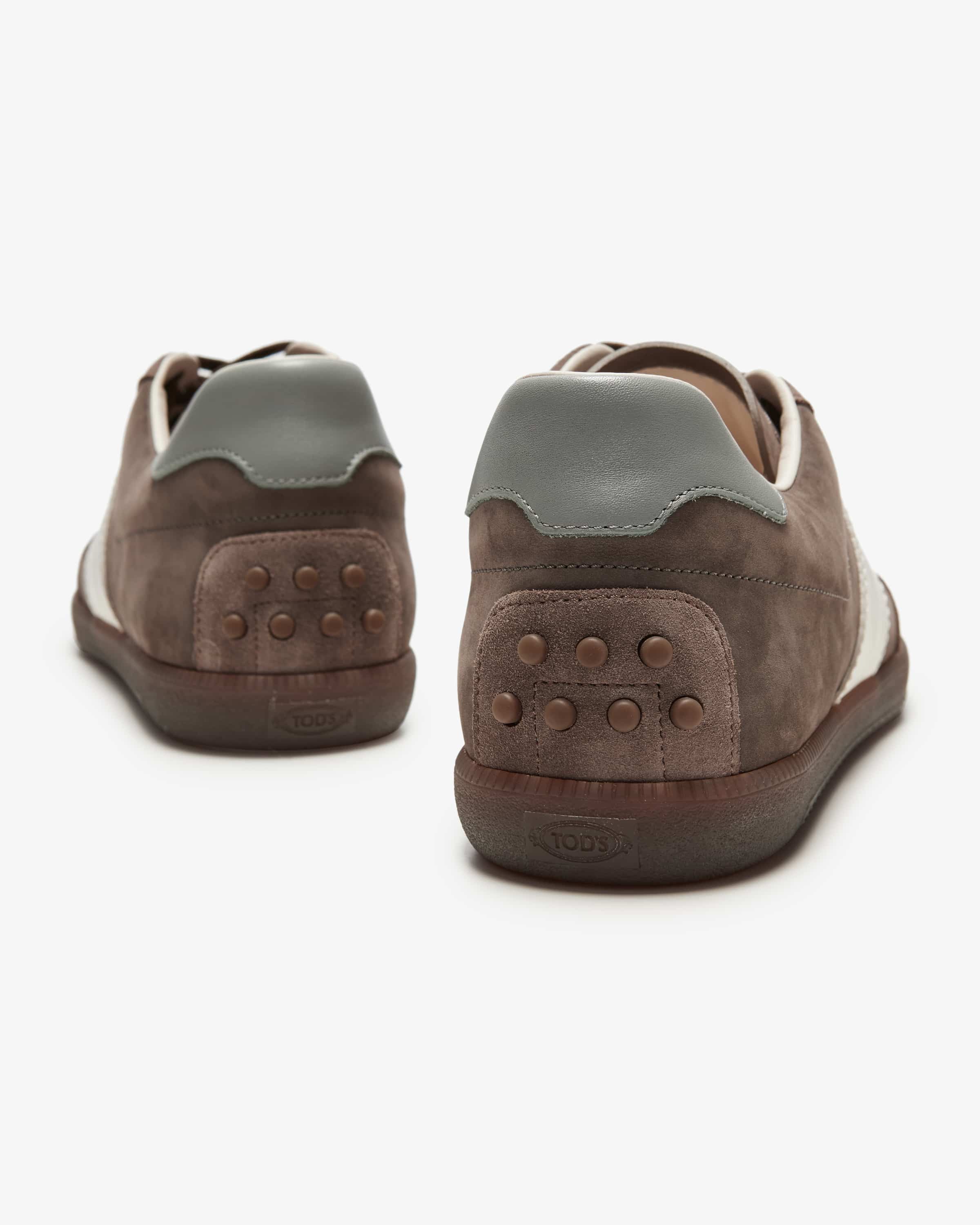 Sneakers for men from Tod's in brown, white and gray. The Italian luxury house stands for the finest leather craftsmanship - loafers and bags are particularly iconic. This model stands out thanks to the slim retro silhouette and the leather mix with nubuck leather and suede elements, this model is a fashionable casual companion, which is characteristically accentuated by the iconic studs on the heel. is characteristically set off by the iconic studs on the heel.
