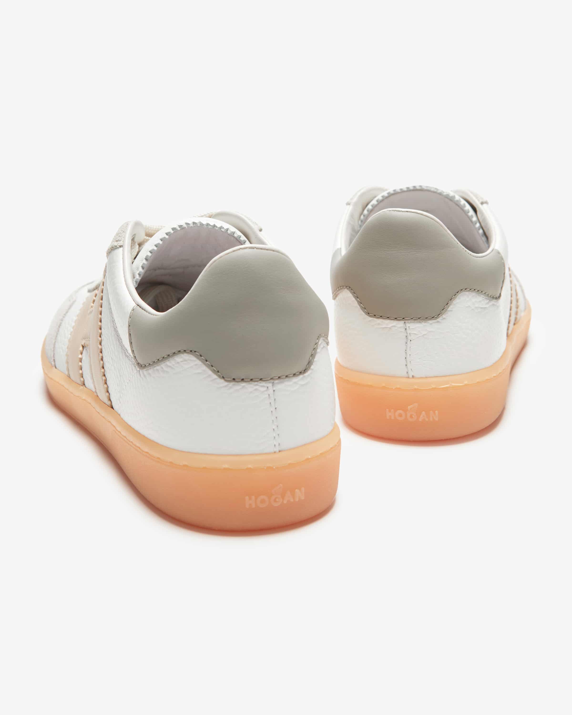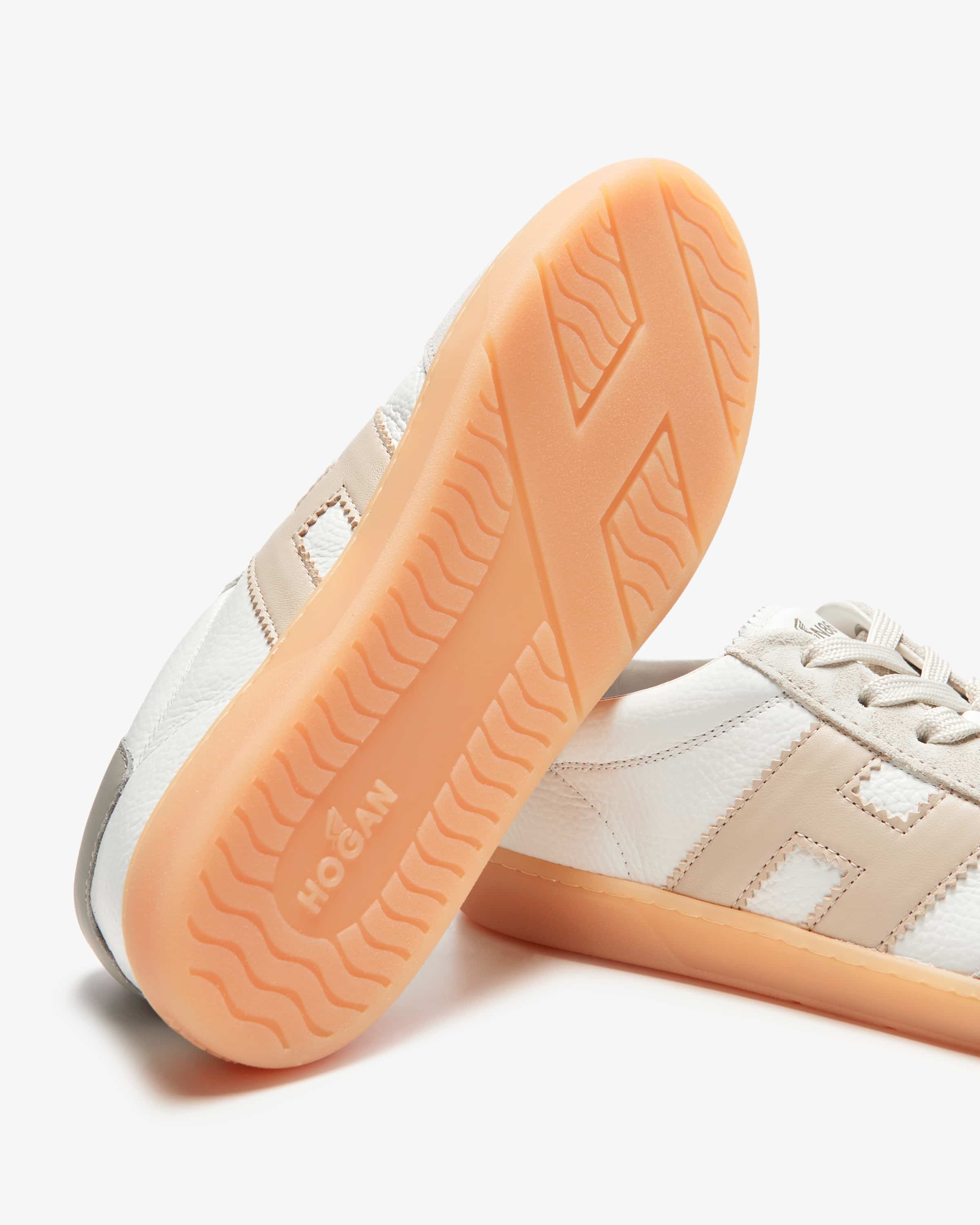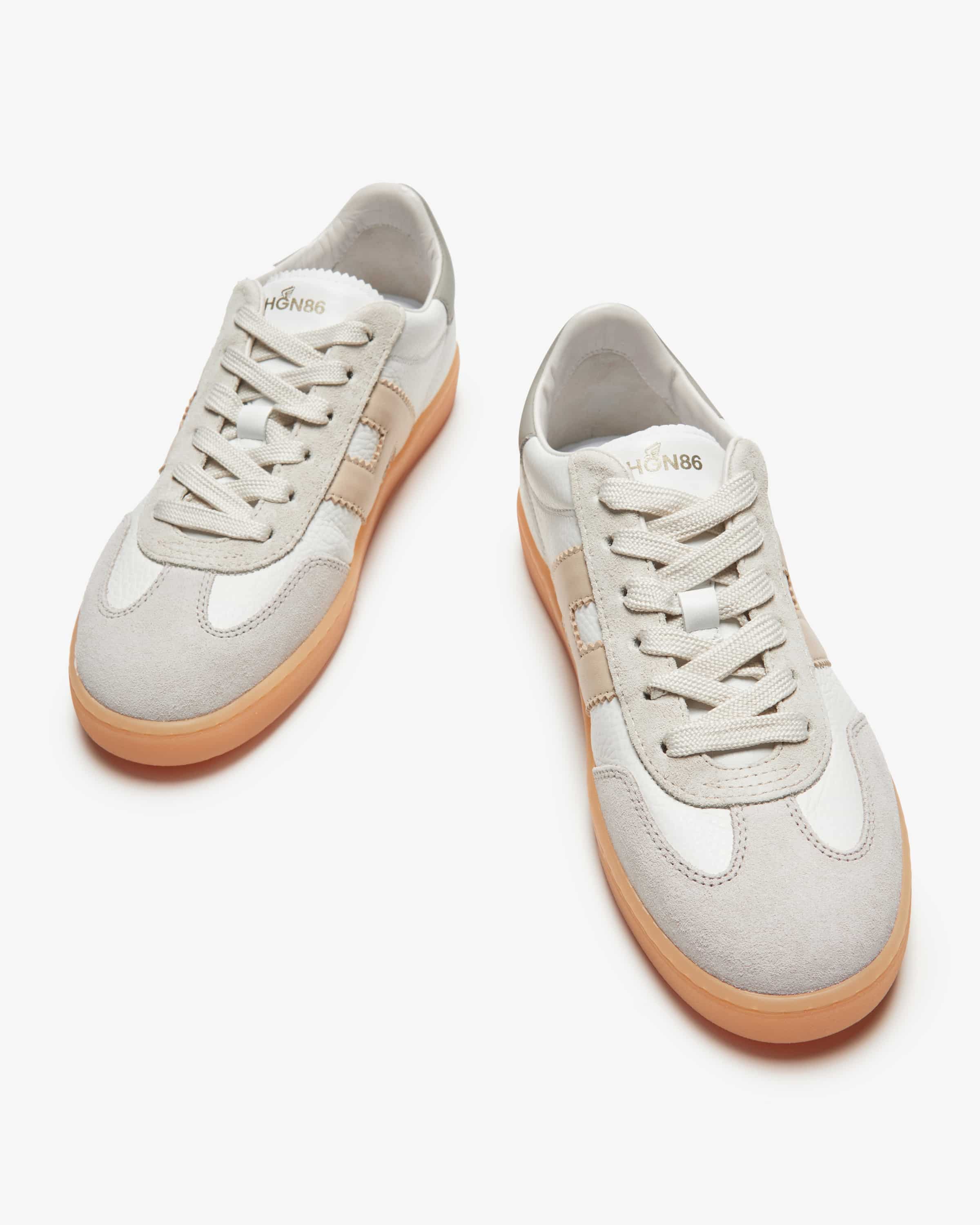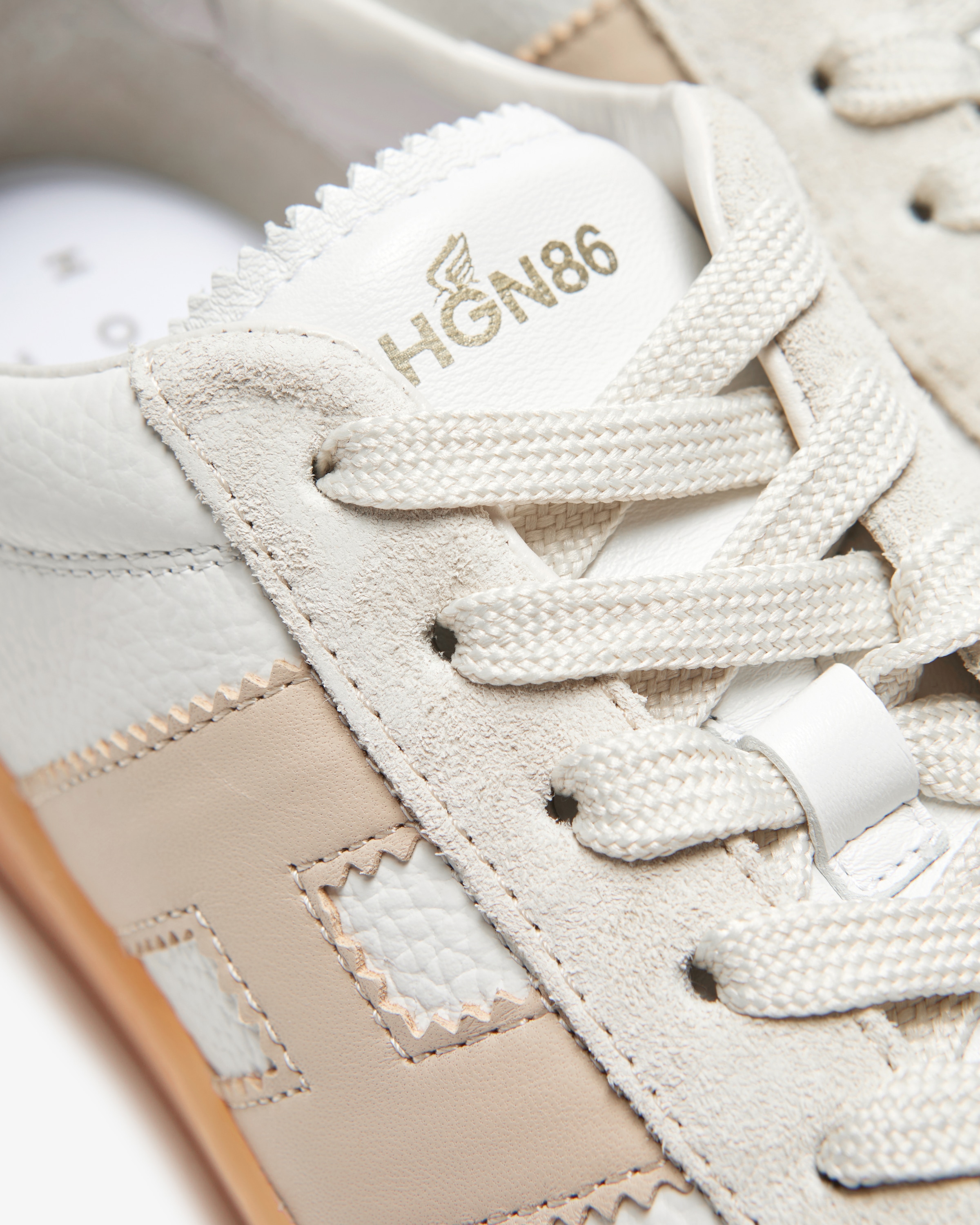 Cool sneakers for women from Hogan in white, sage and beige. The model is characterized characterized by the harmonious blend of retro elements and modern lines, which is skillfully underlined thanks to the contrasting leather mix. At the same time, the softly padded memory foam insole ensures a particularly high level of comfort. wearing comfort.