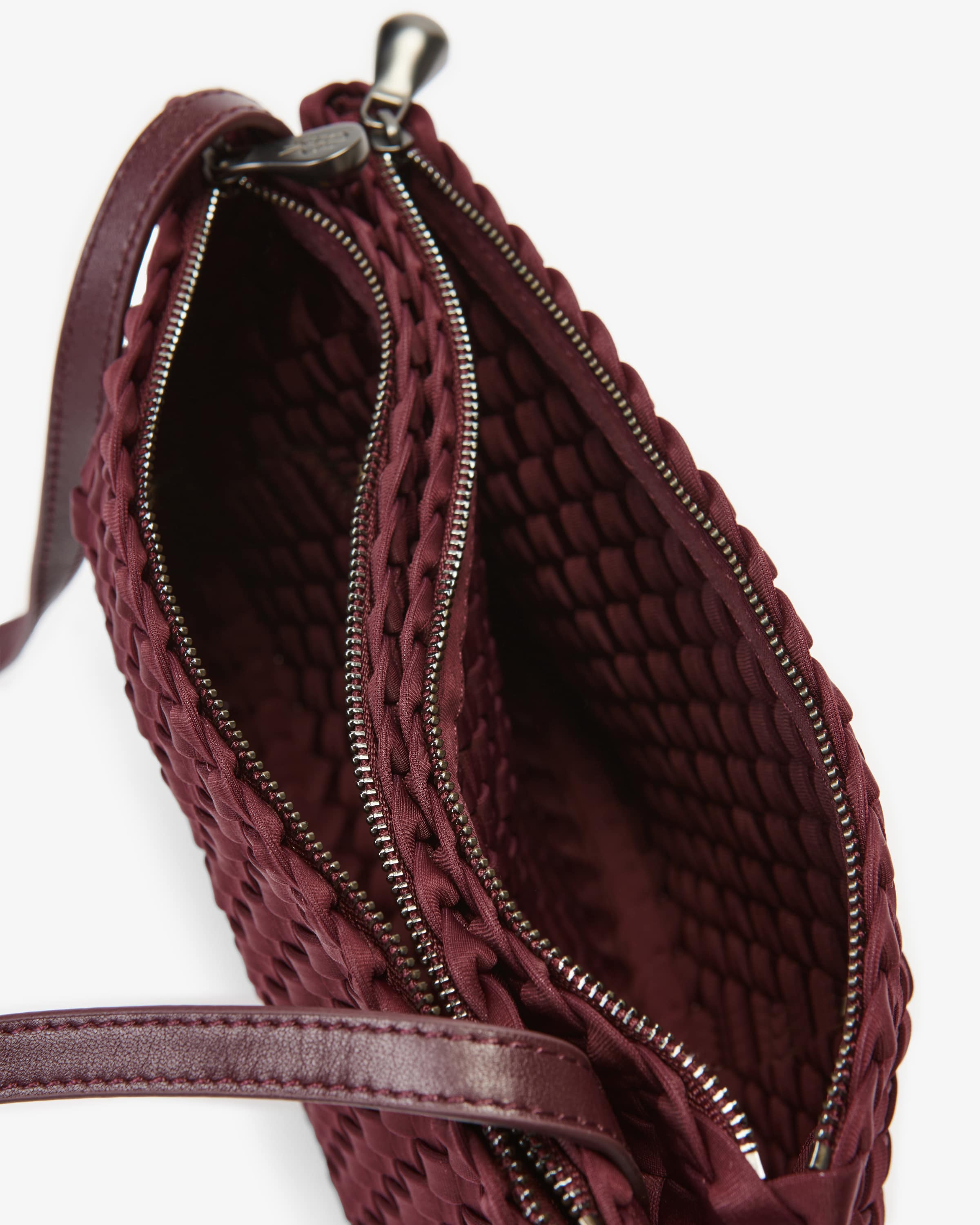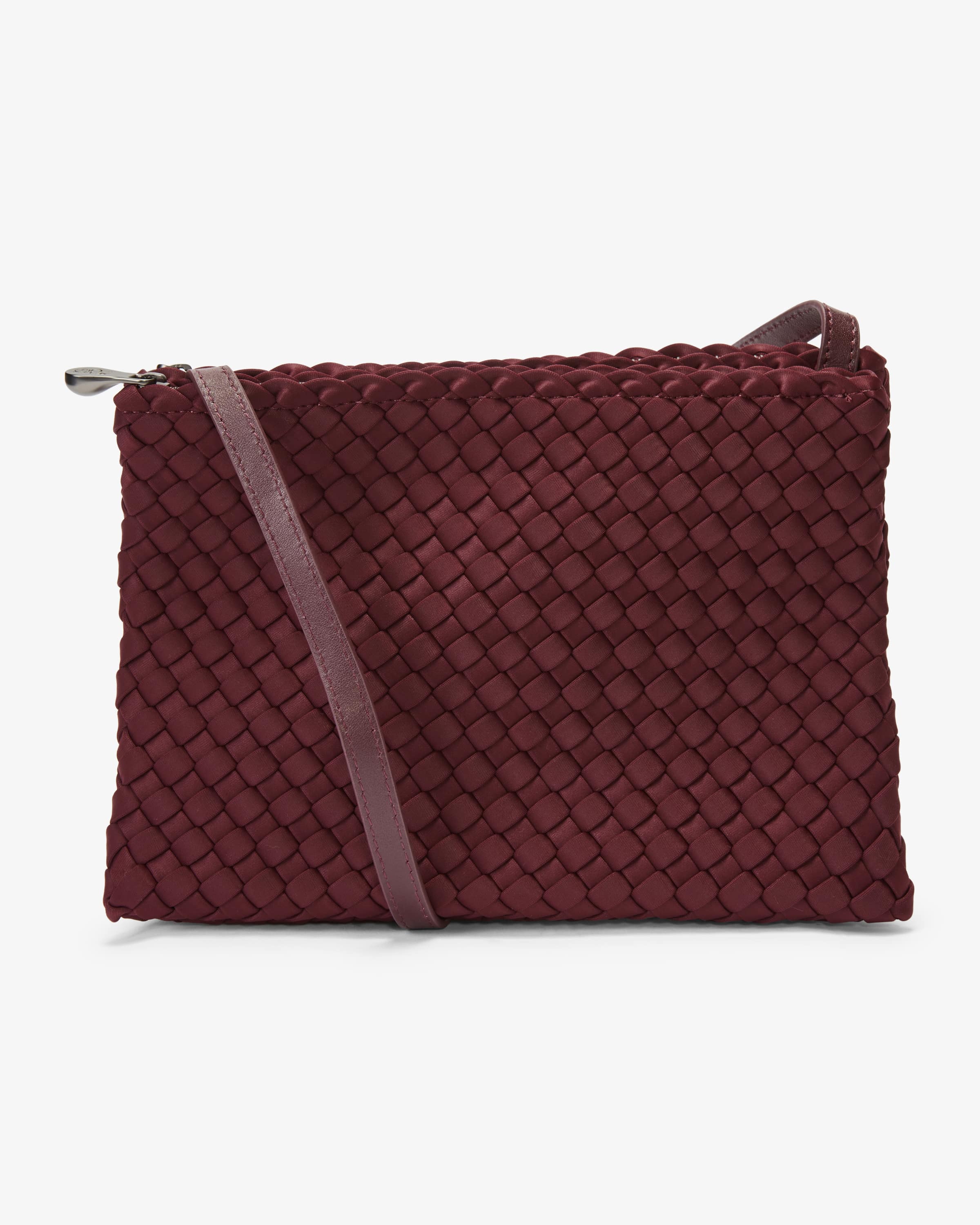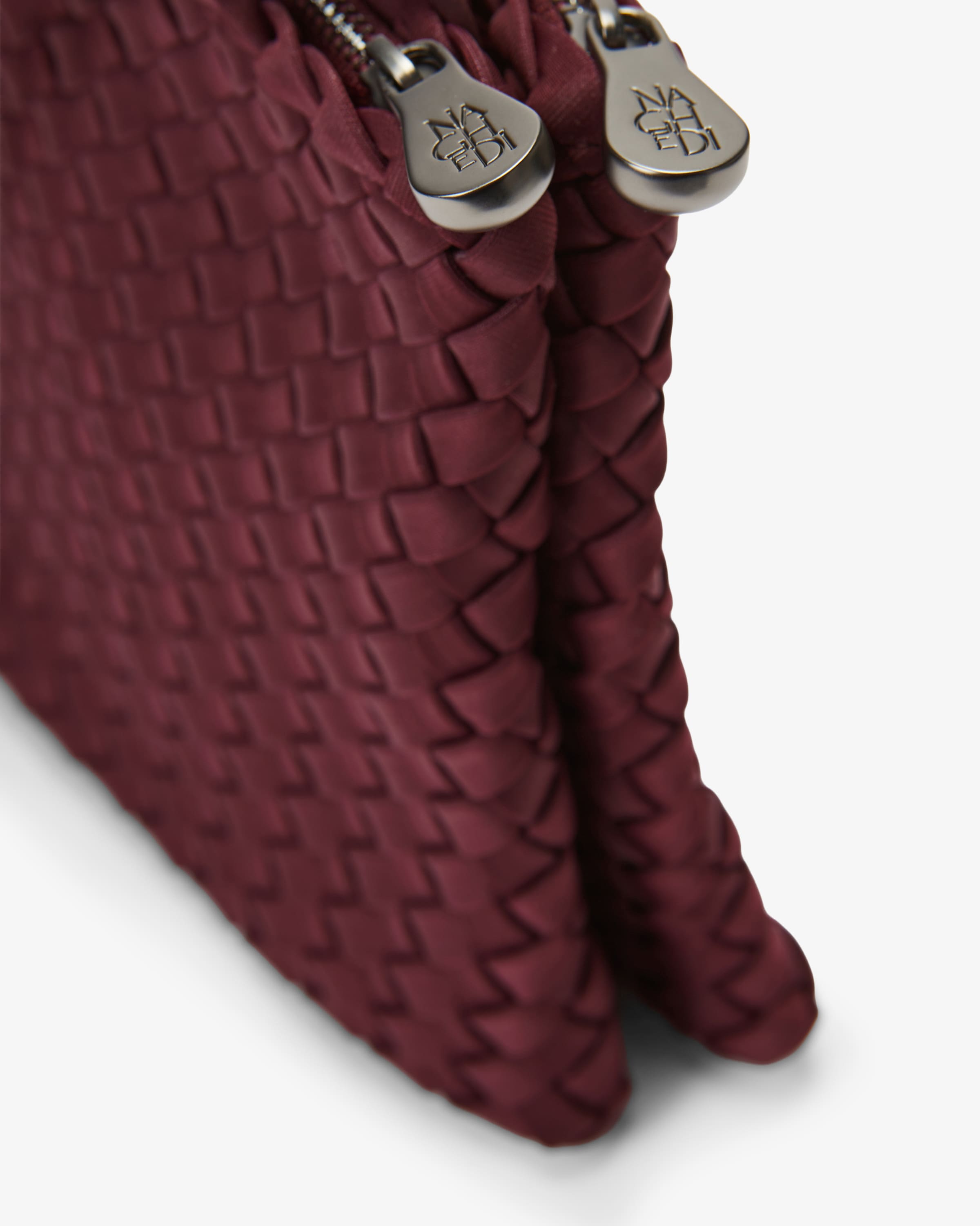 Soho Medium Messenger shoulder bag for women from Naghedi in Bordeaux. This textile model presents itself in a subtly iridescent look and elegant braided while the double-layered design with two identical, flat zipper pockets zipperedpockets creates a sophisticated and practical companion. created.