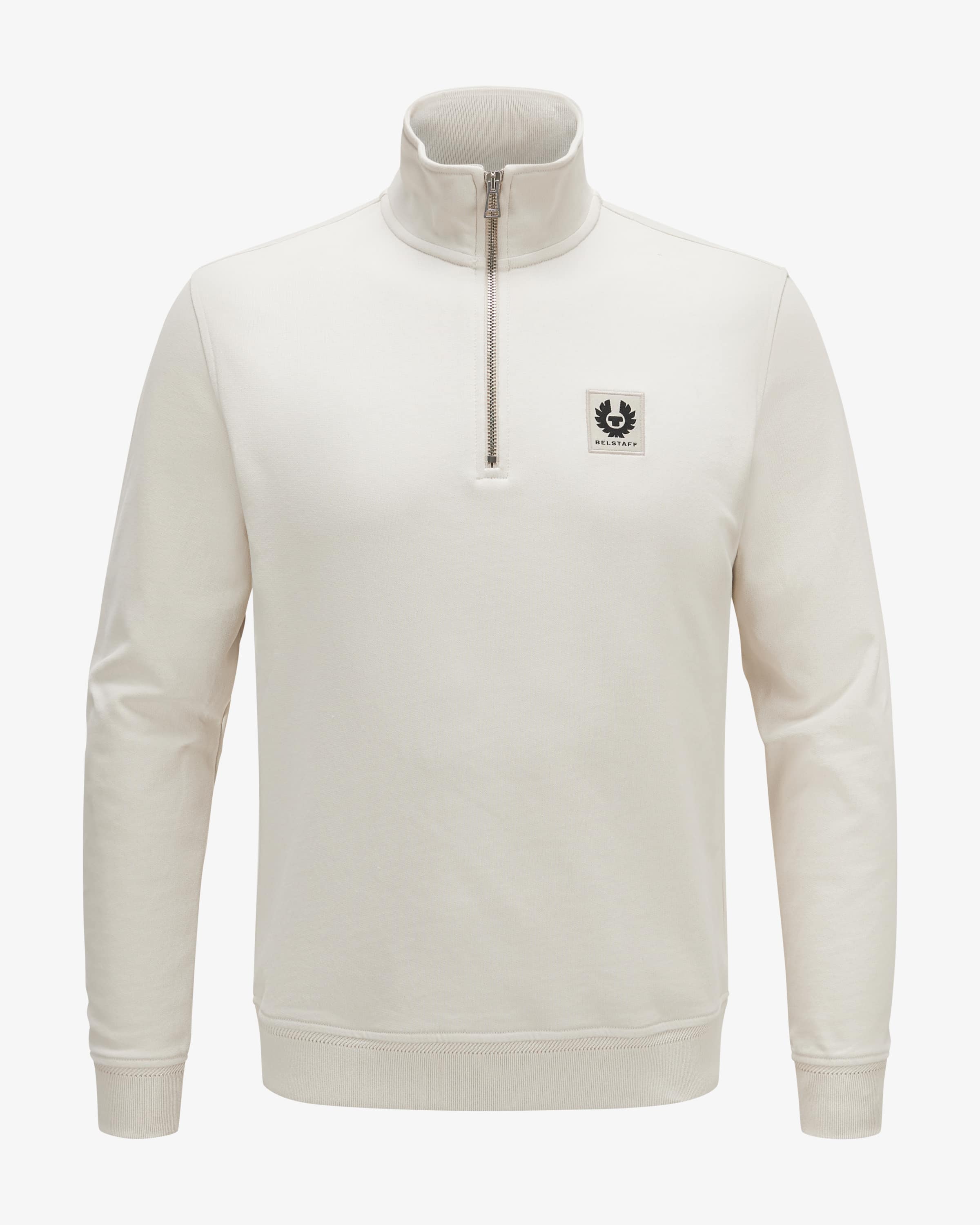 Sweat Troyer Quarter for men from Belstaff in cream. Belstaff is known for biker jackets and heritage outerwear - robust, British, iconic. This model also impresses with its soft sweat fabric and typical label logo details, while the casual silhouette with a troyer collar and rib-knit cuffs creates a creates a masculine, sporty casual look.