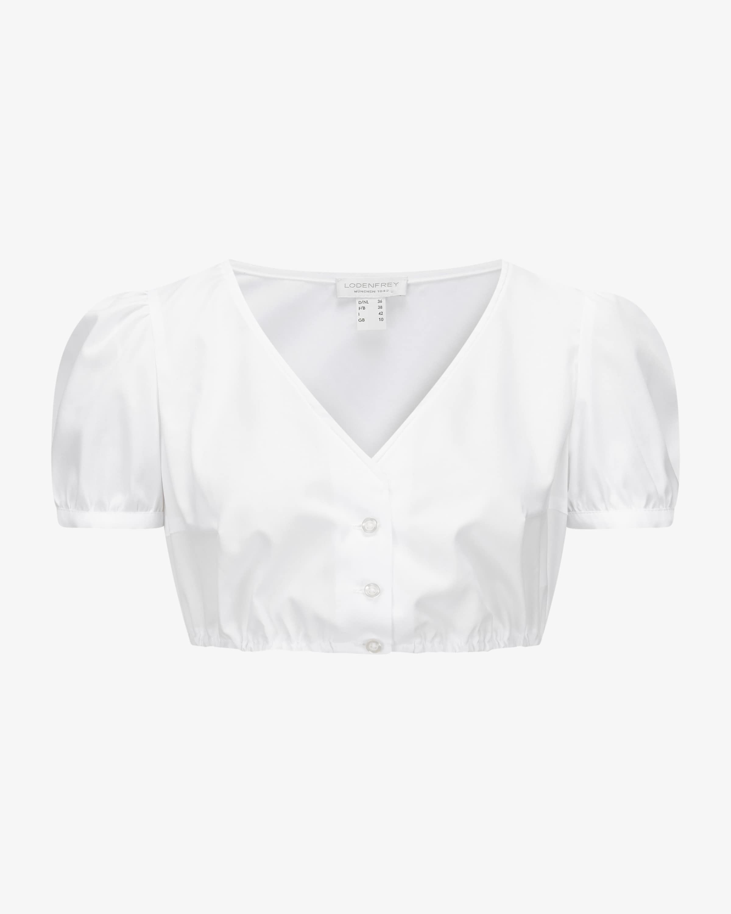 Tanja dirndl blouse for women from LODENFREY Munich 1842 in white. The traditional short-sleeved model impresses with its simple design with discreet puffed sleeves, making it a versatile dirndl companion.
