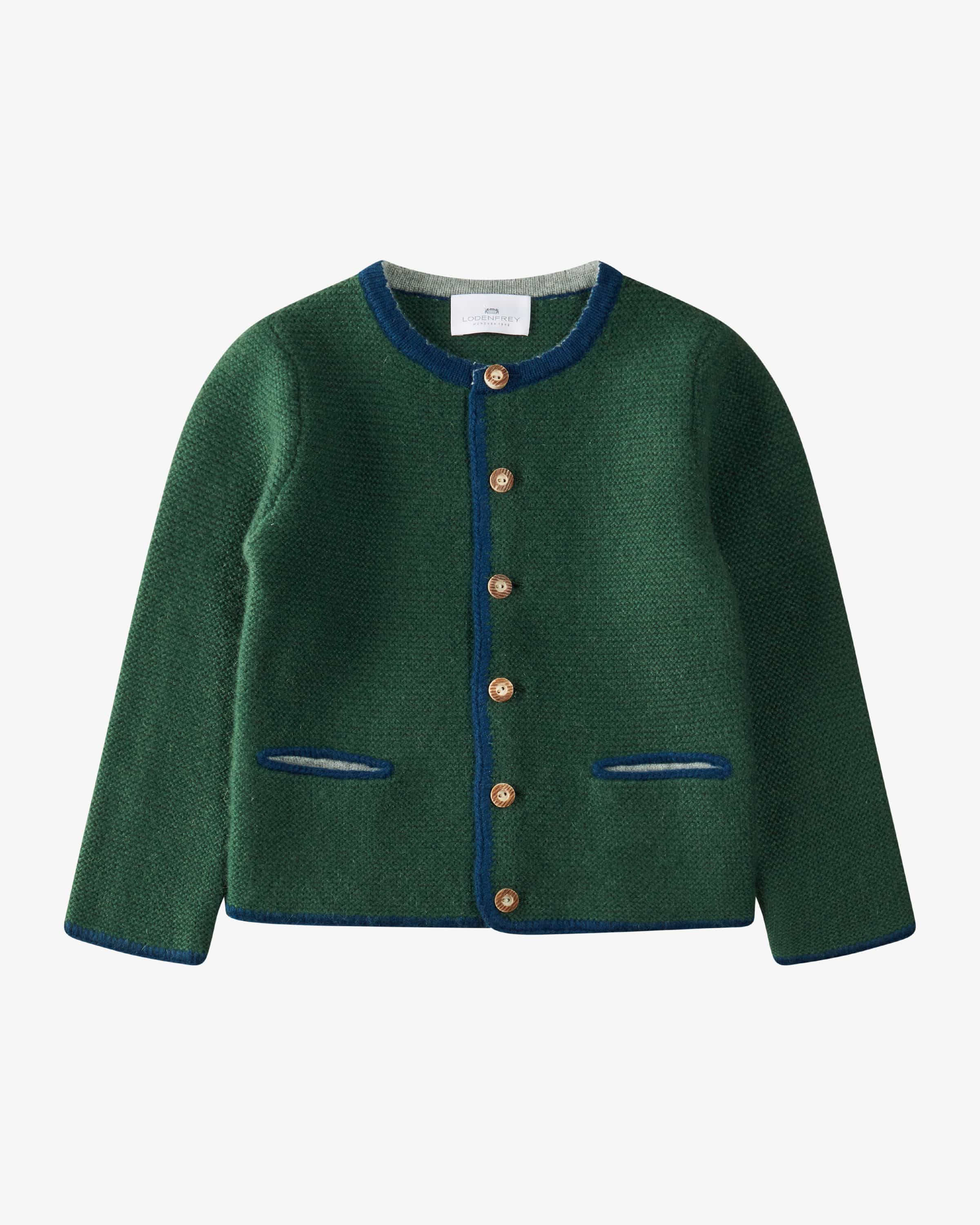 Traditional cashmere cardigan for boys from LODENFREY in dark green and blue. Spoil your child with soft cashmere fabrication and a particularly pleasant feel, while the traditional the traditional knit design with contrasting colored edges creates a stylish a stylish companion.