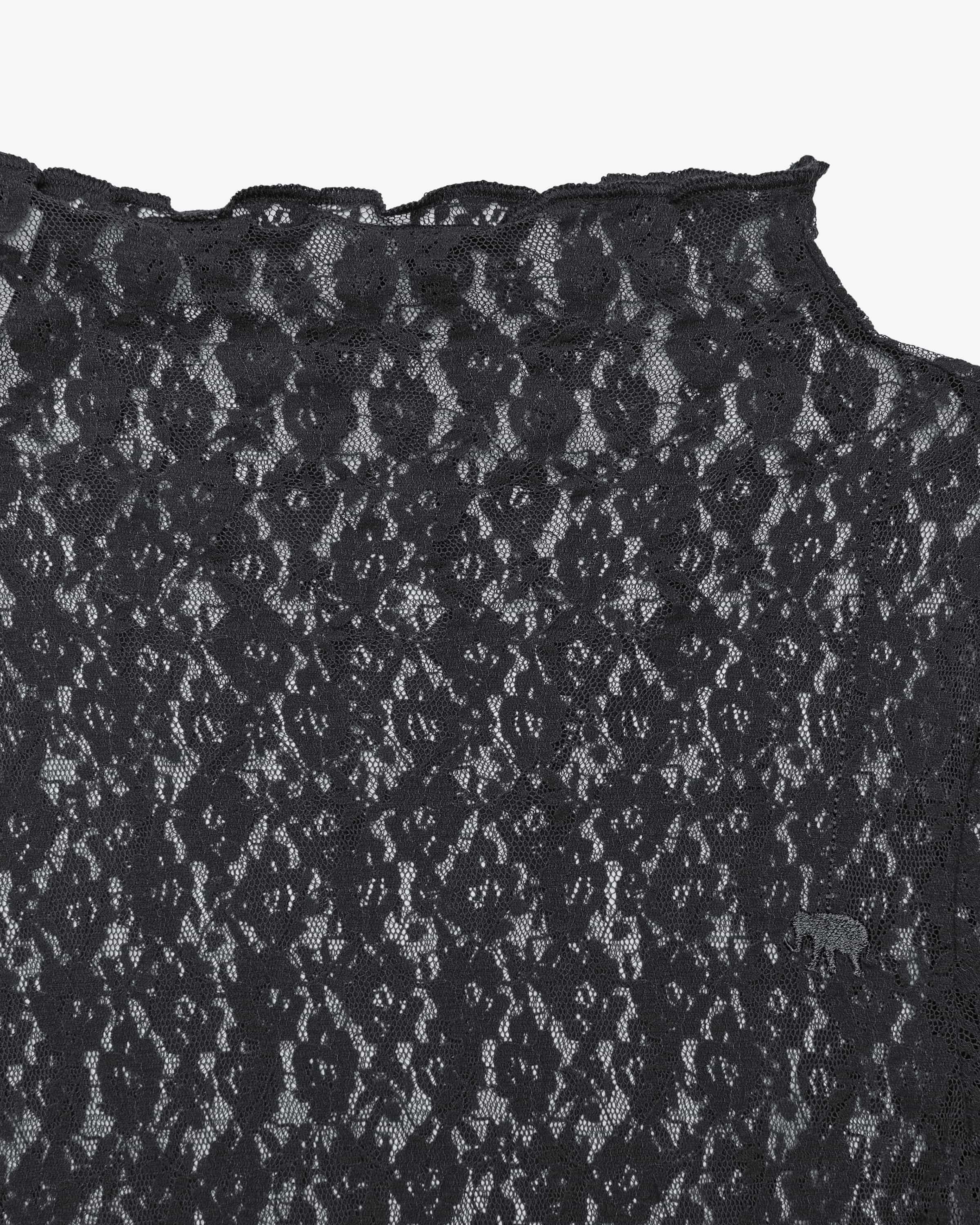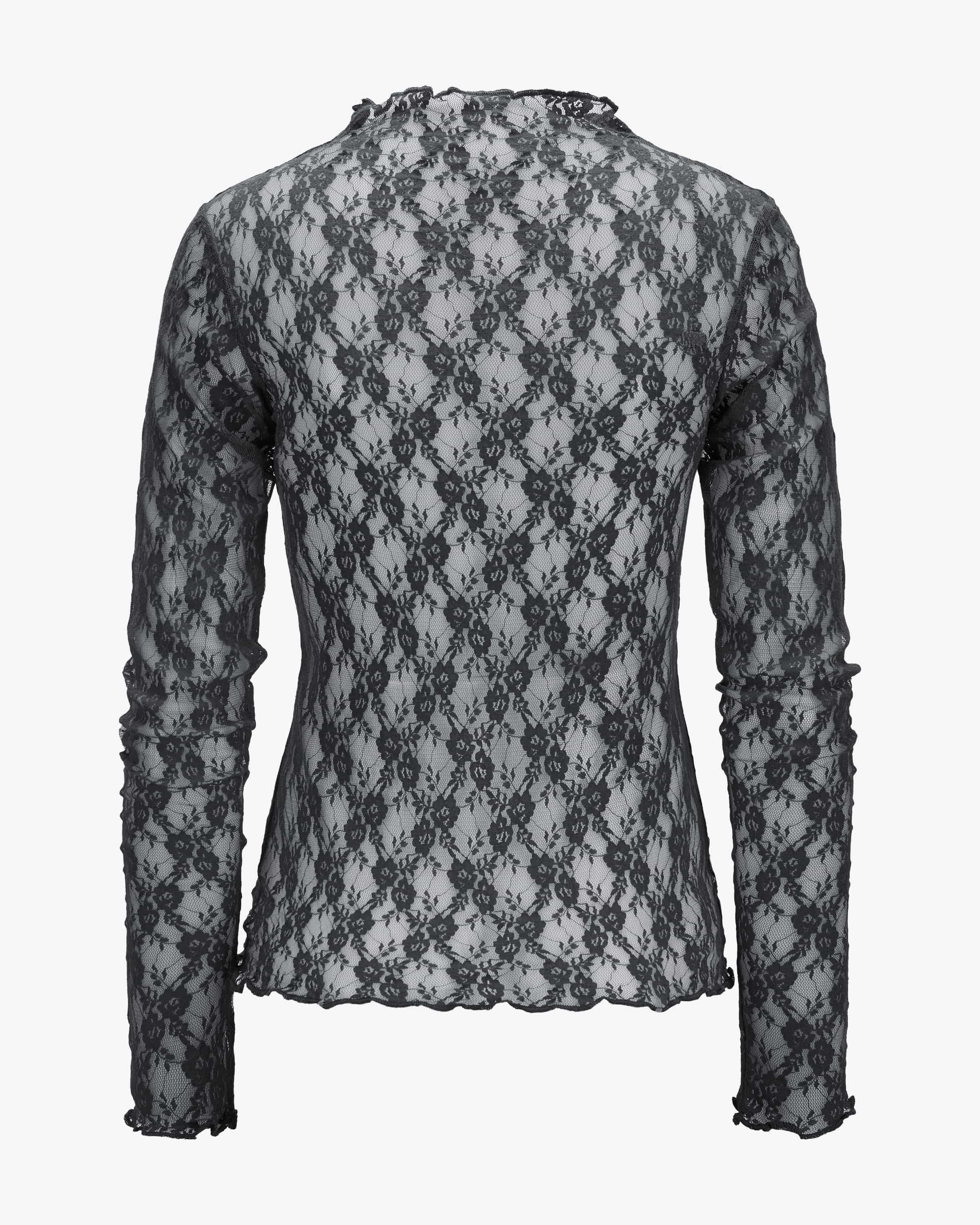 Yulara lace shirt for women from Love Joy Victory in dark gray. A combination of design standards with a real sense of responsibility - the brand stands for sustainable activewear and casual fashion. This slim fit model style is a feminine highlight thanks to its semi-transparent lace design with a scalloped hem and subtle stand-up collar make it a feminine highlight.